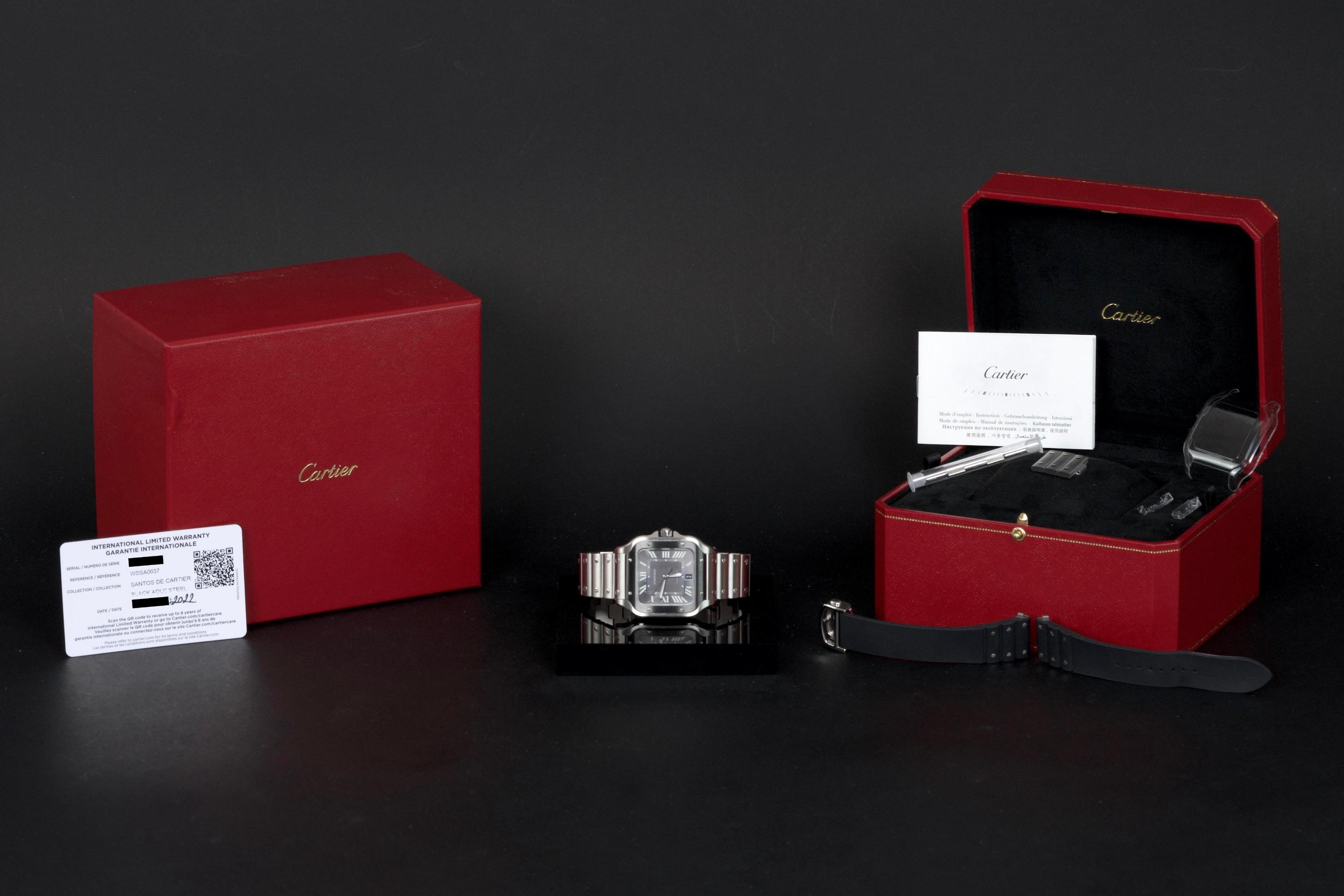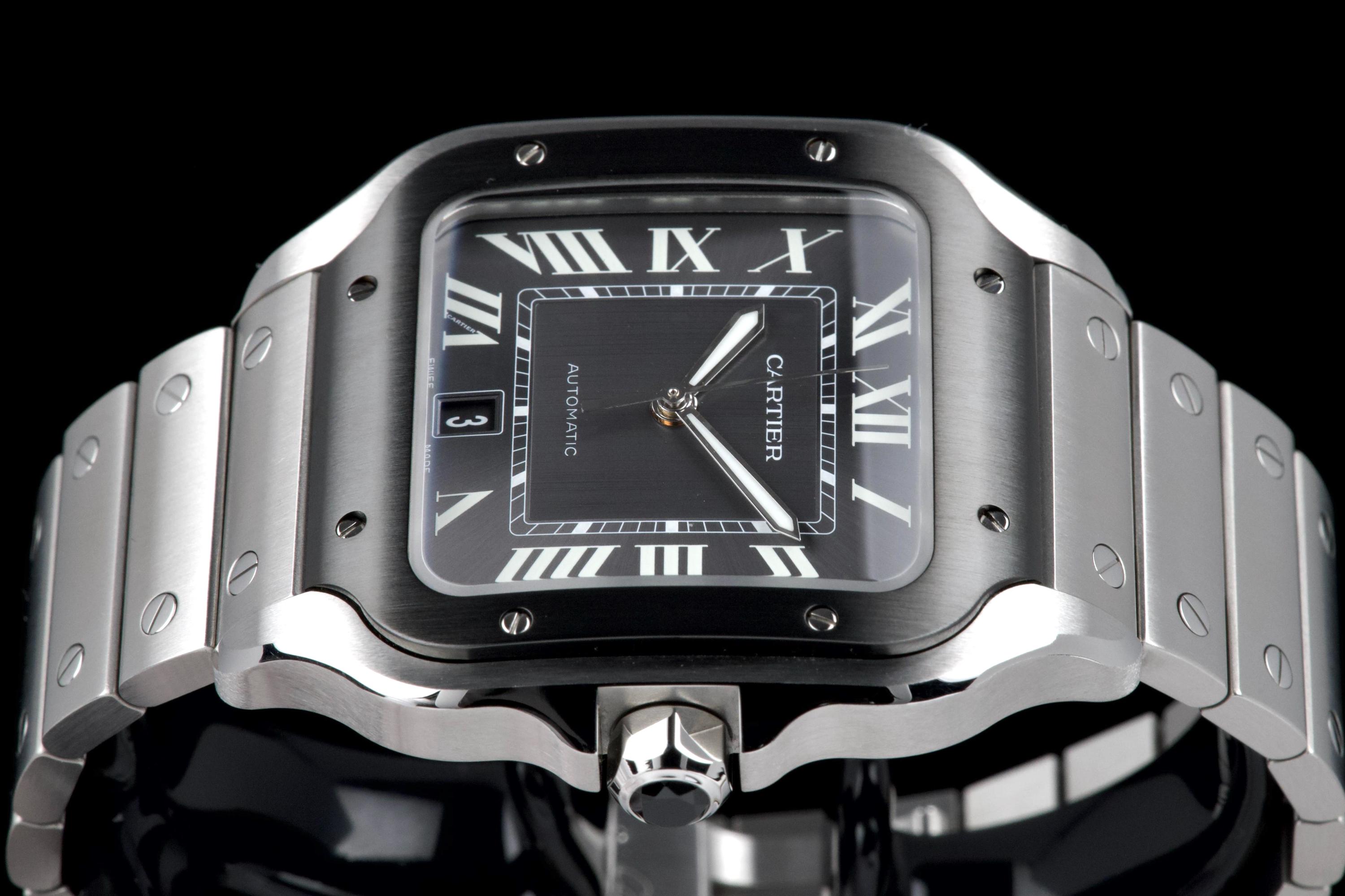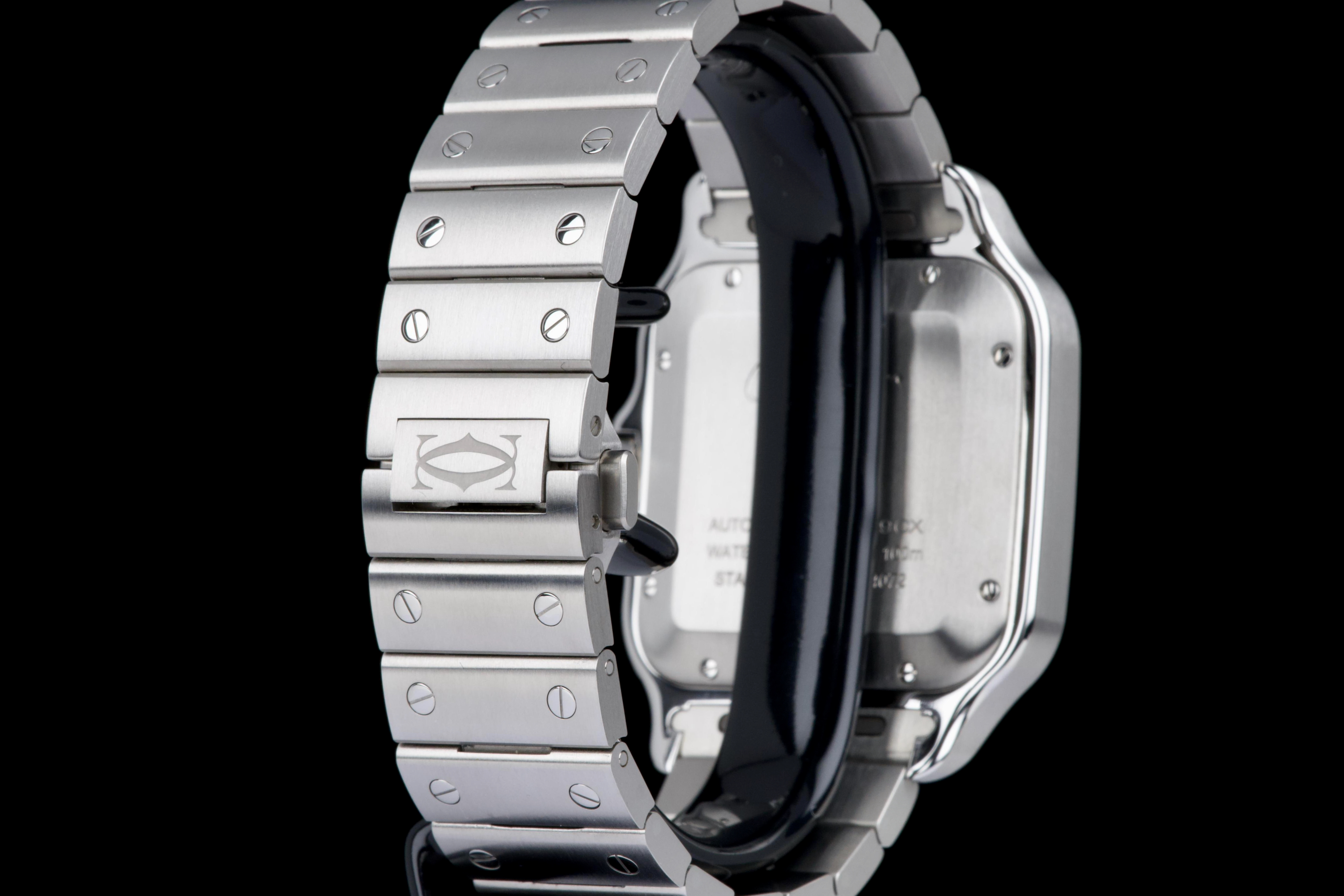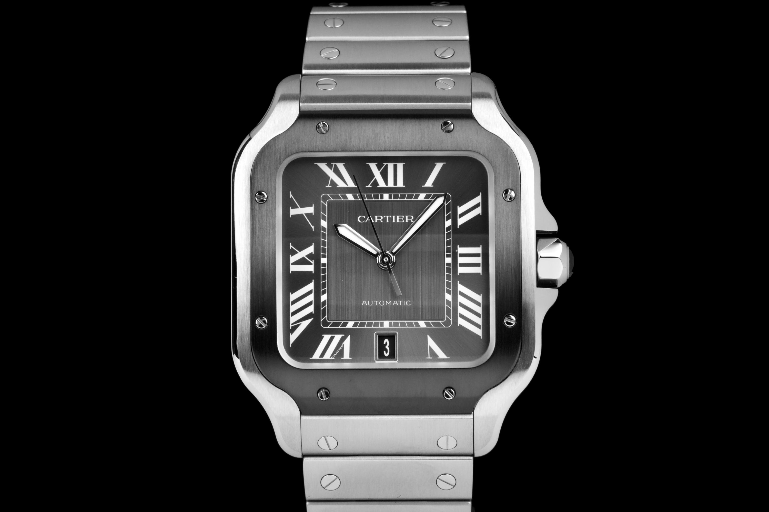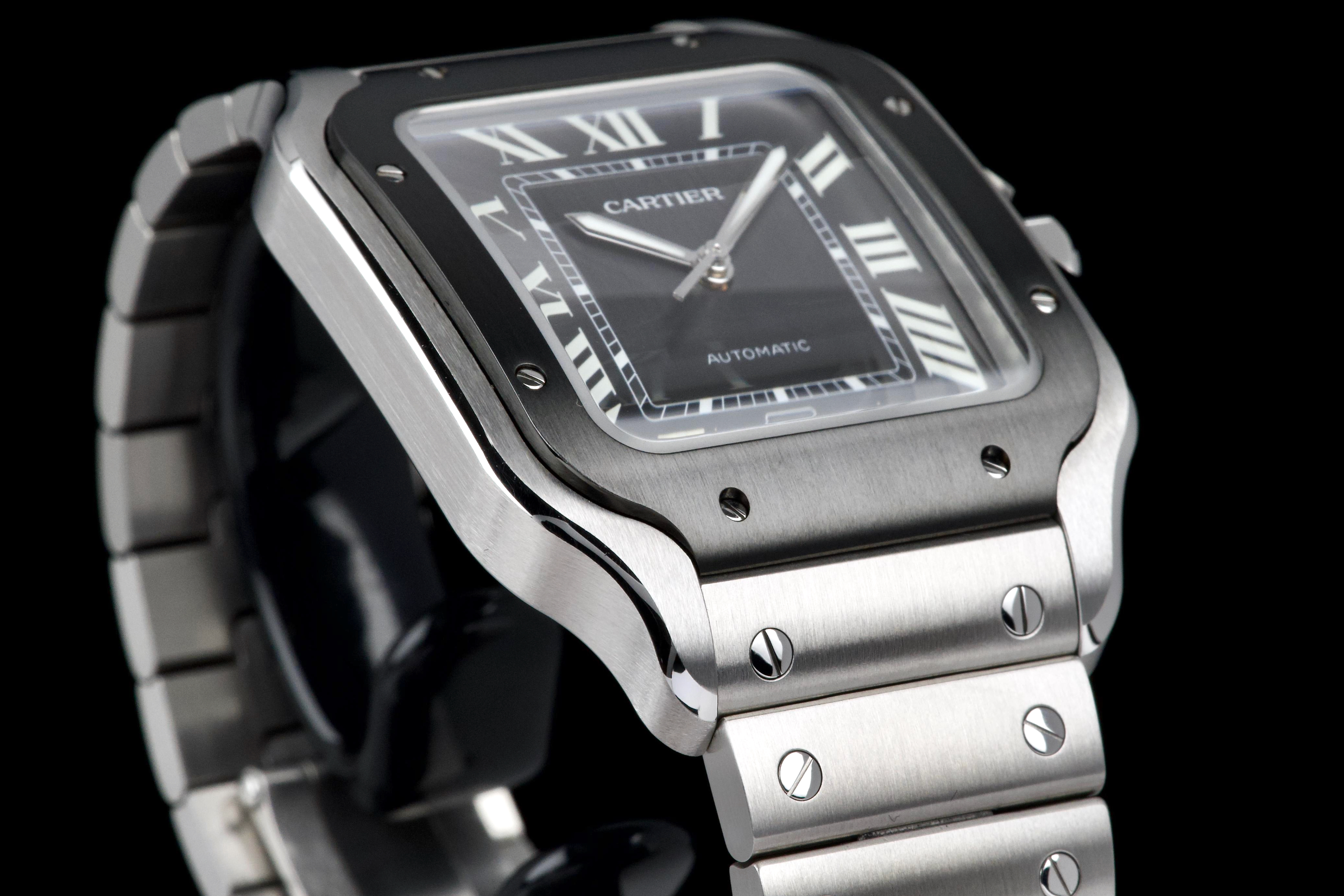 The present Cartier Santos reference WSSA0037, offered as a complete full set and dating to 2022, is an elegant and contemporary example of one of Cartier’s most iconic and historically significant designs. Presented in the Large size and powered by an automatic movement, this model combines modern versatility with the unmistakable character of the Santos line. This example comes directly from its original owner and has been gently used, remaining in very attractive overall condition. The stainless-steel case and bracelet display only light signs of wear consistent with careful use, while retaining the clean lines and refined finishing that define the model. The distinctive grey dial adds a sophisticated and modern touch to the classic Santos aesthetic, offering excellent legibility and a subtle contrast to the polished bezel and integrated bracelet. The watch benefits from Cartier’s quick-change bracelet system, enhancing everyday practicality and ease of wear. Delivered as a full set from 2022, this Santos WSSA0037 represents a compelling opportunity to acquire a modern Cartier icon with clear provenance, timeless design, and immediate wearability.