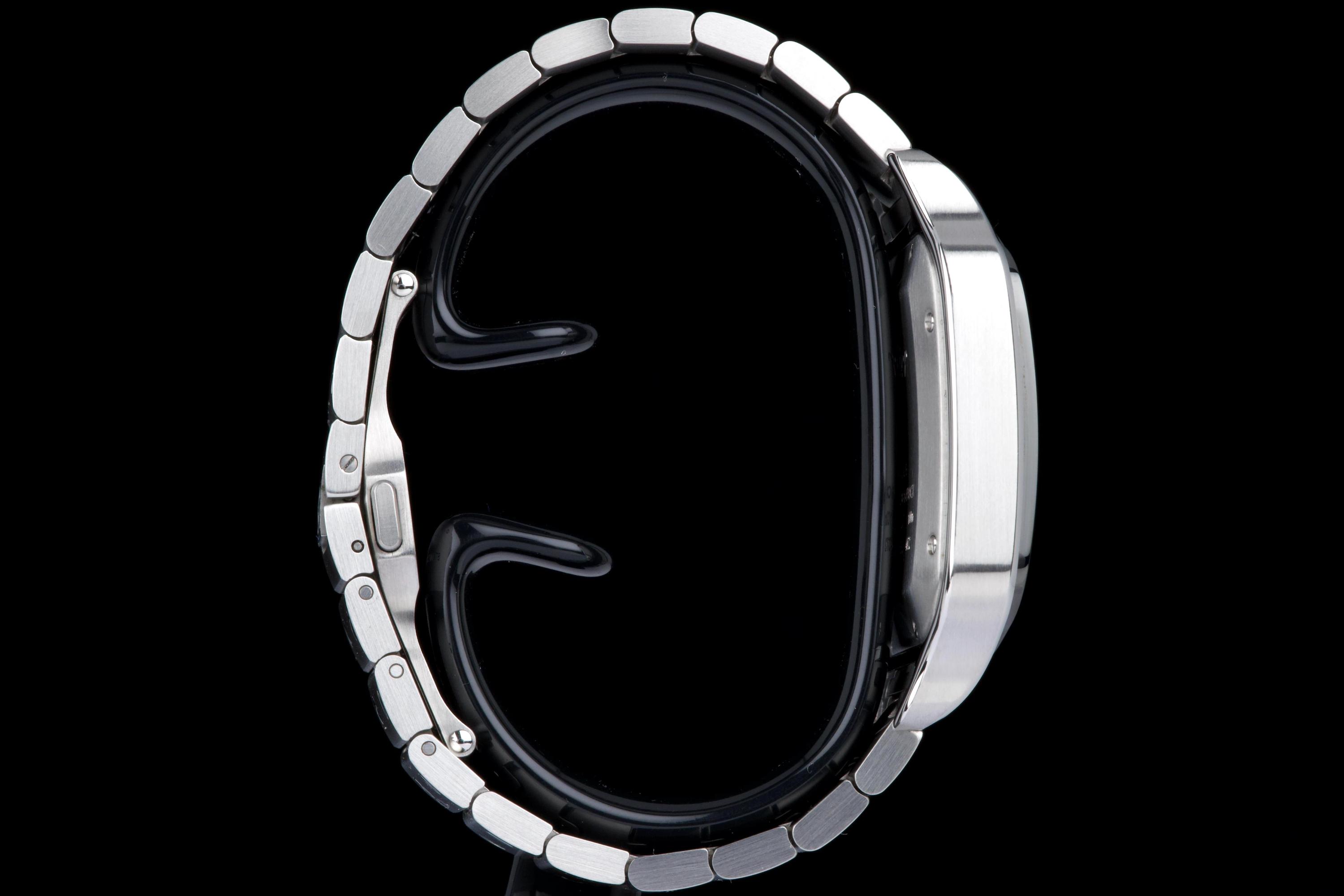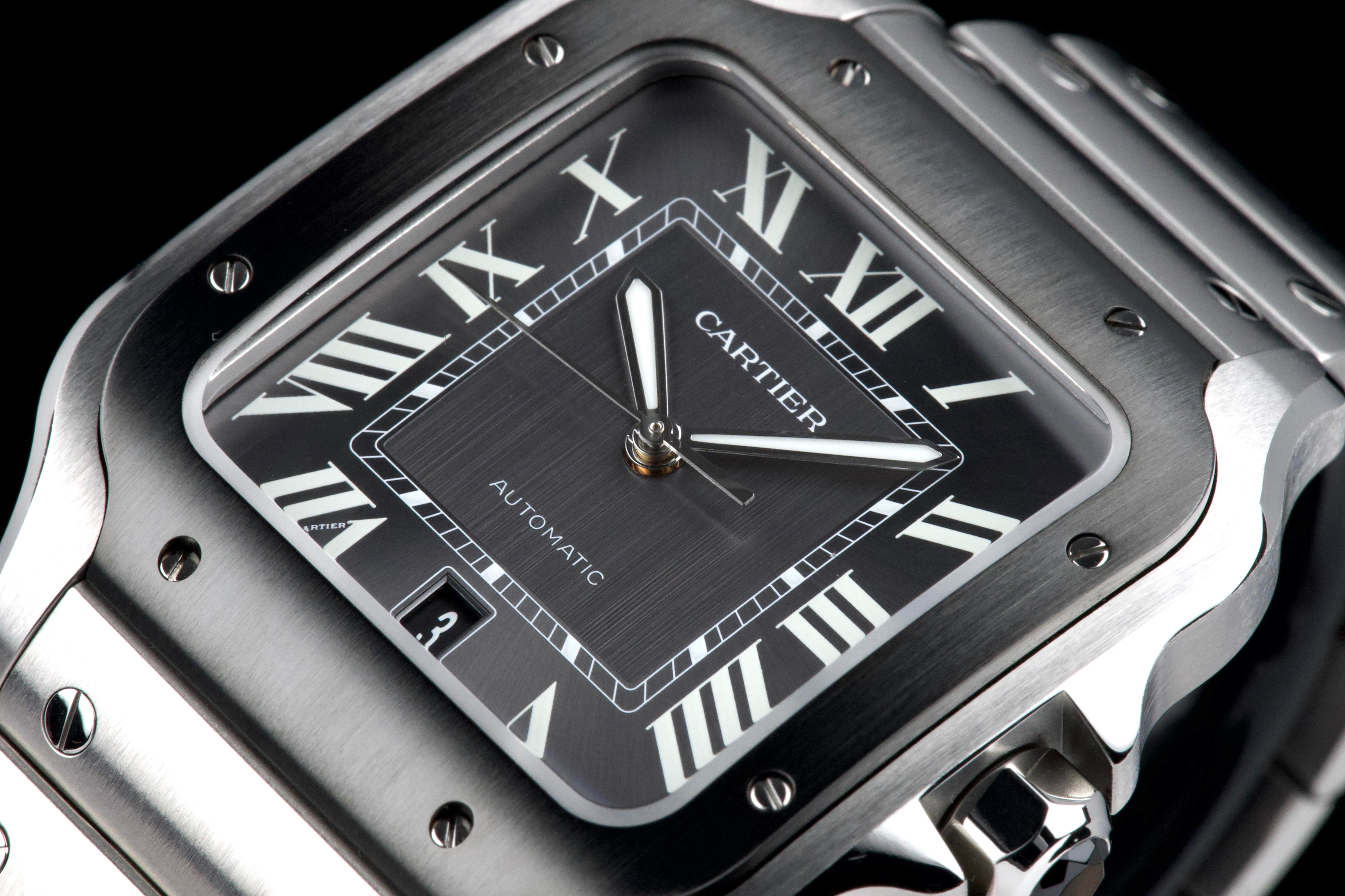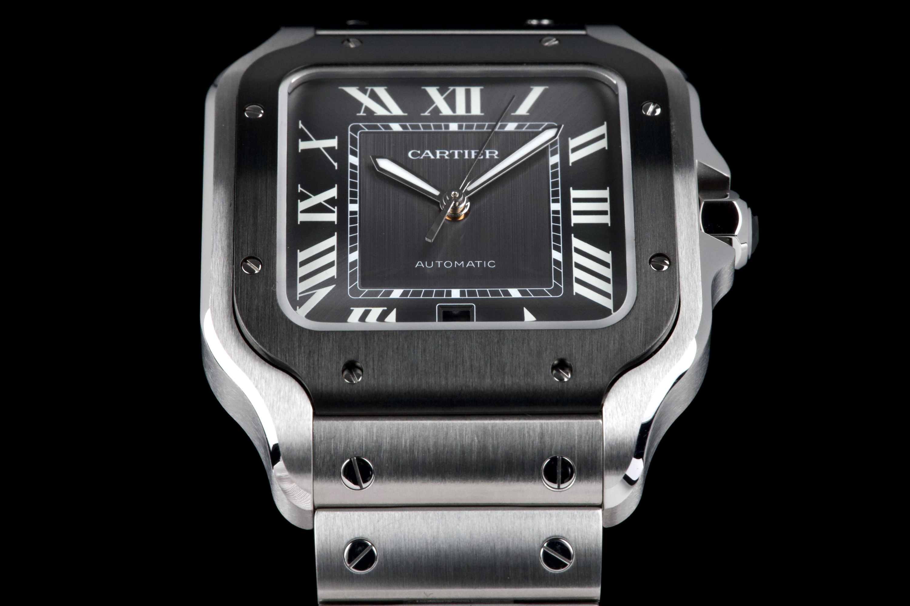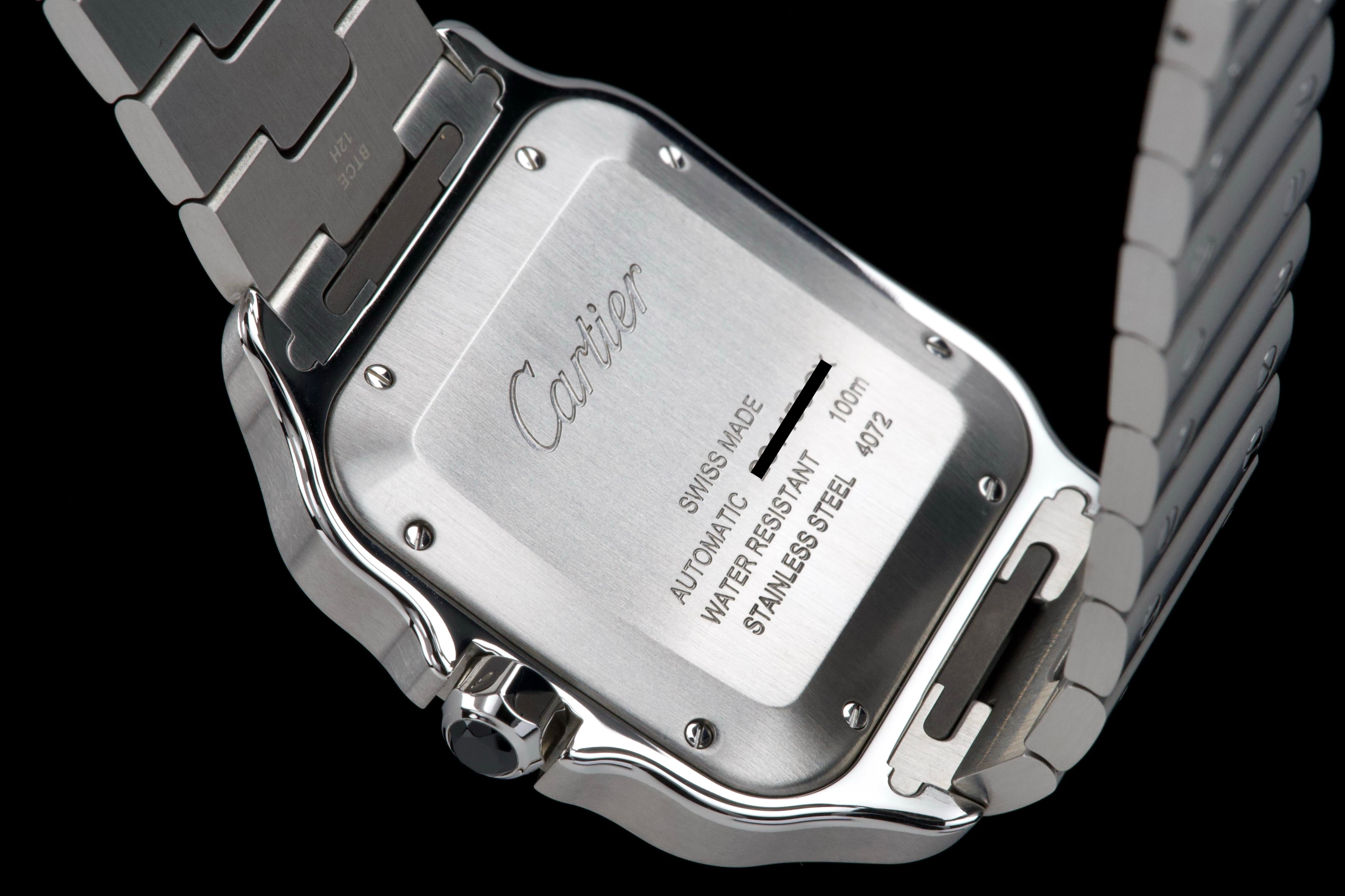 The present Cartier Santos reference WSSA0037, offered as a complete full set and dating to 2022, is an elegant and contemporary example of one of Cartier’s most iconic and historically significant designs. Presented in the Large size and powered by an automatic movement, this model combines modern versatility with the unmistakable character of the Santos line. This example comes directly from its original owner and has been gently used, remaining in very attractive overall condition. The stainless-steel case and bracelet display only light signs of wear consistent with careful use, while retaining the clean lines and refined finishing that define the model. The distinctive grey dial adds a sophisticated and modern touch to the classic Santos aesthetic, offering excellent legibility and a subtle contrast to the polished bezel and integrated bracelet. The watch benefits from Cartier’s quick-change bracelet system, enhancing everyday practicality and ease of wear. Delivered as a full set from 2022, this Santos WSSA0037 represents a compelling opportunity to acquire a modern Cartier icon with clear provenance, timeless design, and immediate wearability.