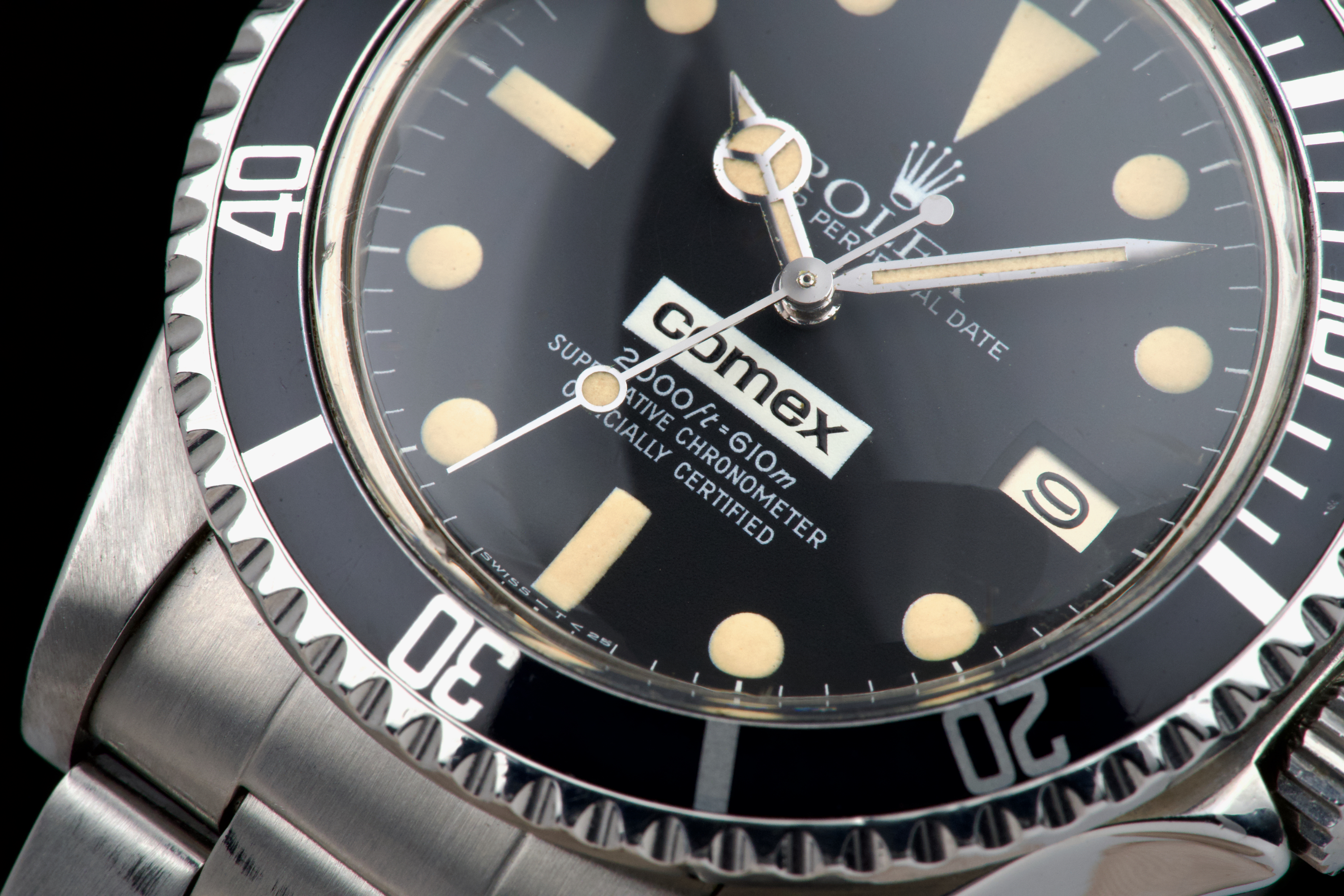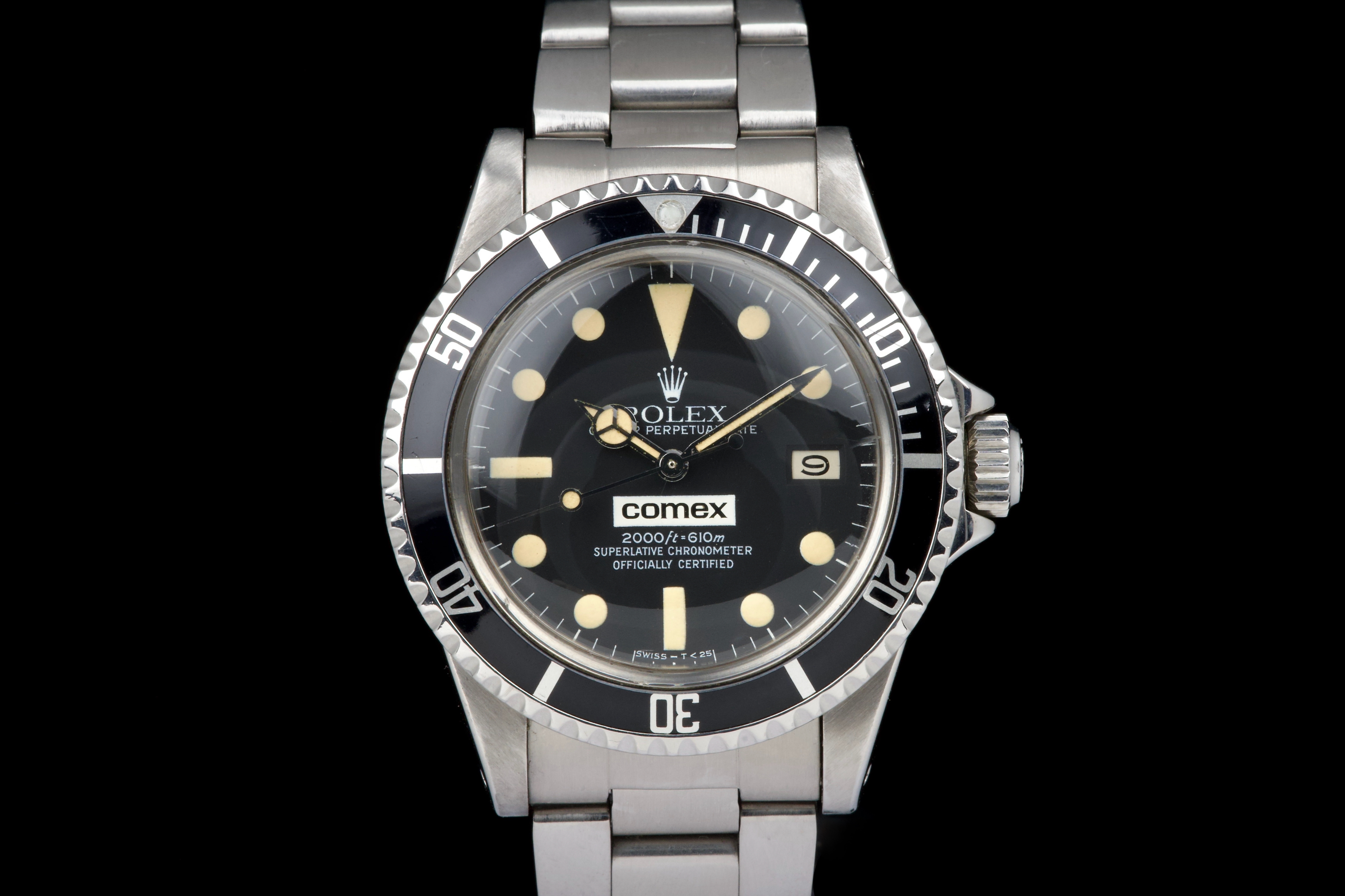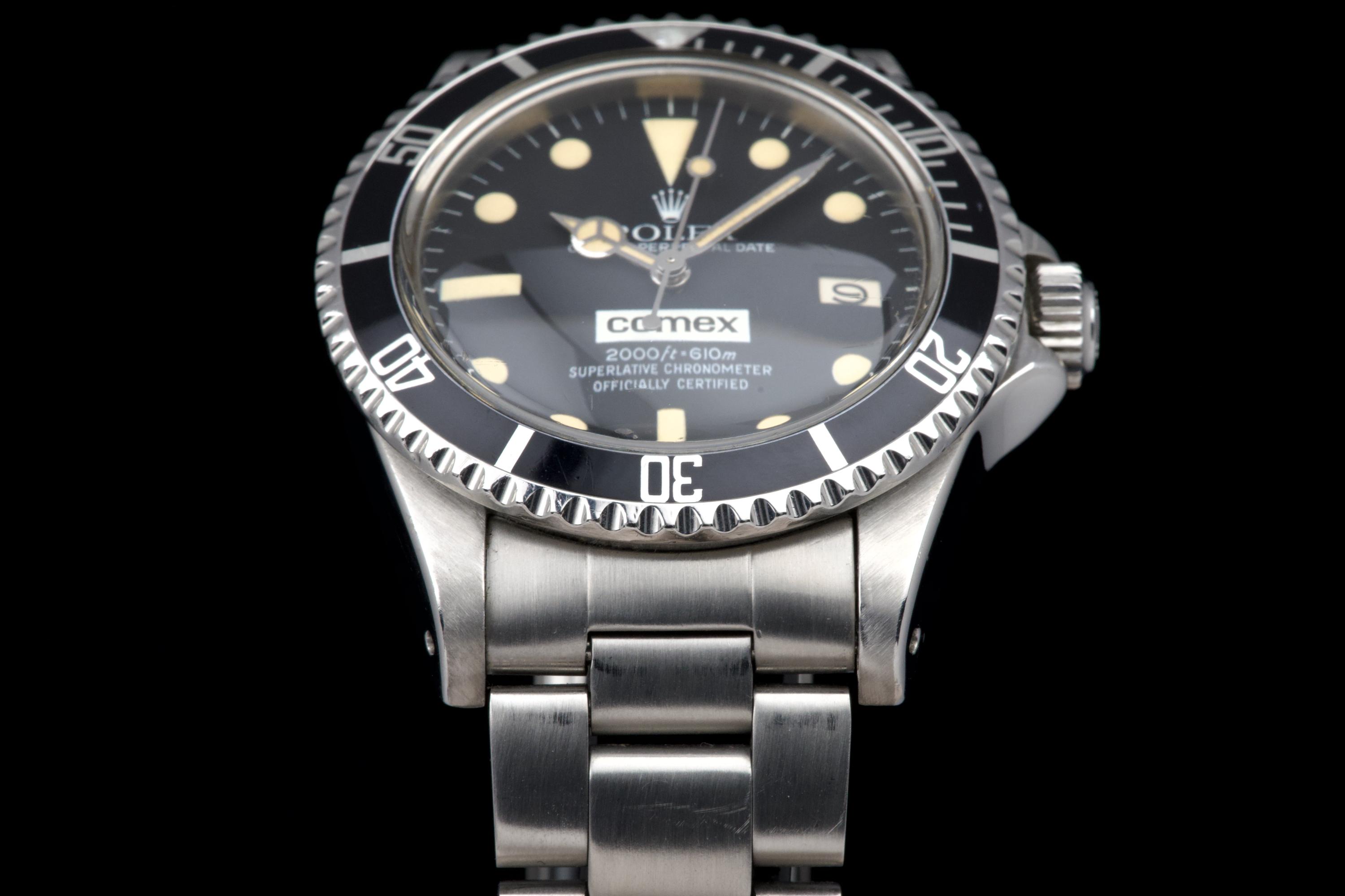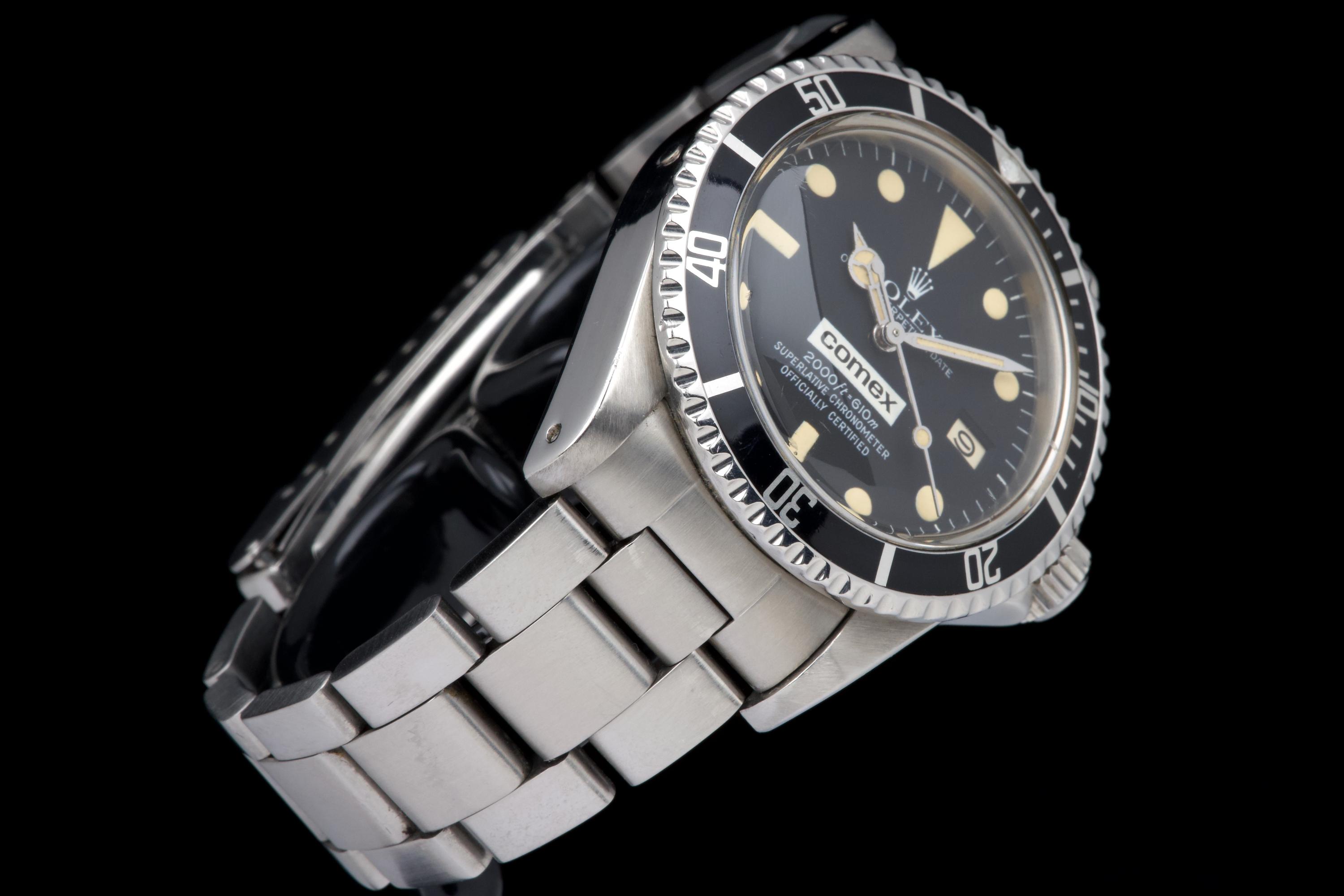An outstanding and historically significant example of the Rolex Sea-Dweller 1665 COMEX, delivered in 1982 and belonging to the very last batch ever supplied to COMEX — this watch is among the final ten pieces, with diver engraving 229X on the caseback. The stainless-steel case remains thick, sharp, and honest, having been lightly polished in the past but retaining excellent proportions. The serial and reference numbers between the lugs are crisp and well defined (serial 6751XXX). The caseback is correctly stamped 1665 and engraved internally with the matching serial number, and externally with the diver number. The watch features its original MK2 COMEX dial (non–rail dial), entirely correct for these very late deliveries. The dial is in perfect condition, showing a beautiful and warm yellow patina on the indexes, with matching hands. The original “open 6” date disc is still present. The steel bezel and its graduated insert are both original; only the luminous pearlwas replaced with a later Luminova version. The watch is accompanied by a copy of the original Rolex letter confirming COMEX delivery to Marseille in 1982, strengthening its provenance and historical relevance. Later 93150 bracelet with 585 endlinks (claspcode N4), showing stretch consistent with professional diving use — entirely expected and characteristic of authentic COMEX tools. The original domed crystal shows light marks and small impacts, again reinforcing that the watch served its intended purpose. Powered by the Calibre 1570, freshly checked and running perfectly, this example combines condition, authenticity, and superb provenance. A truly exceptional and desirable COMEX 1665 — one of the final ones ever issued, with confirmed delivery, correct MK2 dial, diver engraving, and all the hallmarks of a genuine tool-used COMEX Sea-Dweller. A trophy-level piece for the serious collector.