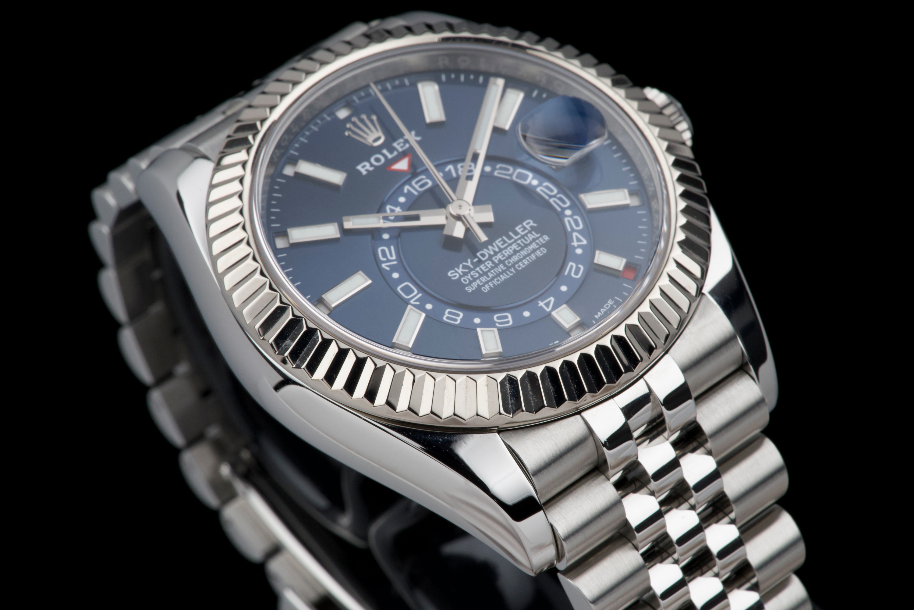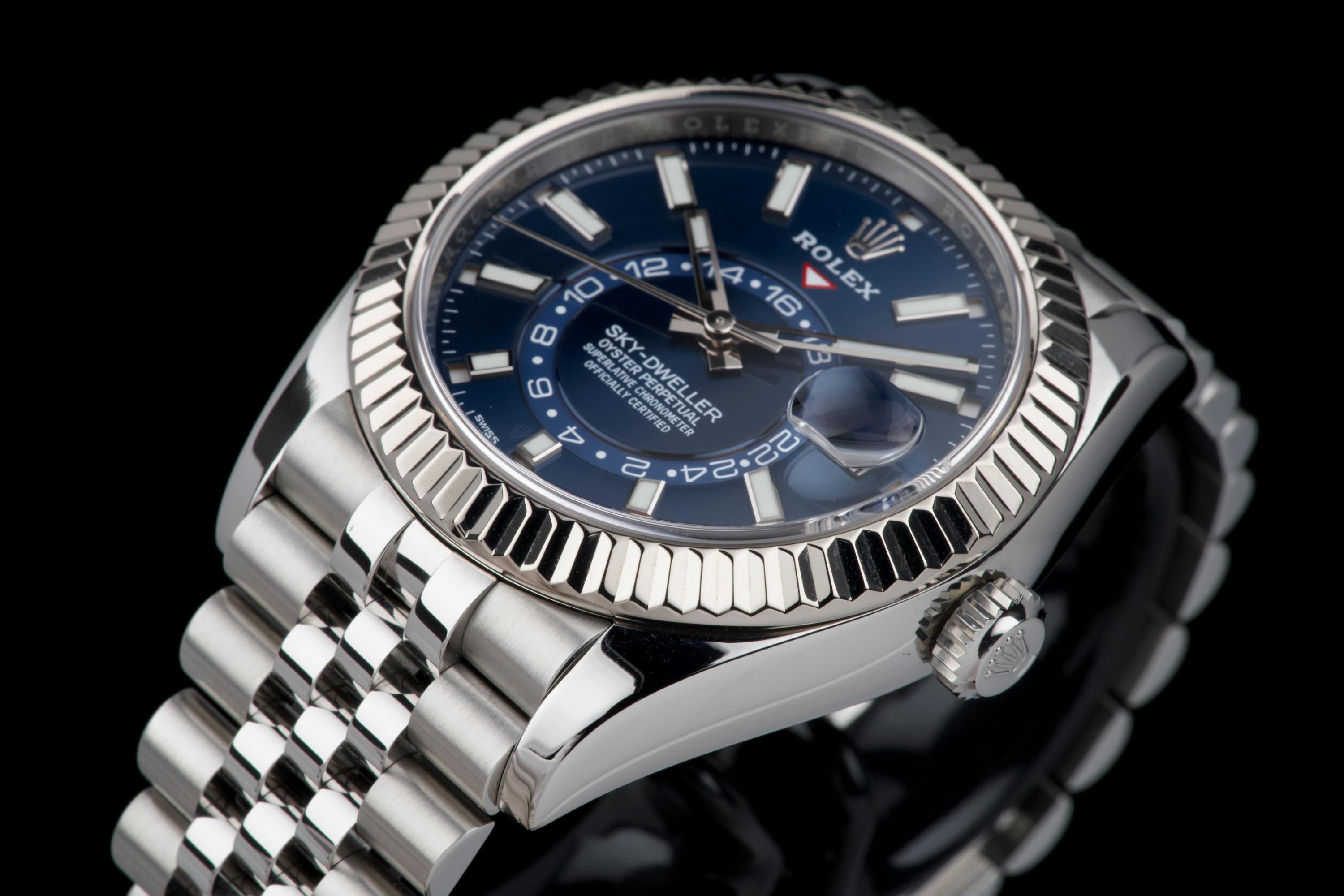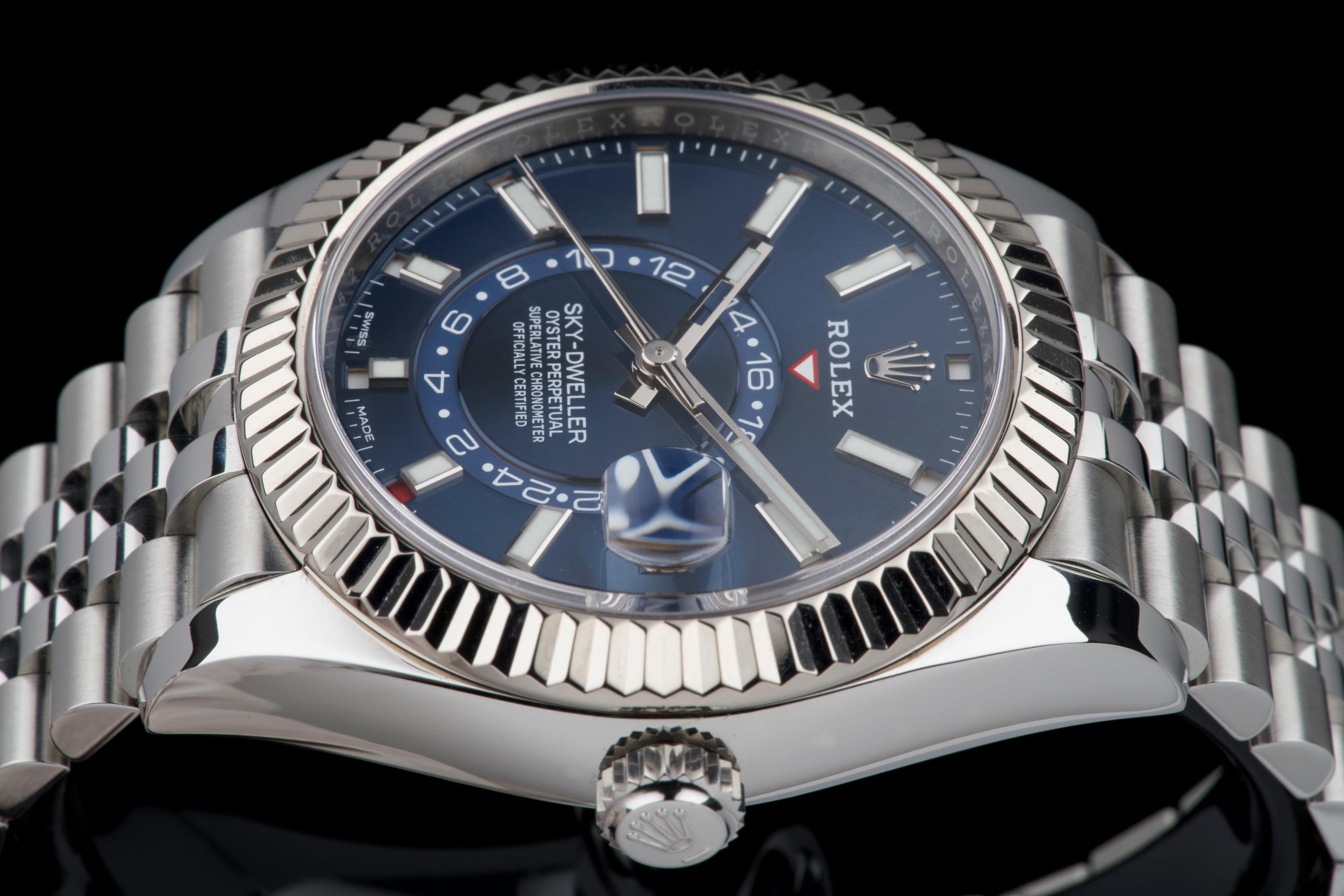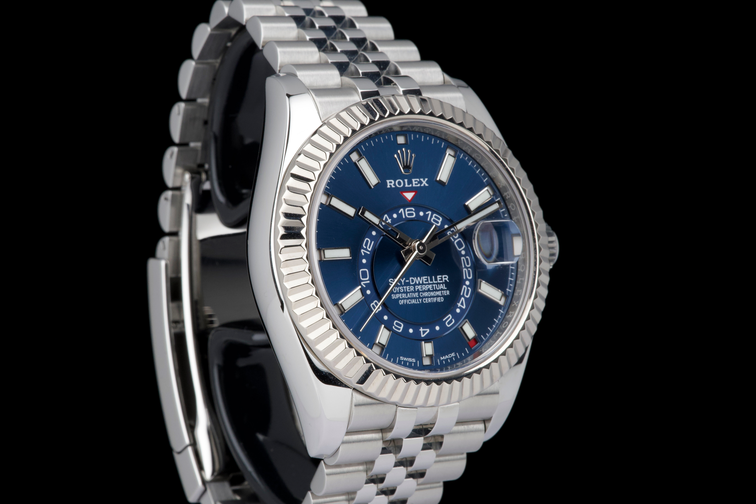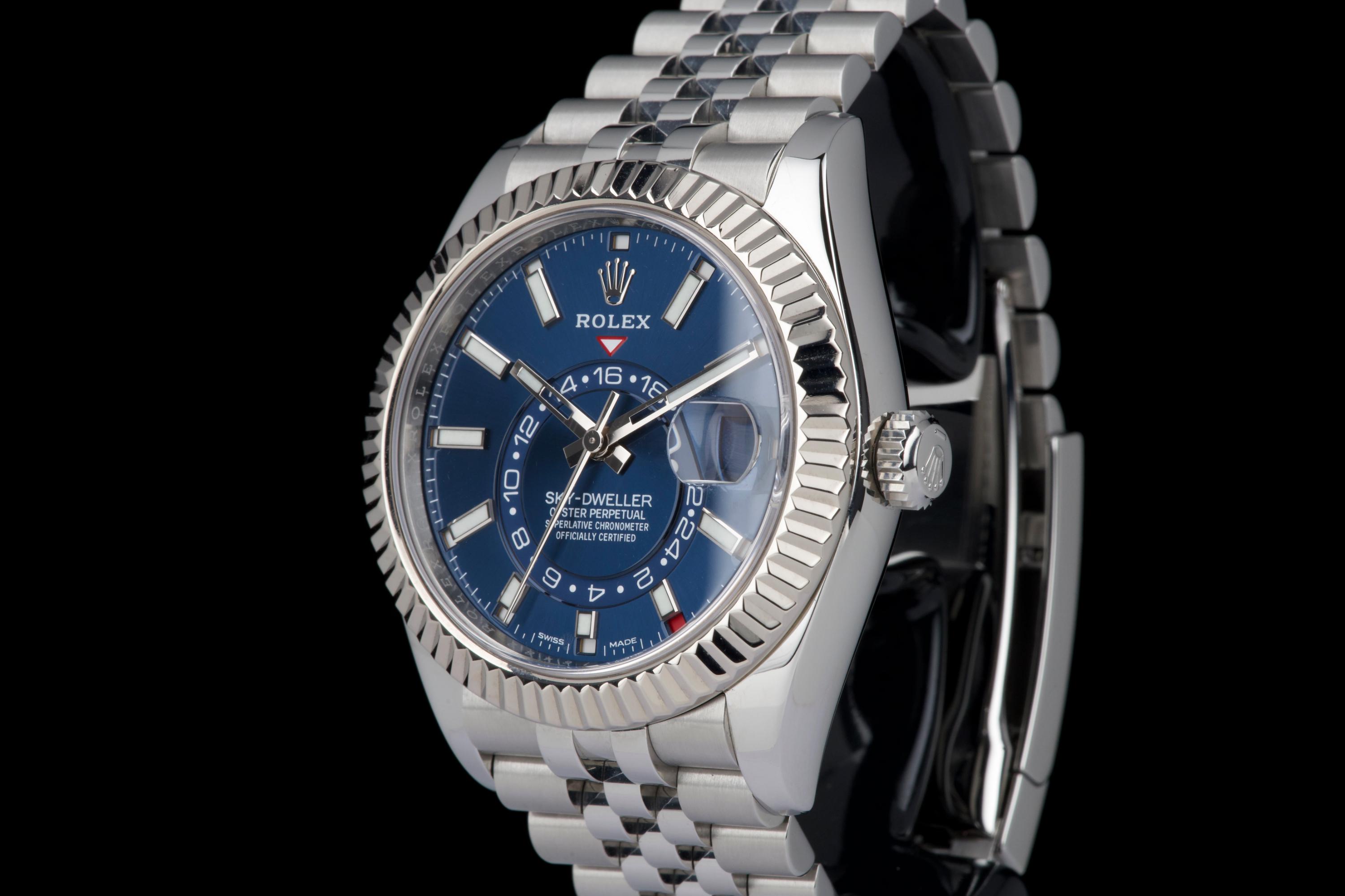 The Rolex Sky-Dweller 326934 is the brand’s most complex model, combining dual time zone functionality with an annual calendar, all elegantly integrated into a 42 mm case. This version pairs a striking sunburst blue dial with a white gold fluted bezel and a stainless steel jubilé bracelet—one of the most sought-after configurations in the lineup. This example was sold in 2021 and comes as a complete full set. It has never been worn, virtually new. A perfect blend of sophistication and functionality, the blue Sky-Dweller continues to be one of the most desirable modern Rolex references.