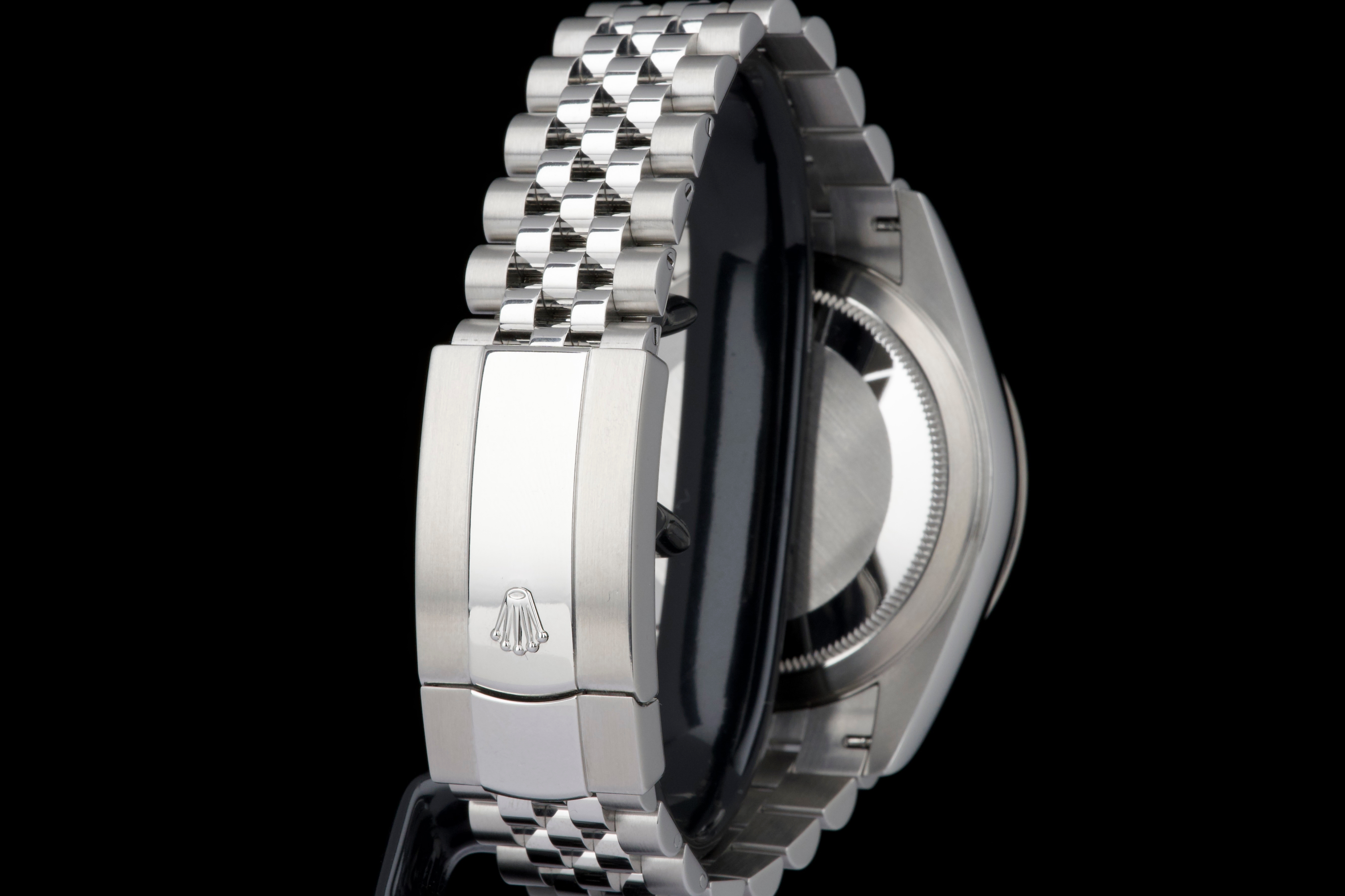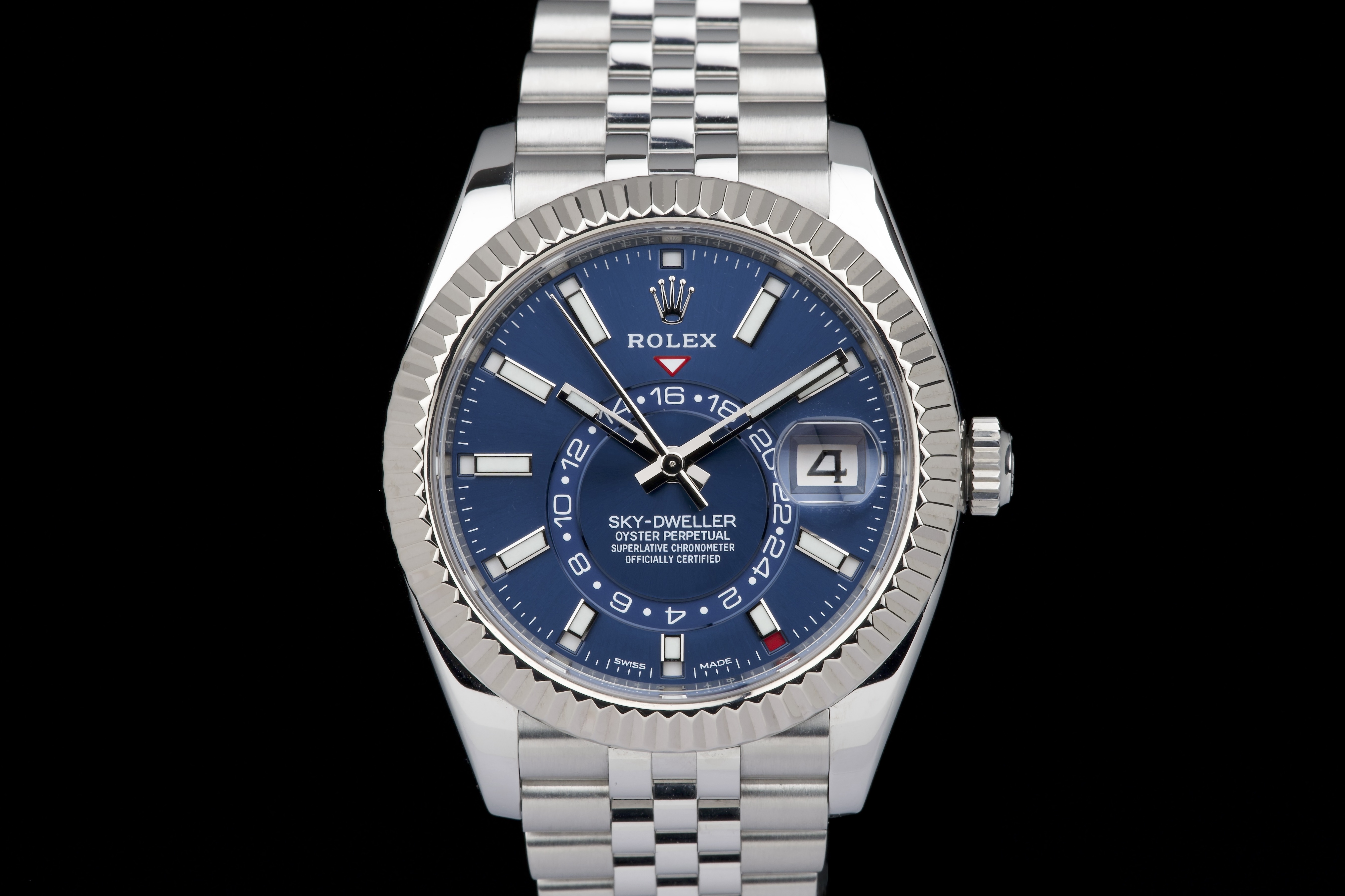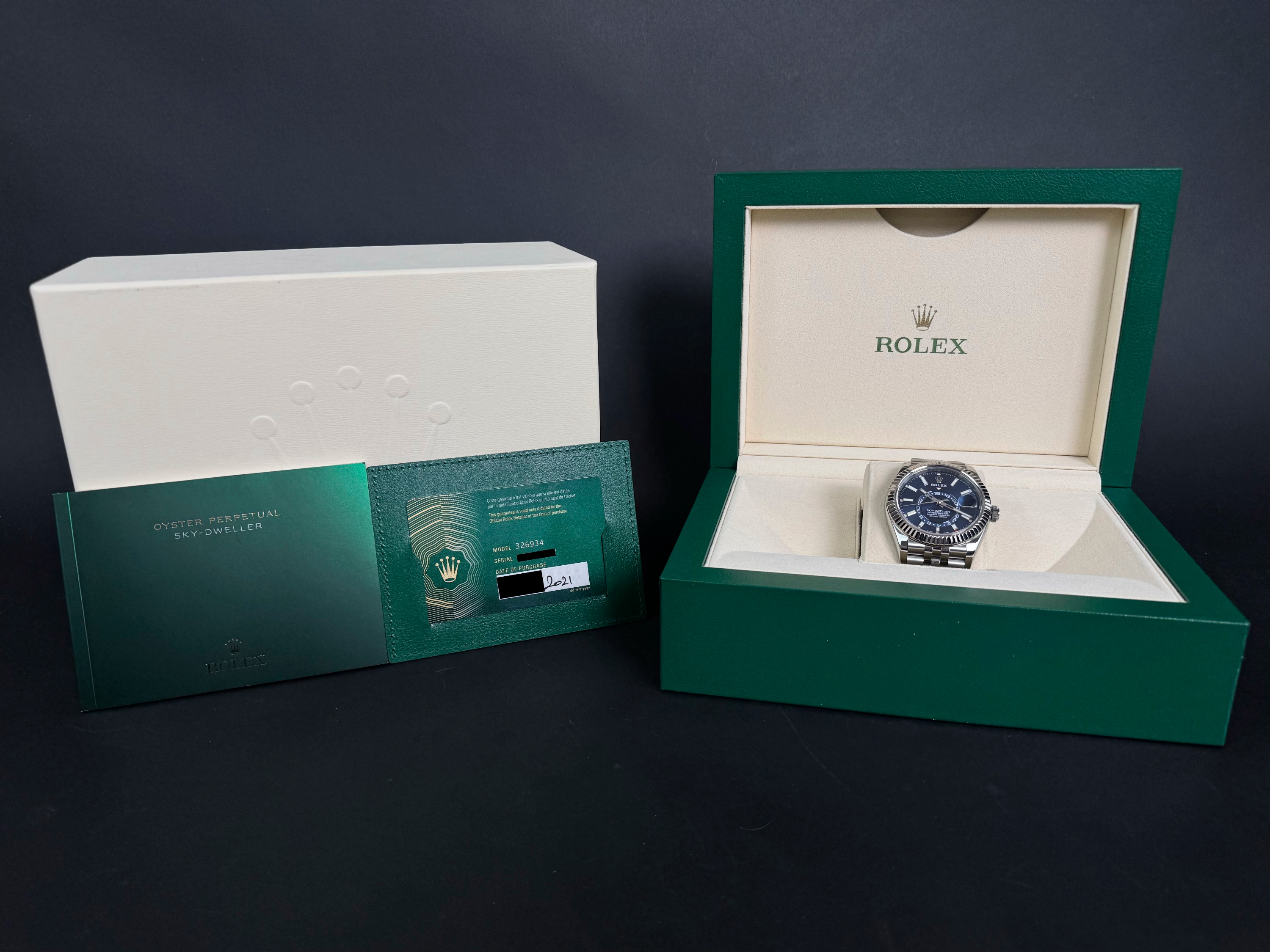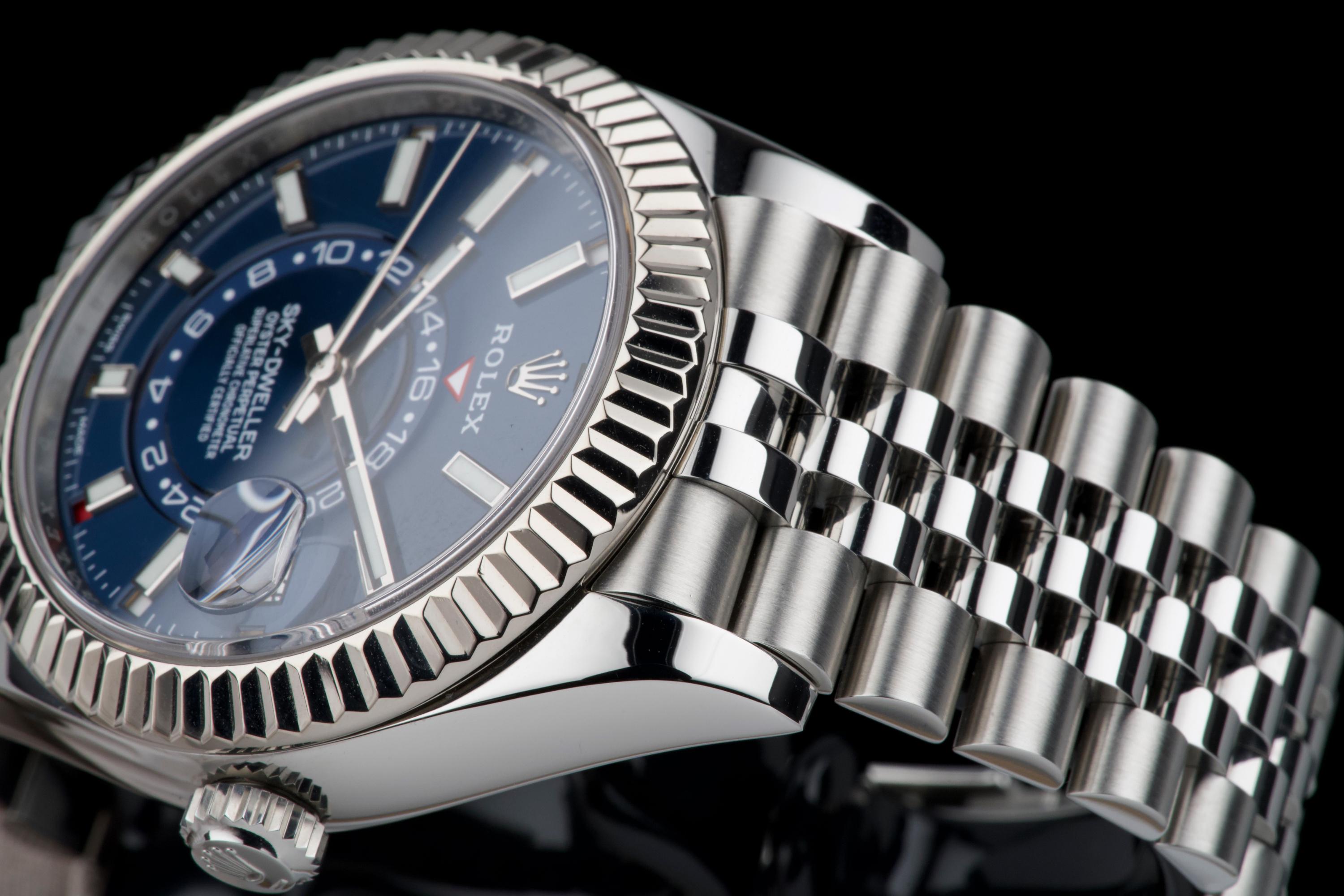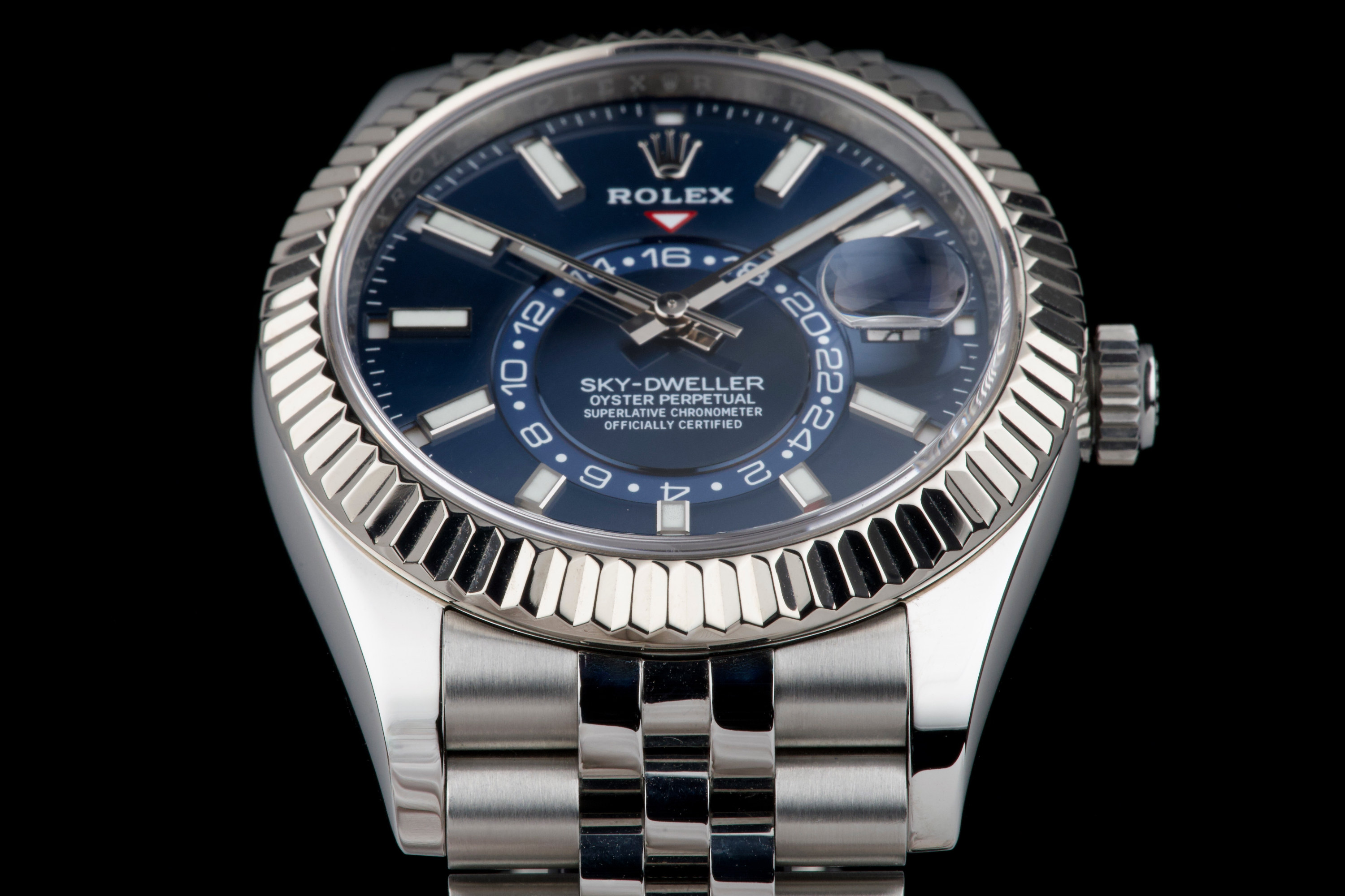 The Rolex Sky-Dweller 326934 is the brand’s most complex model, combining dual time zone functionality with an annual calendar, all elegantly integrated into a 42 mm case. This version pairs a striking sunburst blue dial with a white gold fluted bezel and a stainless steel jubilé bracelet—one of the most sought-after configurations in the lineup. This example was sold in 2021 and comes as a complete full set. It has never been worn, virtually new. A perfect blend of sophistication and functionality, the blue Sky-Dweller continues to be one of the most desirable modern Rolex references.