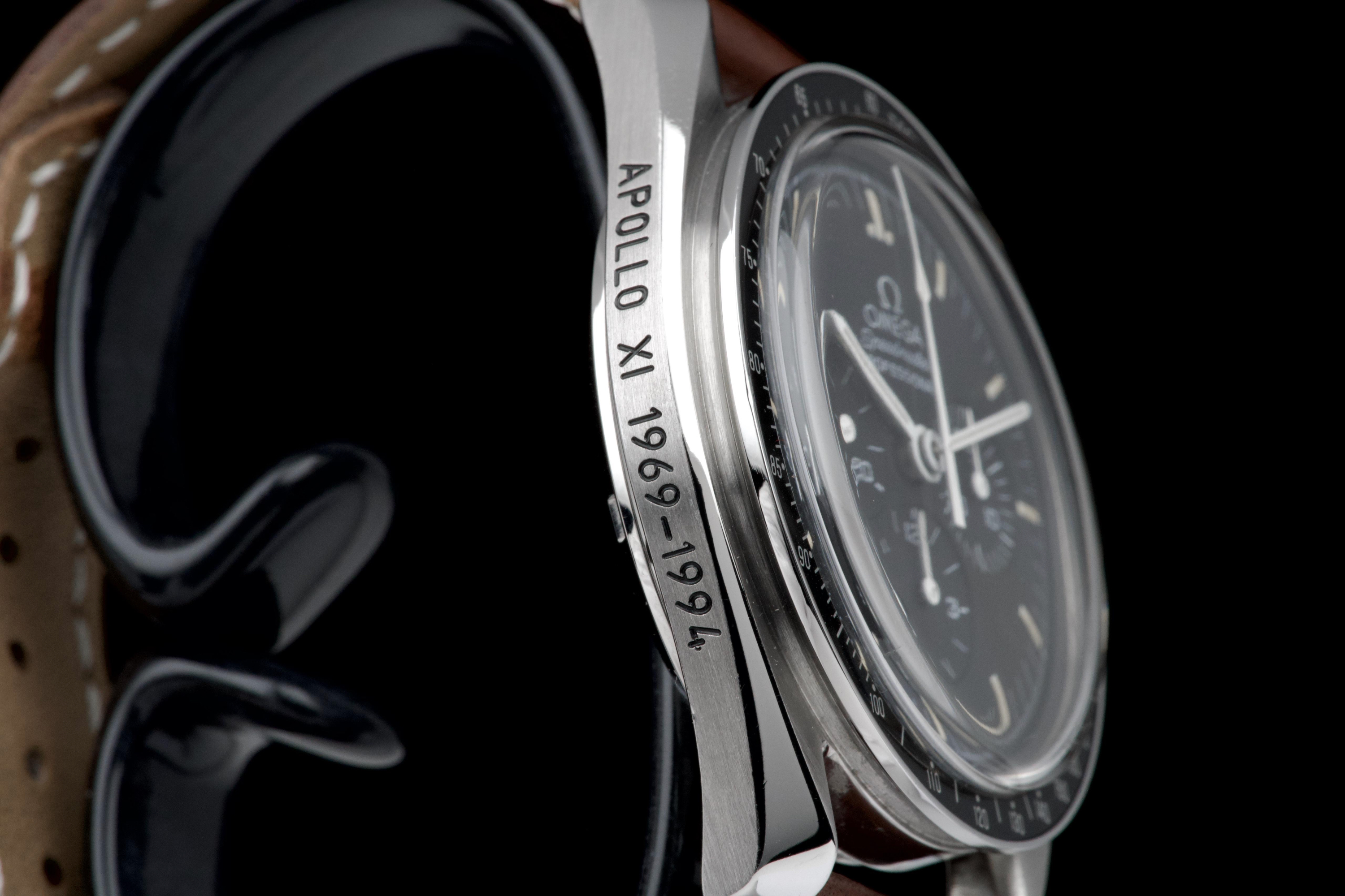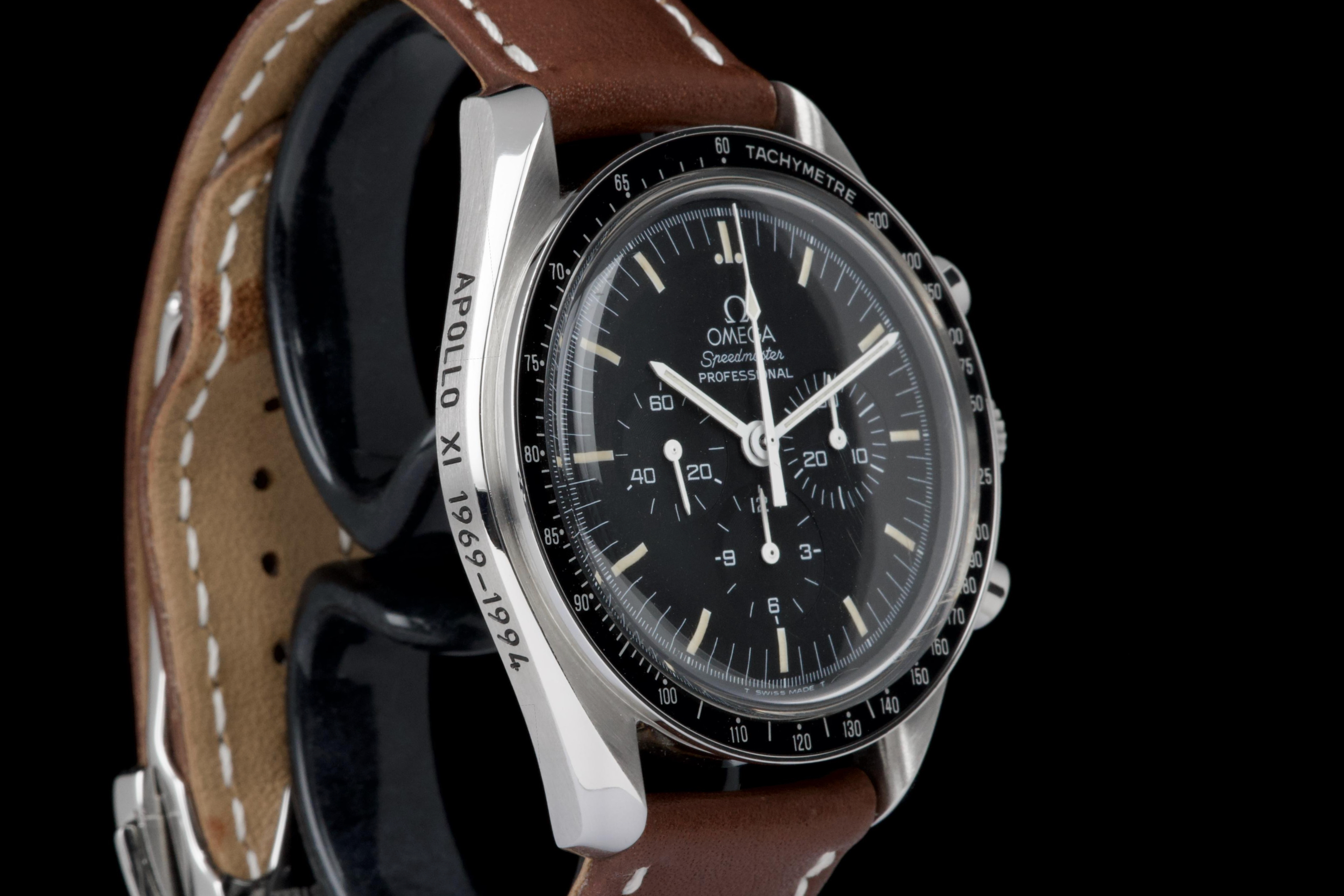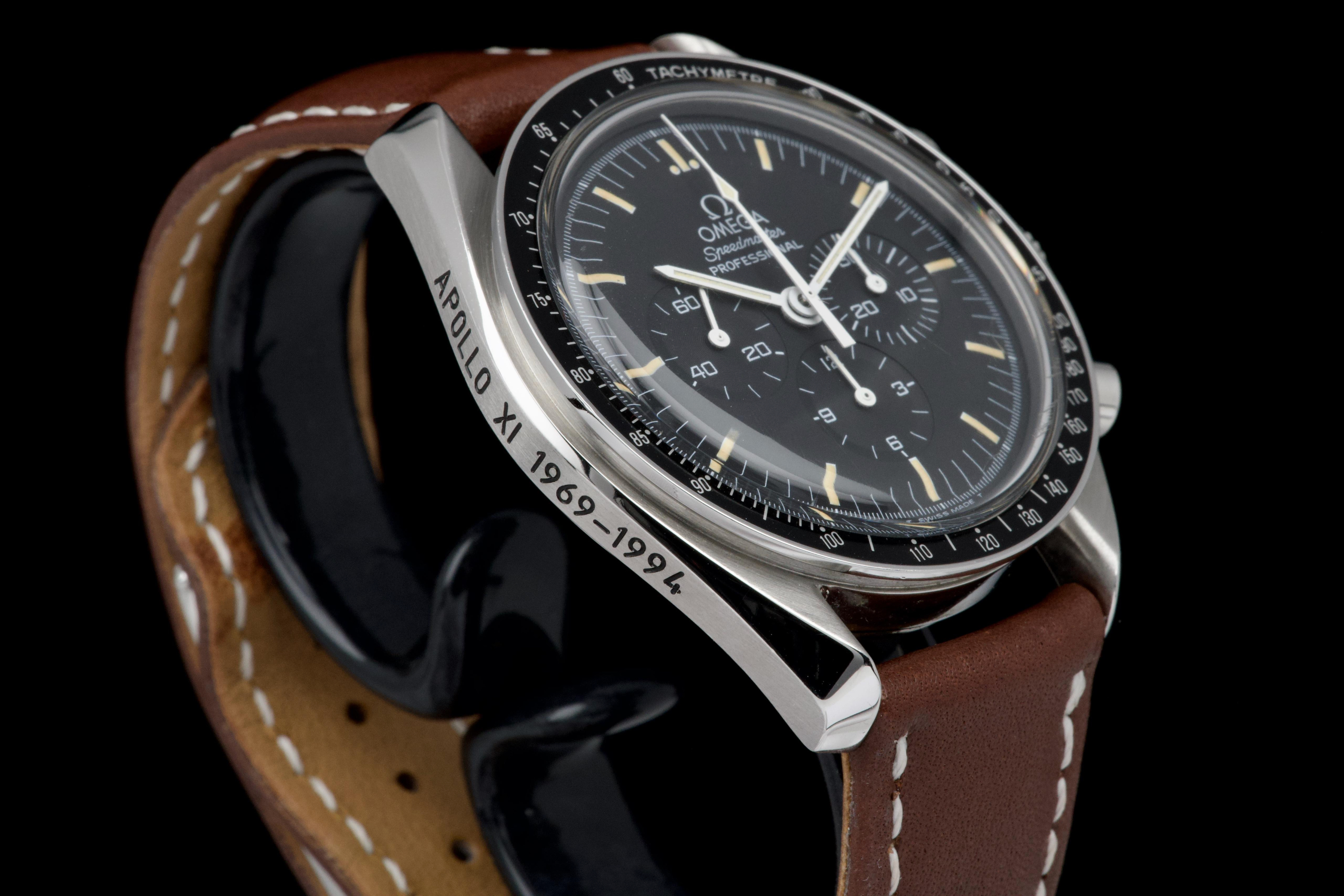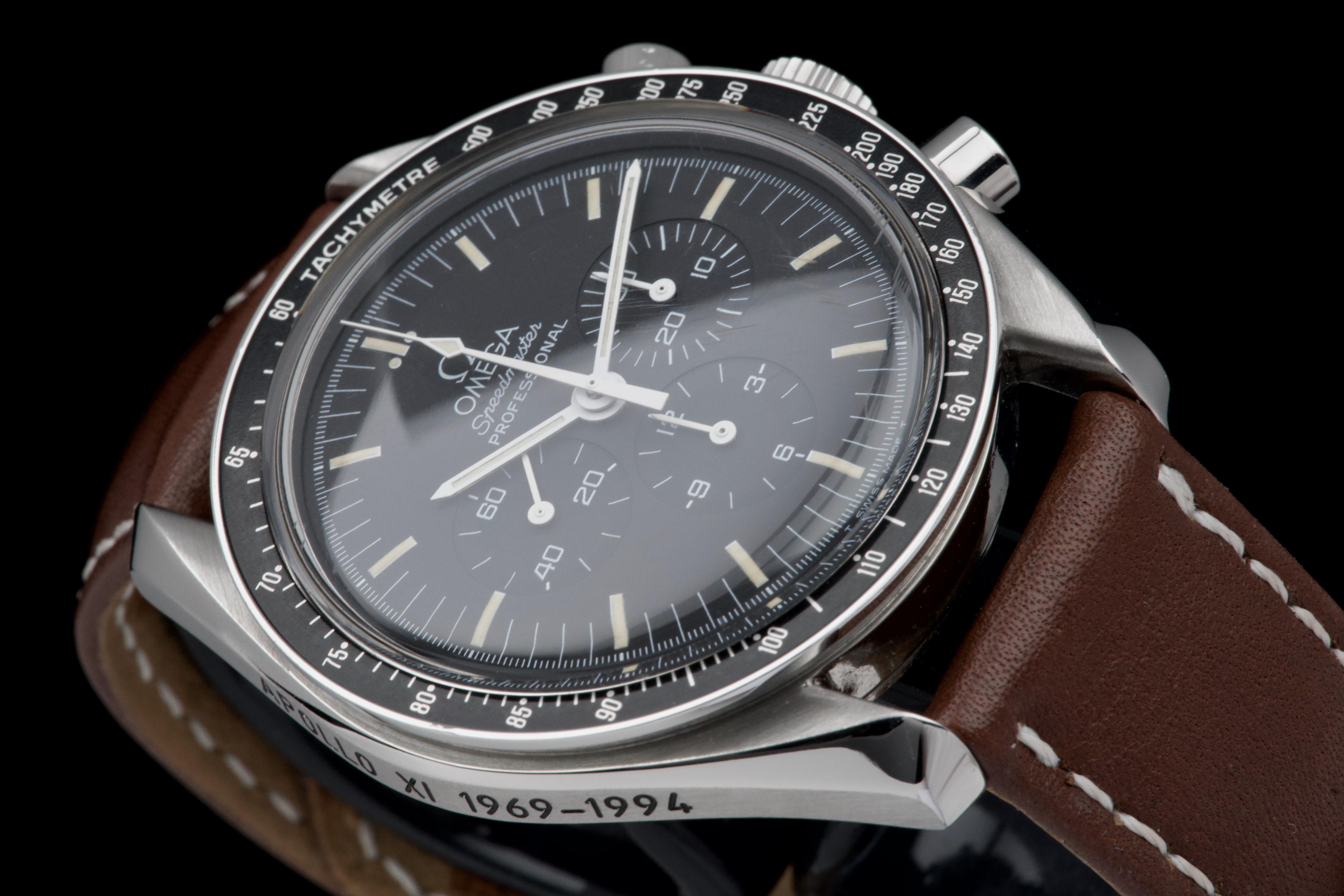 The present Omega Speedmaster Professional Moonwatch reference 3591.50, bearing a 48XXXXXX serial and sold in December 1994, is a highly collectible limited-edition commemorative model produced to celebrate the 25th anniversary of the Apollo XI mission. Issued in a limited series of 2,500 pieces worldwide, this example is individually numbered 21XX/2500, underscoring its exclusivity within the production. Distinguished from standard Moonwatch models, this special edition features the commemorative engraving “Apollo XI 1969–1994” along the side of the case, while the individually engraved limited number is displayed on the caseback. These details firmly anchor the watch within Omega’s lineage of historically significant Speedmasters tied to space exploration heritage. The watch is preserved in excellent vintage condition, showing only light signs of wear consistent with careful use. The case has likely been polished in the past, yet the serial number on the lug remains fully intact and clearly legible. The original dial is particularly attractive, displaying a vivid yellow patina that enhances its vintage character and visual appeal. The hands are original and match the dial well, maintaining overall aesthetic coherence. The watch is fitted with a brown leather strap paired with an Omega deployant clasp, complementing the warm tones of the dial patina. It is accompanied by its original 25th Anniversary Omega presentation box, booklet, and commemorative patch, forming a highly desirable and increasingly scarce collector’s set. No service history accompanies the watch. Combining limited production, commemorative significance, attractive patina, and strong overall condition, this Speedmaster 3591.50 Apollo XI 25th Anniversary represents a compelling opportunity to acquire a historically inspired Moonwatch with enduring collector appeal.