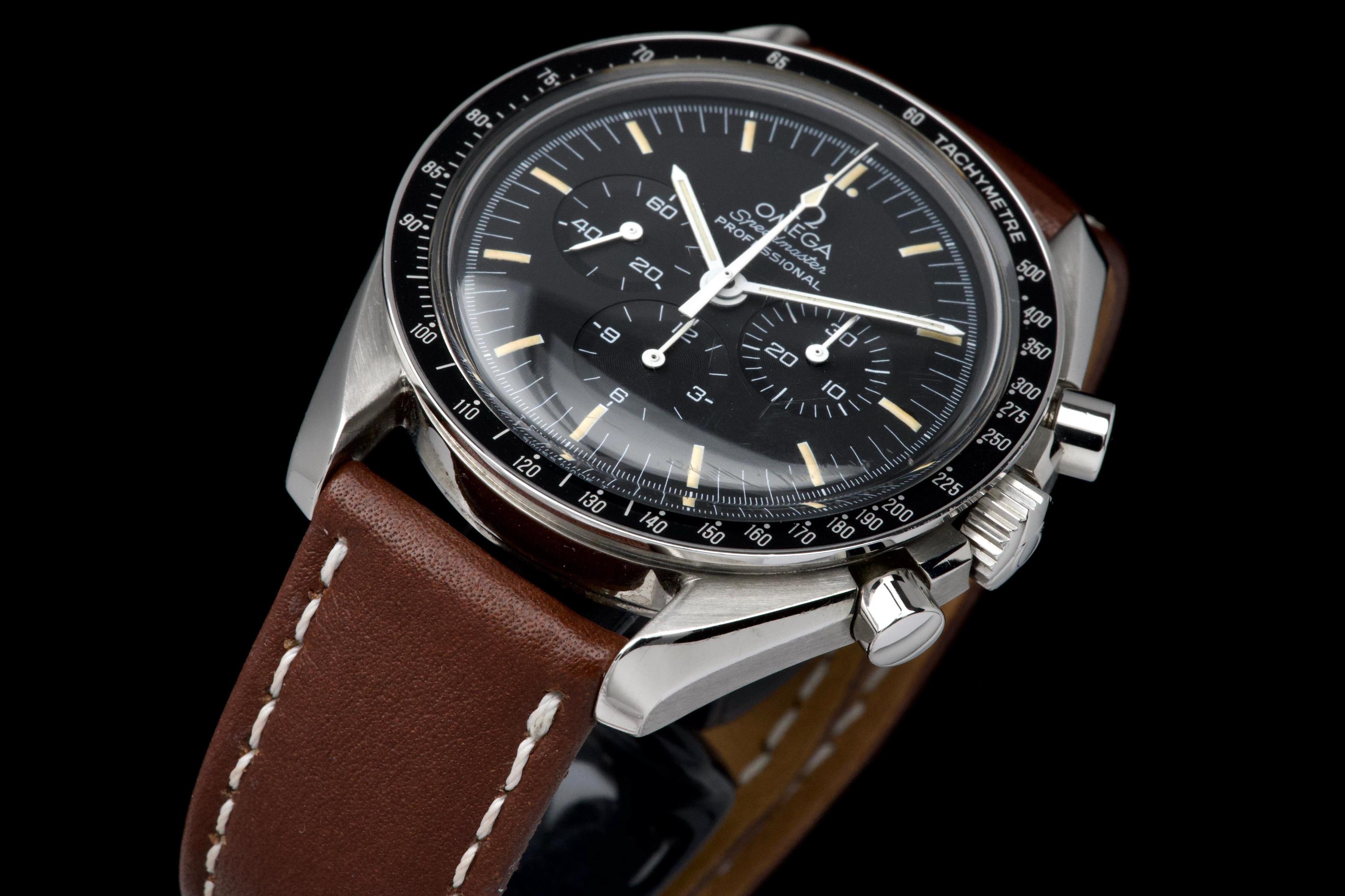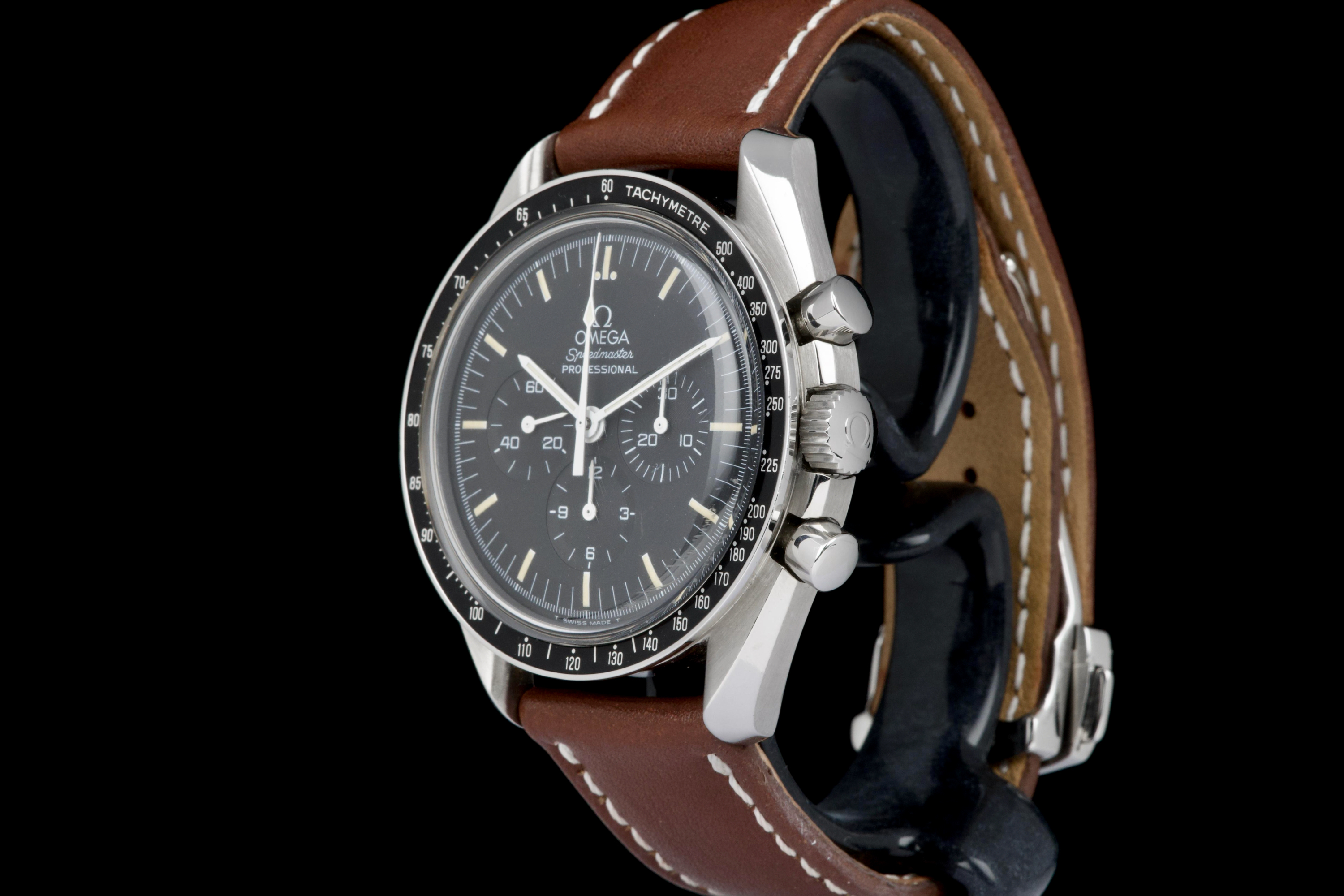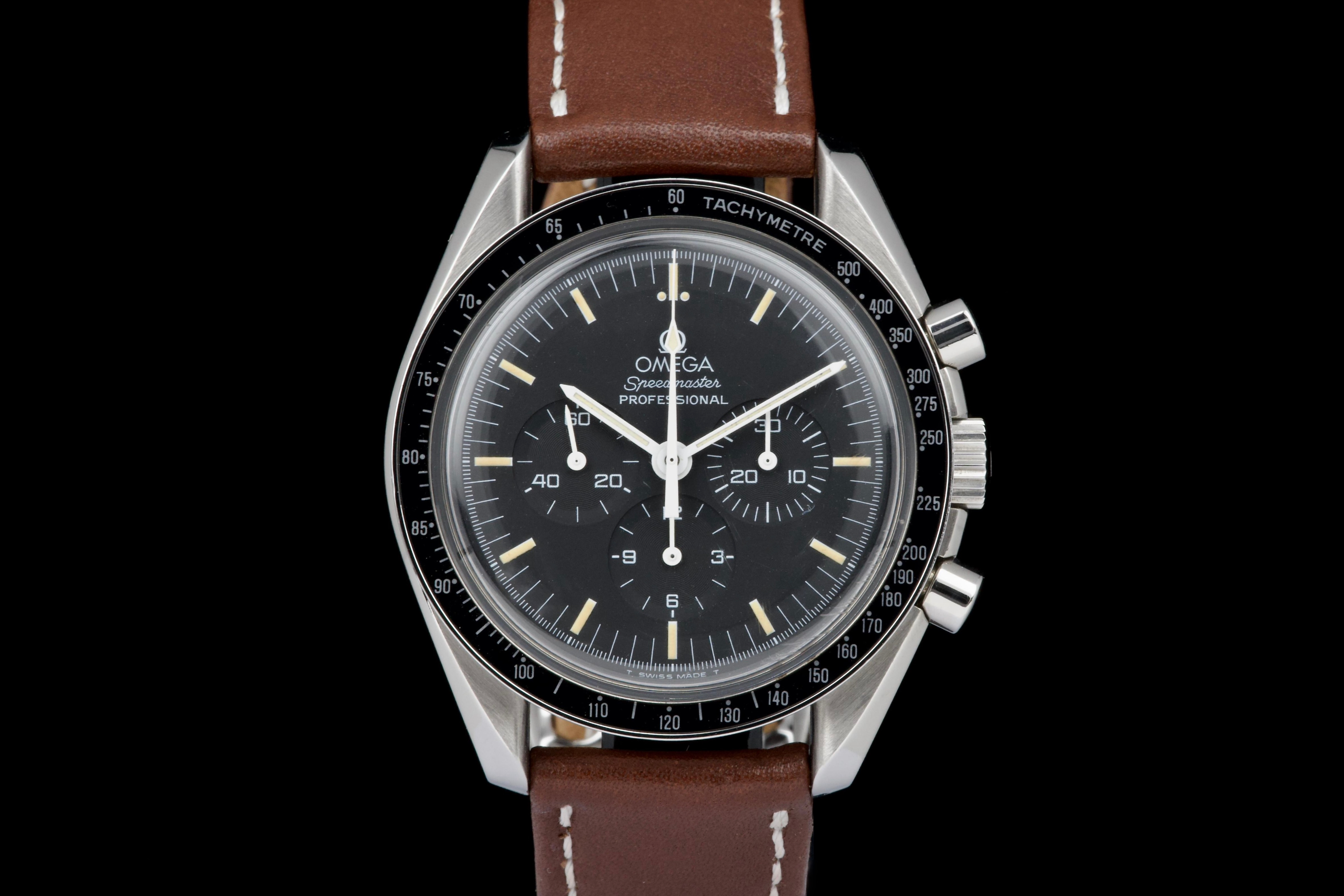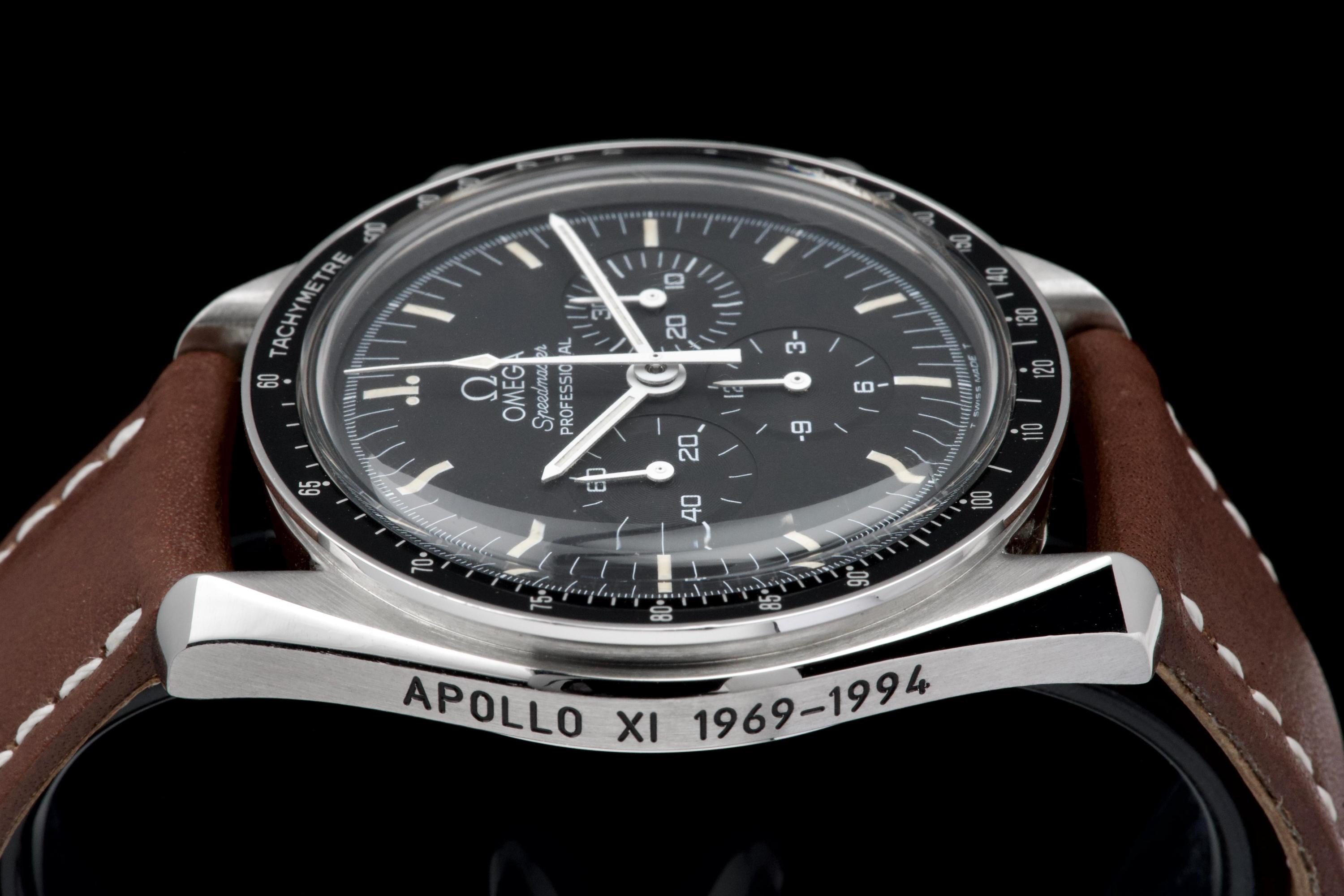 The present Omega Speedmaster Professional Moonwatch reference 3591.50, bearing a 48XXXXXX serial and sold in December 1994, is a highly collectible limited-edition commemorative model produced to celebrate the 25th anniversary of the Apollo XI mission. Issued in a limited series of 2,500 pieces worldwide, this example is individually numbered 21XX/2500, underscoring its exclusivity within the production. Distinguished from standard Moonwatch models, this special edition features the commemorative engraving “Apollo XI 1969–1994” along the side of the case, while the individually engraved limited number is displayed on the caseback. These details firmly anchor the watch within Omega’s lineage of historically significant Speedmasters tied to space exploration heritage. The watch is preserved in excellent vintage condition, showing only light signs of wear consistent with careful use. The case has likely been polished in the past, yet the serial number on the lug remains fully intact and clearly legible. The original dial is particularly attractive, displaying a vivid yellow patina that enhances its vintage character and visual appeal. The hands are original and match the dial well, maintaining overall aesthetic coherence. The watch is fitted with a brown leather strap paired with an Omega deployant clasp, complementing the warm tones of the dial patina. It is accompanied by its original 25th Anniversary Omega presentation box, booklet, and commemorative patch, forming a highly desirable and increasingly scarce collector’s set. No service history accompanies the watch. Combining limited production, commemorative significance, attractive patina, and strong overall condition, this Speedmaster 3591.50 Apollo XI 25th Anniversary represents a compelling opportunity to acquire a historically inspired Moonwatch with enduring collector appeal.
