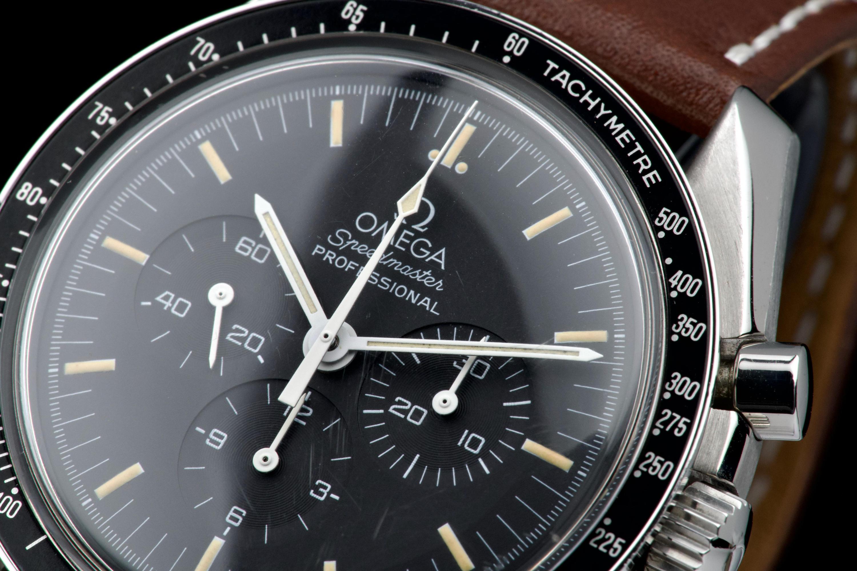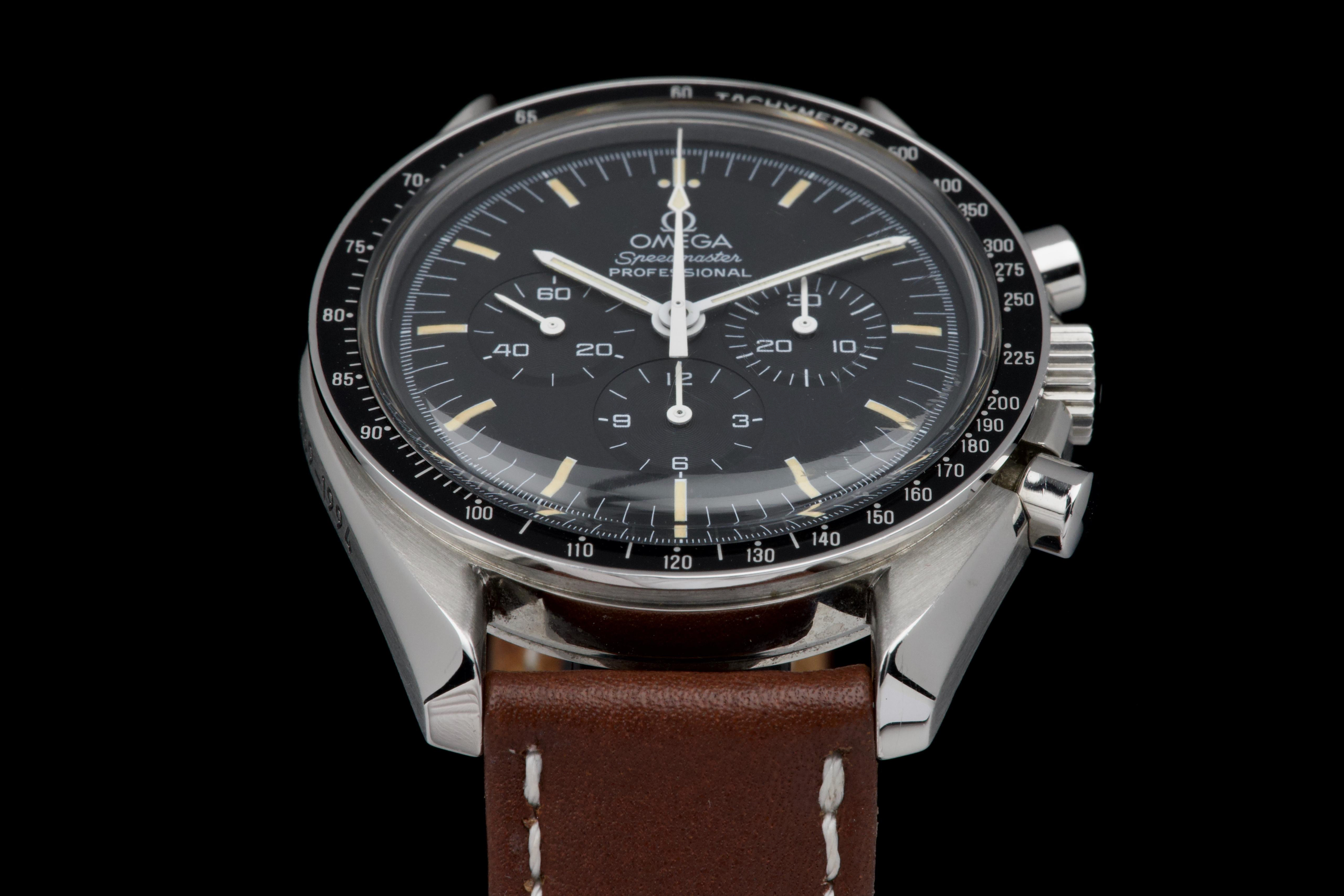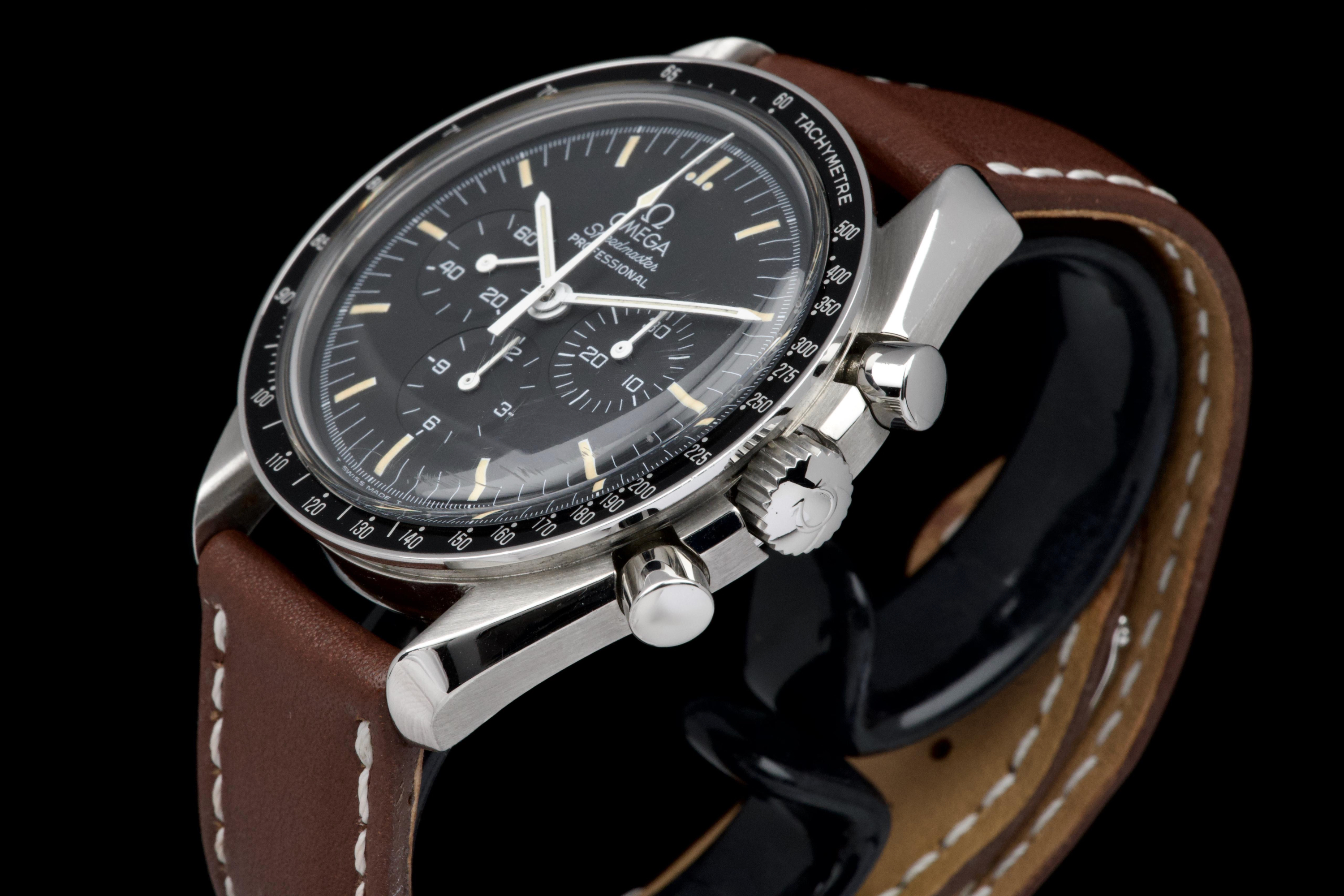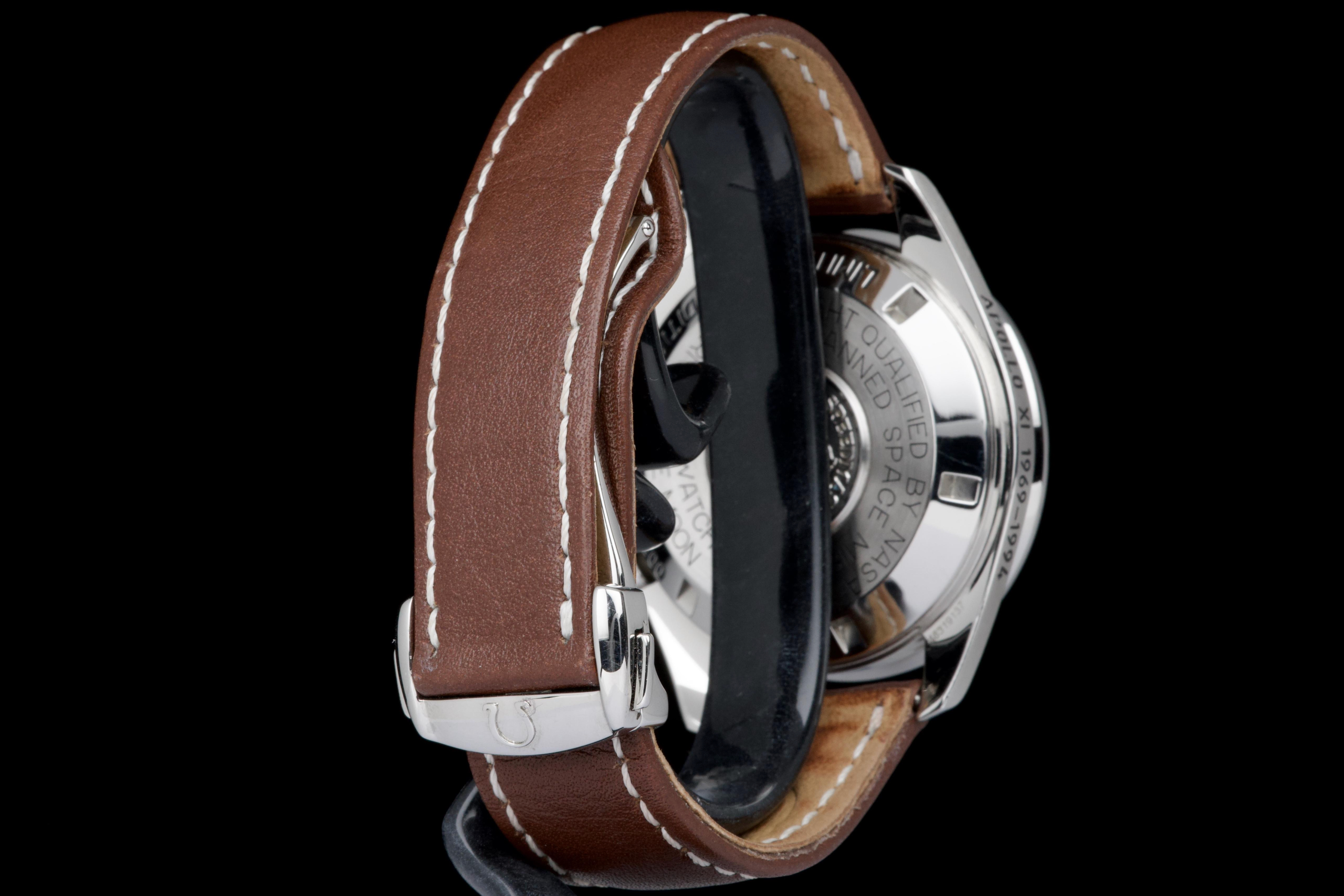 The present Omega Speedmaster Professional Moonwatch reference 3591.50, bearing a 48XXXXXX serial and sold in December 1994, is a highly collectible limited-edition commemorative model produced to celebrate the 25th anniversary of the Apollo XI mission. Issued in a limited series of 2,500 pieces worldwide, this example is individually numbered 21XX/2500, underscoring its exclusivity within the production. Distinguished from standard Moonwatch models, this special edition features the commemorative engraving “Apollo XI 1969–1994” along the side of the case, while the individually engraved limited number is displayed on the caseback. These details firmly anchor the watch within Omega’s lineage of historically significant Speedmasters tied to space exploration heritage. The watch is preserved in excellent vintage condition, showing only light signs of wear consistent with careful use. The case has likely been polished in the past, yet the serial number on the lug remains fully intact and clearly legible. The original dial is particularly attractive, displaying a vivid yellow patina that enhances its vintage character and visual appeal. The hands are original and match the dial well, maintaining overall aesthetic coherence. The watch is fitted with a brown leather strap paired with an Omega deployant clasp, complementing the warm tones of the dial patina. It is accompanied by its original 25th Anniversary Omega presentation box, booklet, and commemorative patch, forming a highly desirable and increasingly scarce collector’s set. No service history accompanies the watch. Combining limited production, commemorative significance, attractive patina, and strong overall condition, this Speedmaster 3591.50 Apollo XI 25th Anniversary represents a compelling opportunity to acquire a historically inspired Moonwatch with enduring collector appeal.