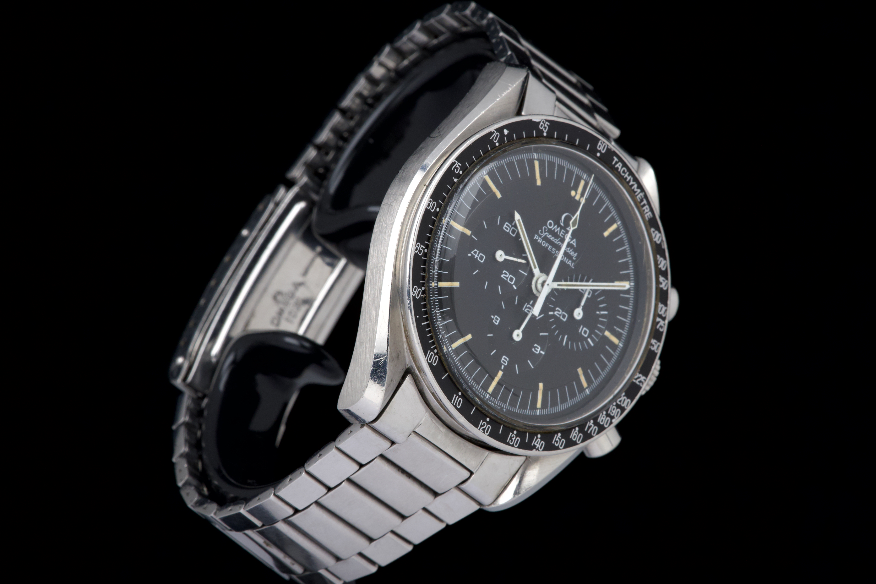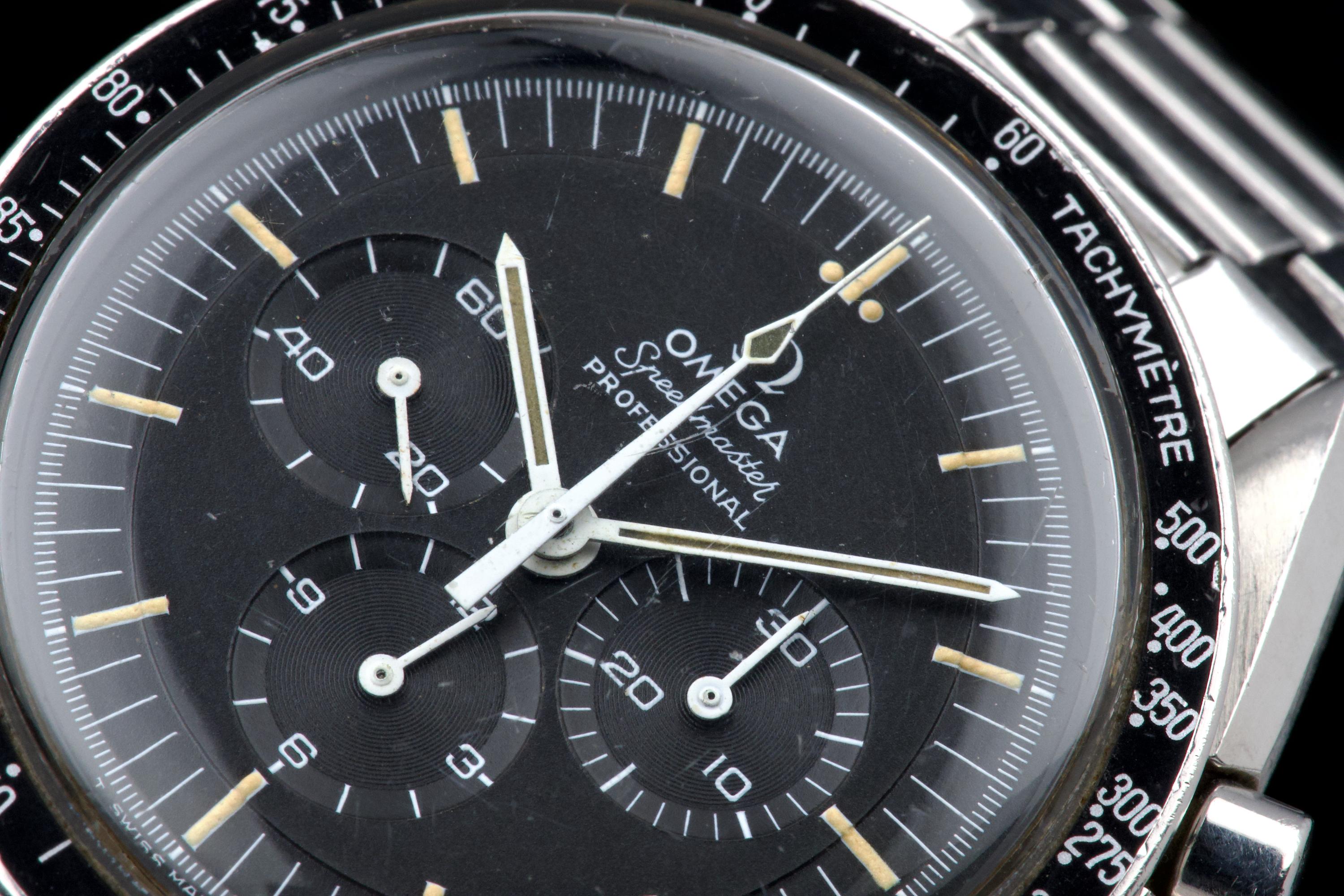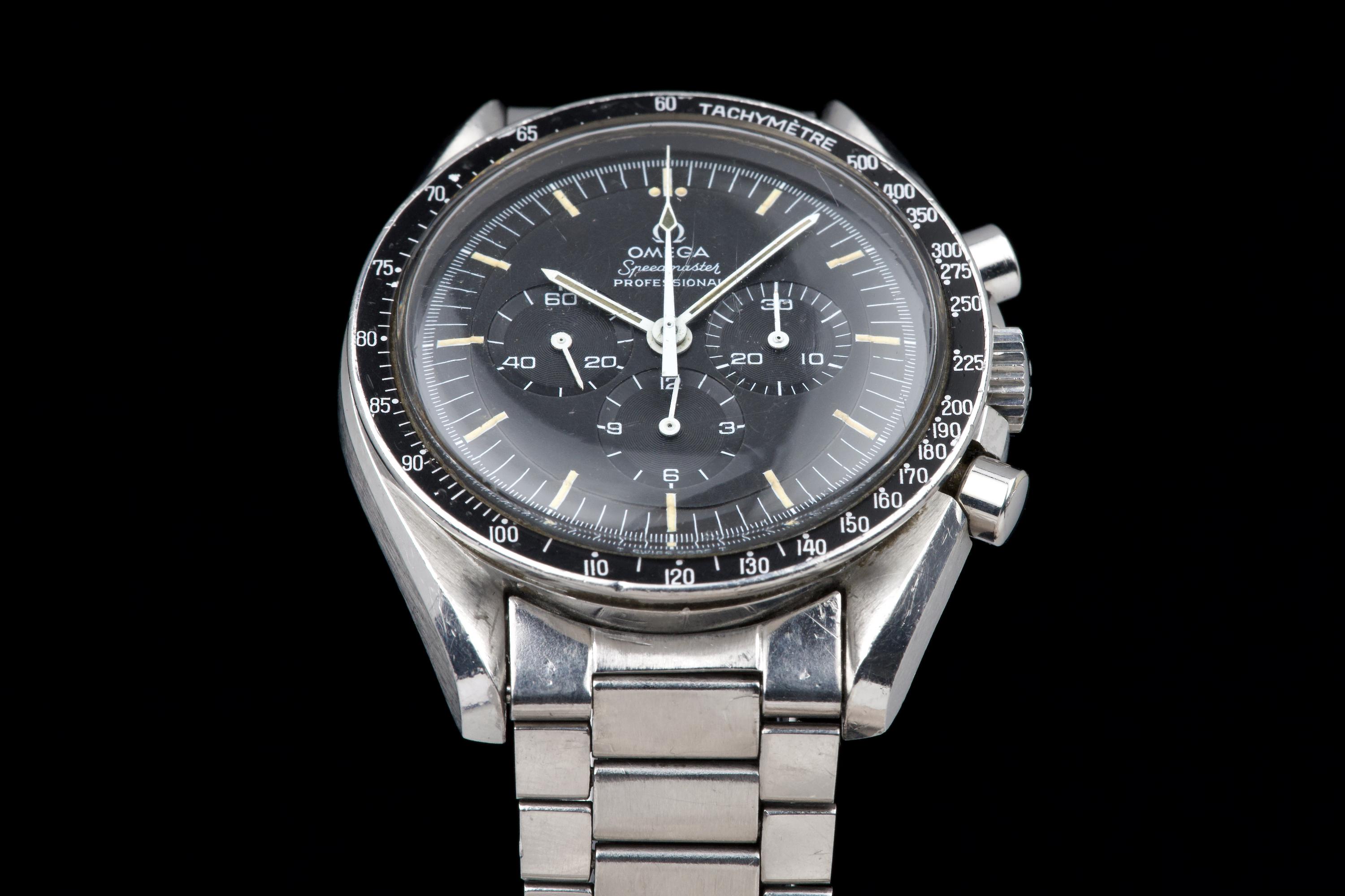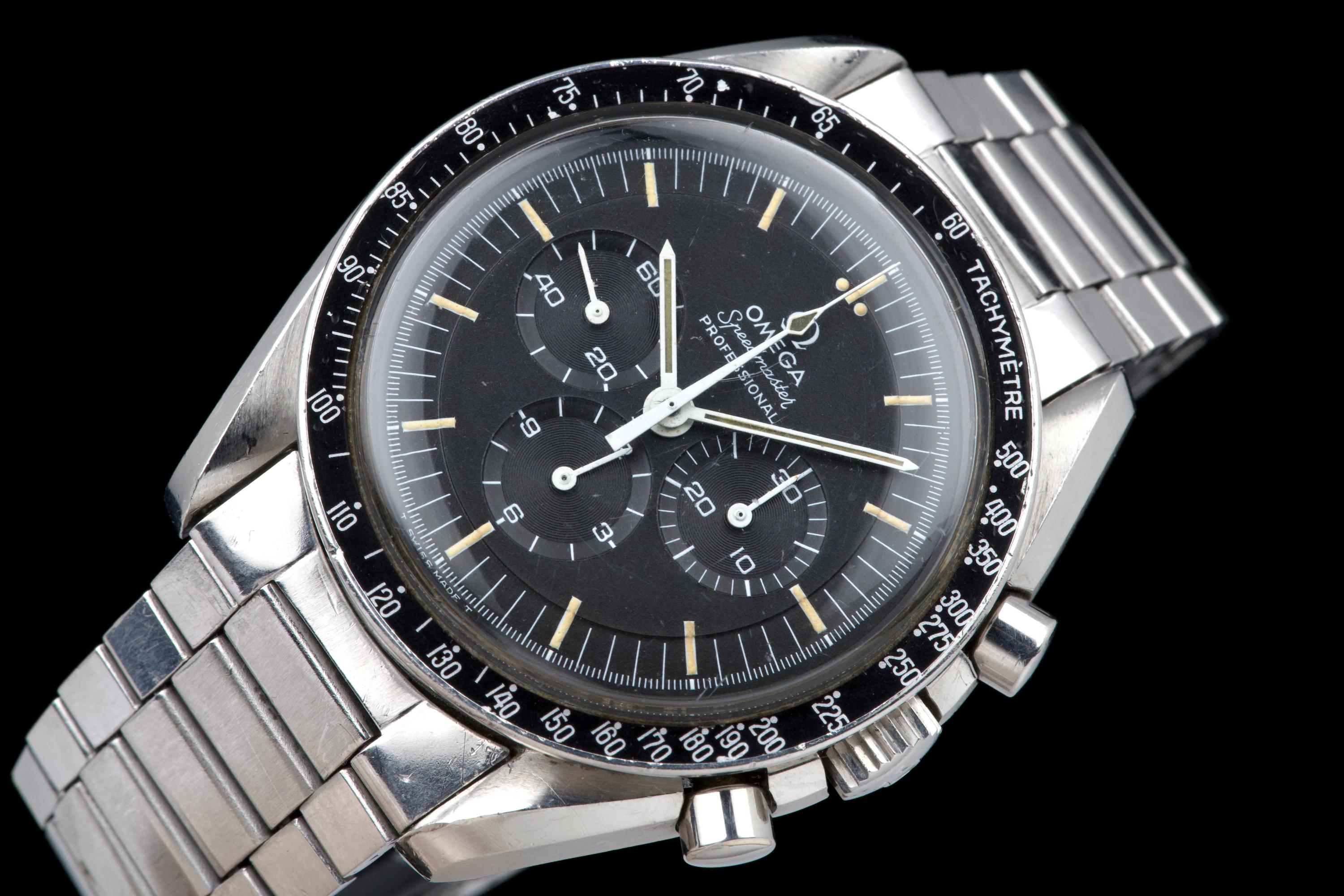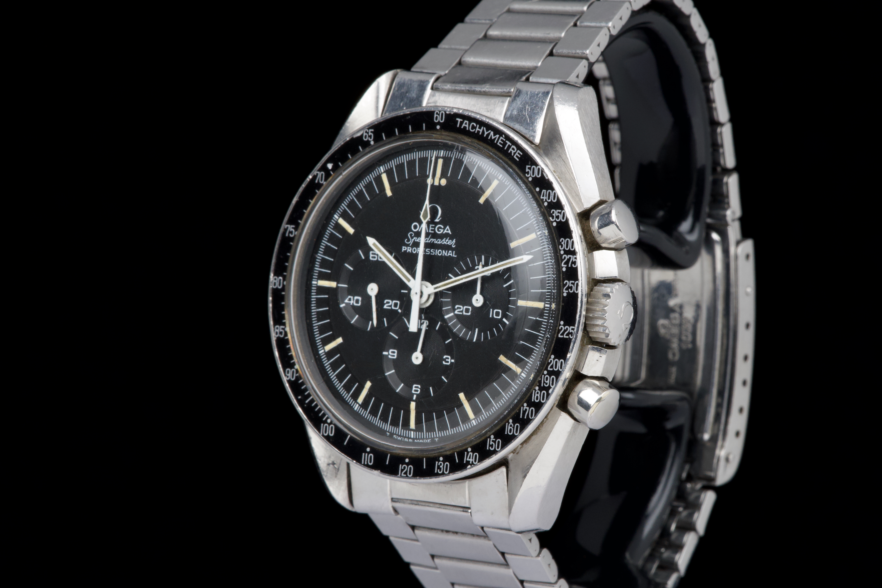 A highly attractive and fully honest example of the 1969 Omega Speedmaster 145.022-69, retaining all of its important original components. The watch is unpolished and shows marks, scratches, and signs of wear consistent with its age, giving it a strong and appealing vintage presence. The original tritium dial has developed a beautiful warm patina, perfectly complemented by matching tritium hands. It features its correct and highly sought-after Dot Over Ninety bezel, along with original pushers, original crown, and the original hesalite crystal with the Omega logo still visible at the center. The watch is fitted with its original 1039 bracelet with 416 endlinks, and the clasp is correctly stamped 4.69. Powered by the Omega caliber 861, the watch has no documented service history but is running properly. A superb, untouched, and collectible example of a late-1960s Moonwatch, exactly as enthusiasts and purists hope to find it.