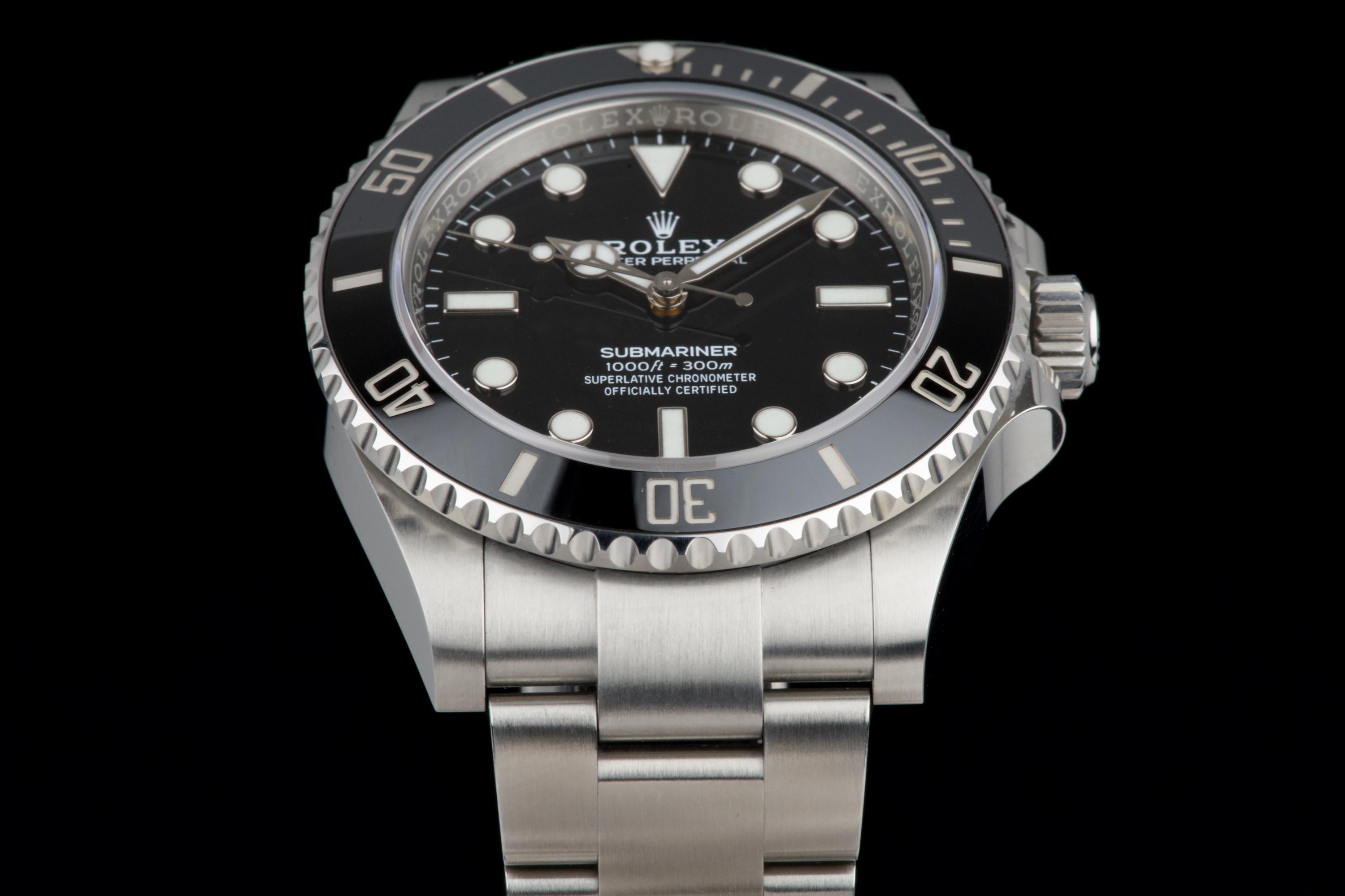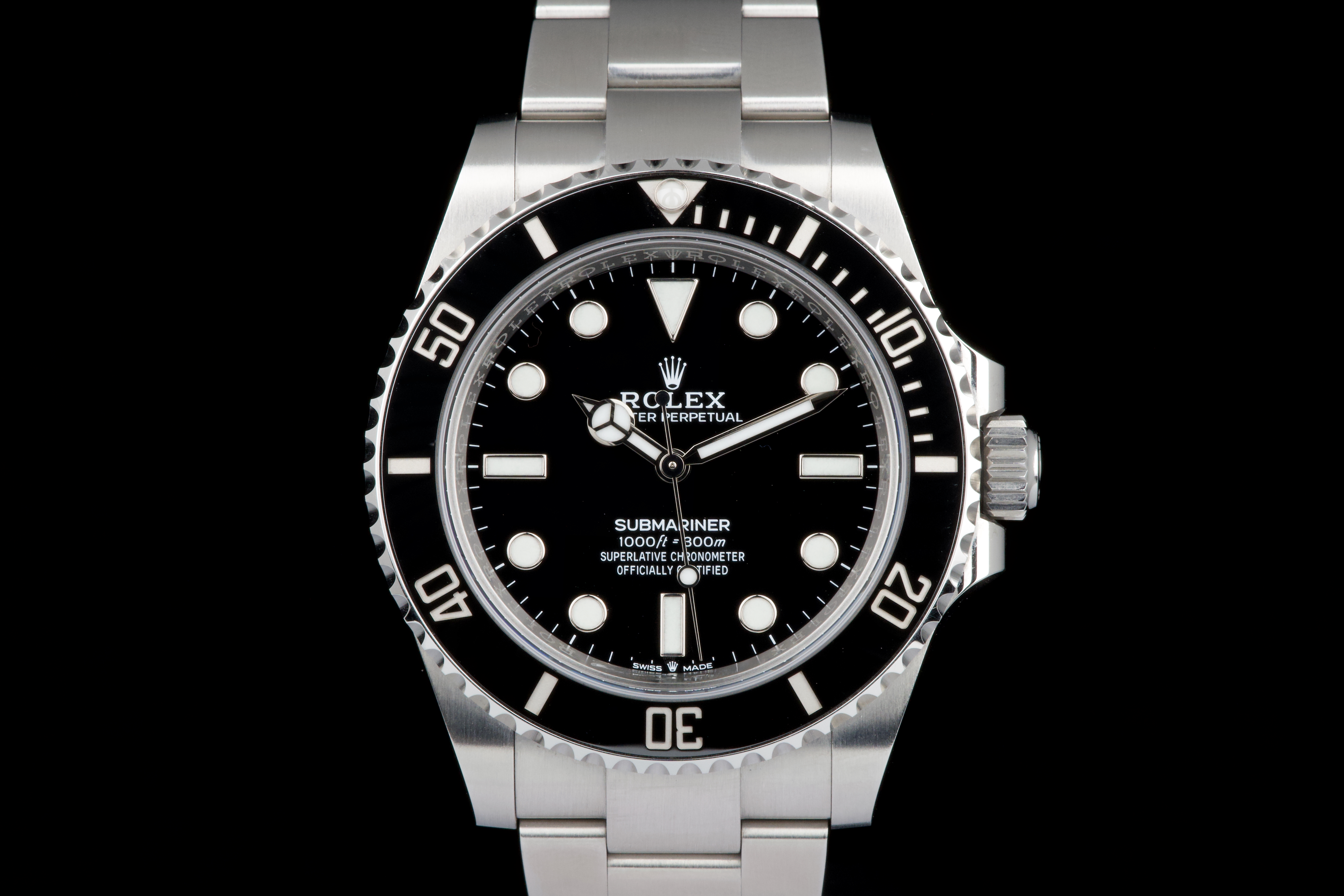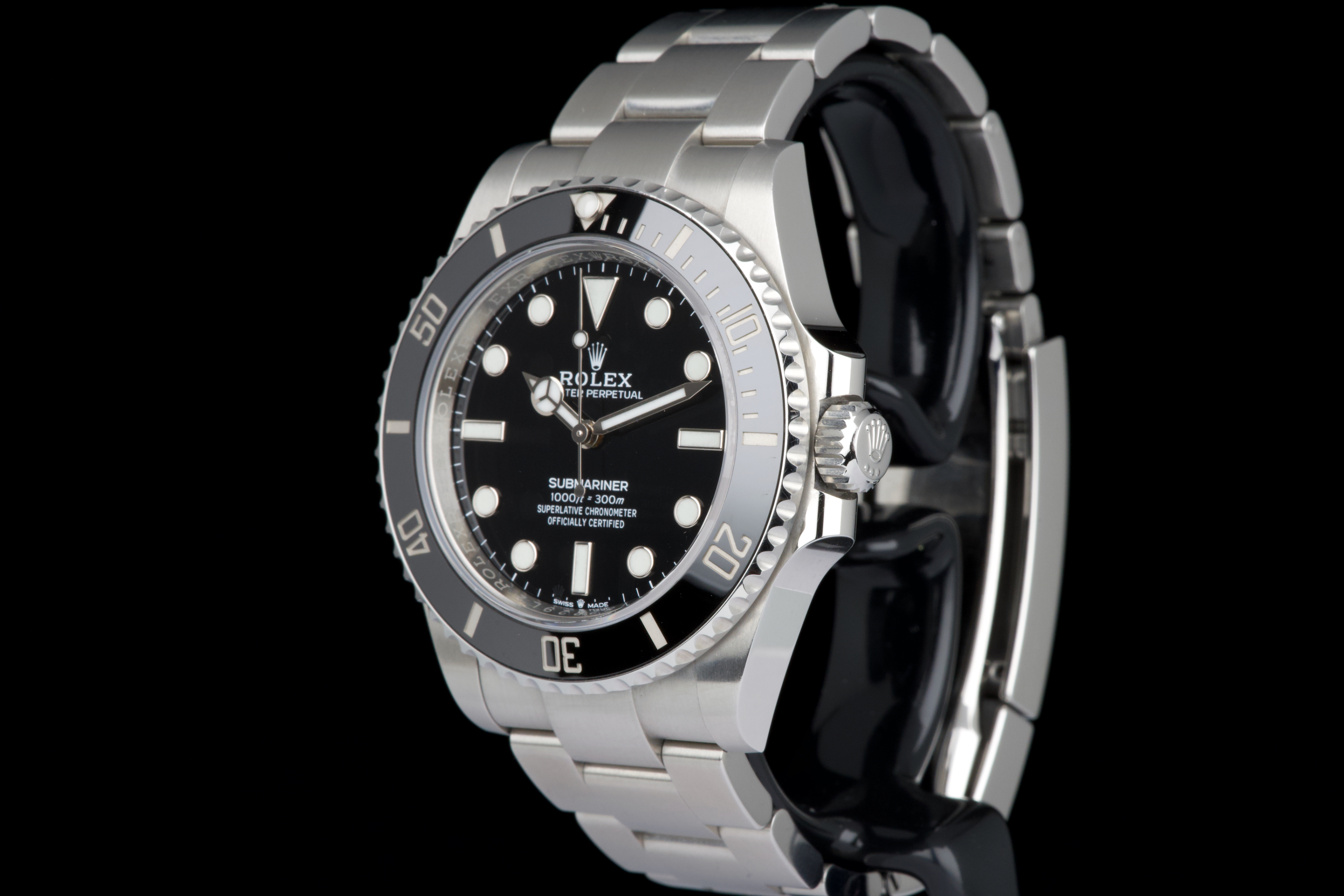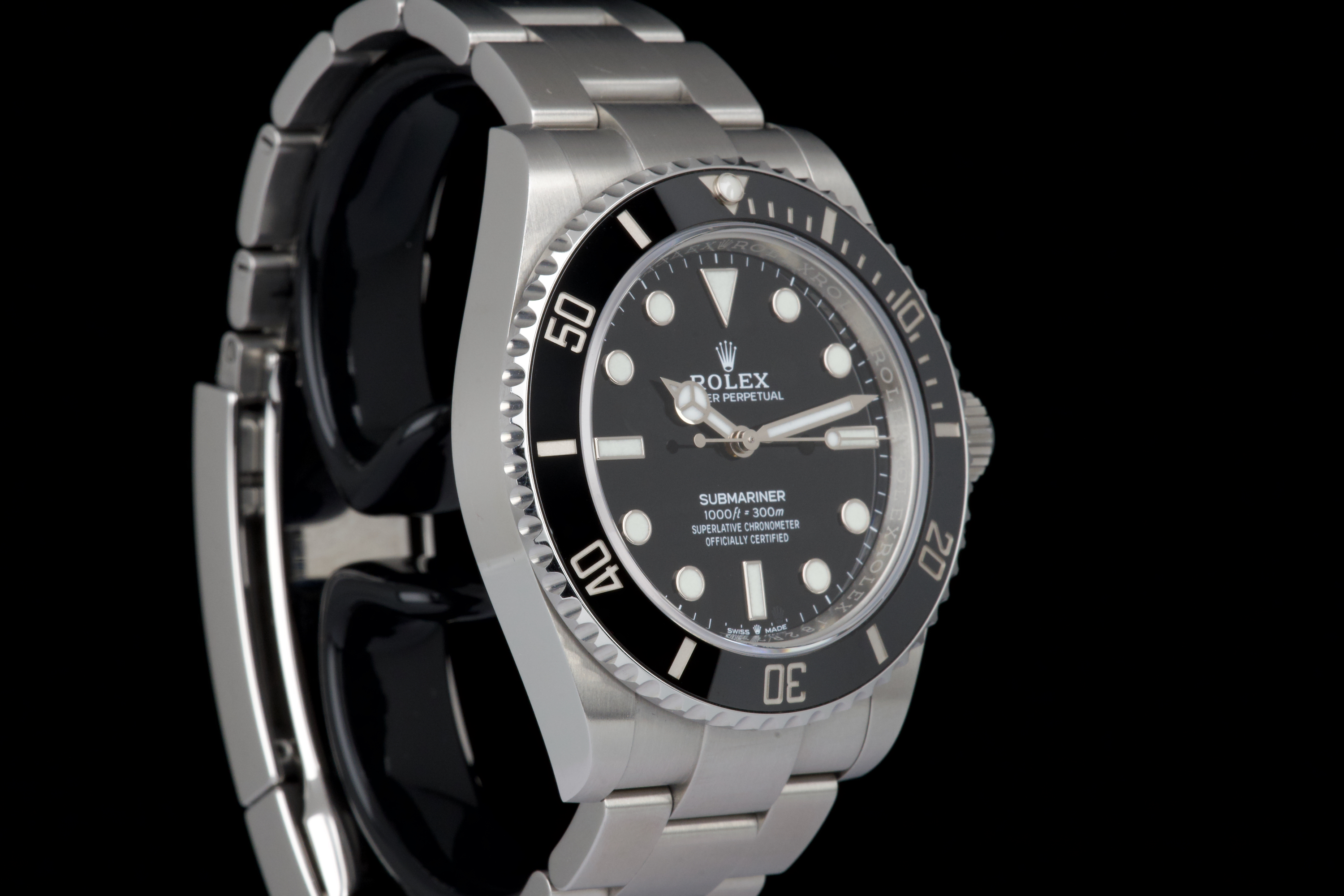 Presented here is a contemporary and highly desirable example of the Rolex Submariner reference 124060LN, the classic no-date Submariner in stainless steel. Launched as part of Rolex’s modern Submariner line, this model combines iconic design, robust performance, and everyday wearability, representing the ultimate expression of the professional dive watch. This example dates to 2023 and has just been professionally polished by our watchmaker, presenting in top condition with crisp case lines and a flawless overall appearance. The black dial and Cerachrom bezel retain their sharp contrast and perfect legibility, while the Oyster bracelet remains robust and comfortable on the wrist. Offered as a full set with its original box, papers, and accessories, this 124060LN represents an excellent opportunity to acquire a nearly new, fully documented Submariner in pristine condition, combining contemporary design, technical reliability, and strong collector appeal.