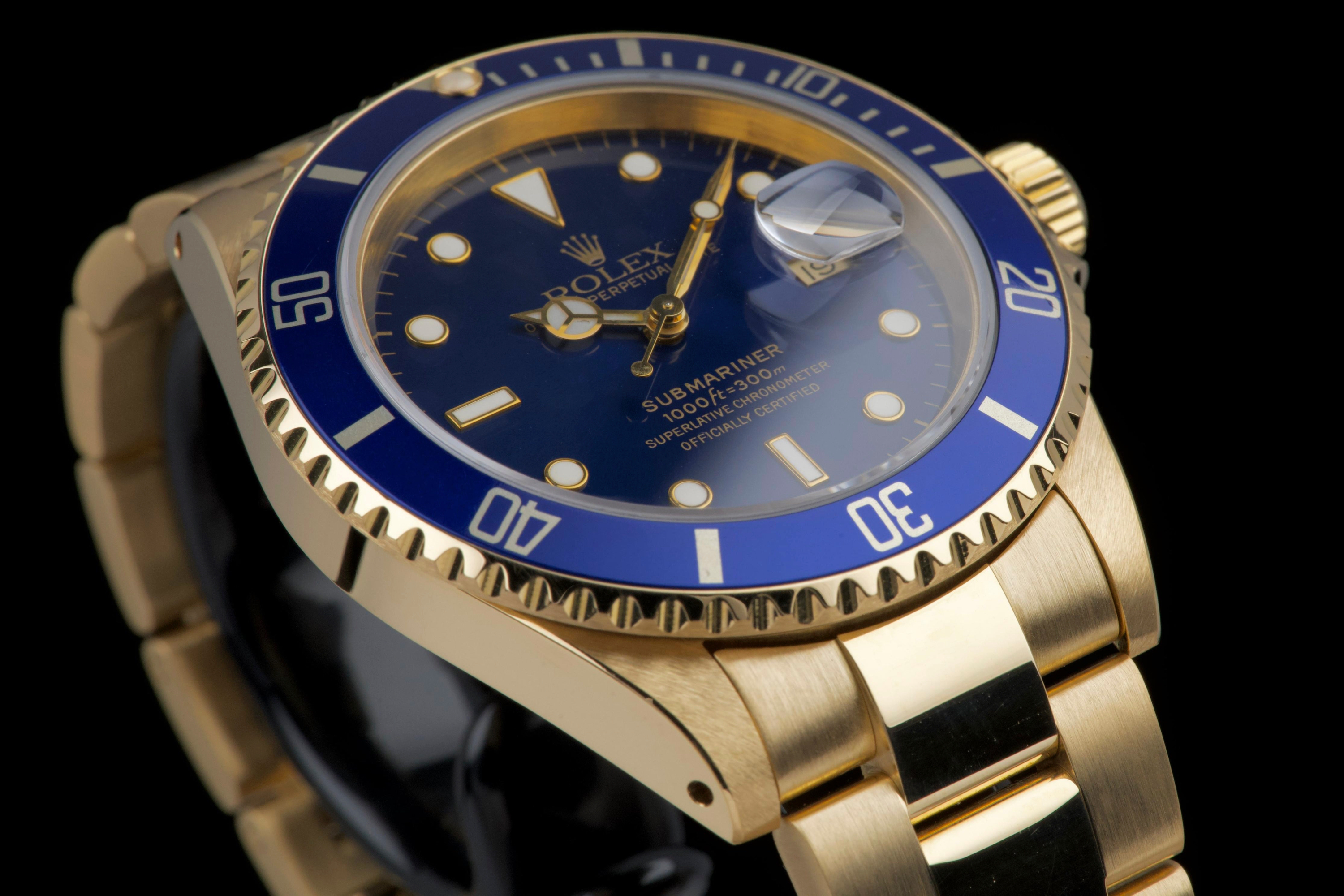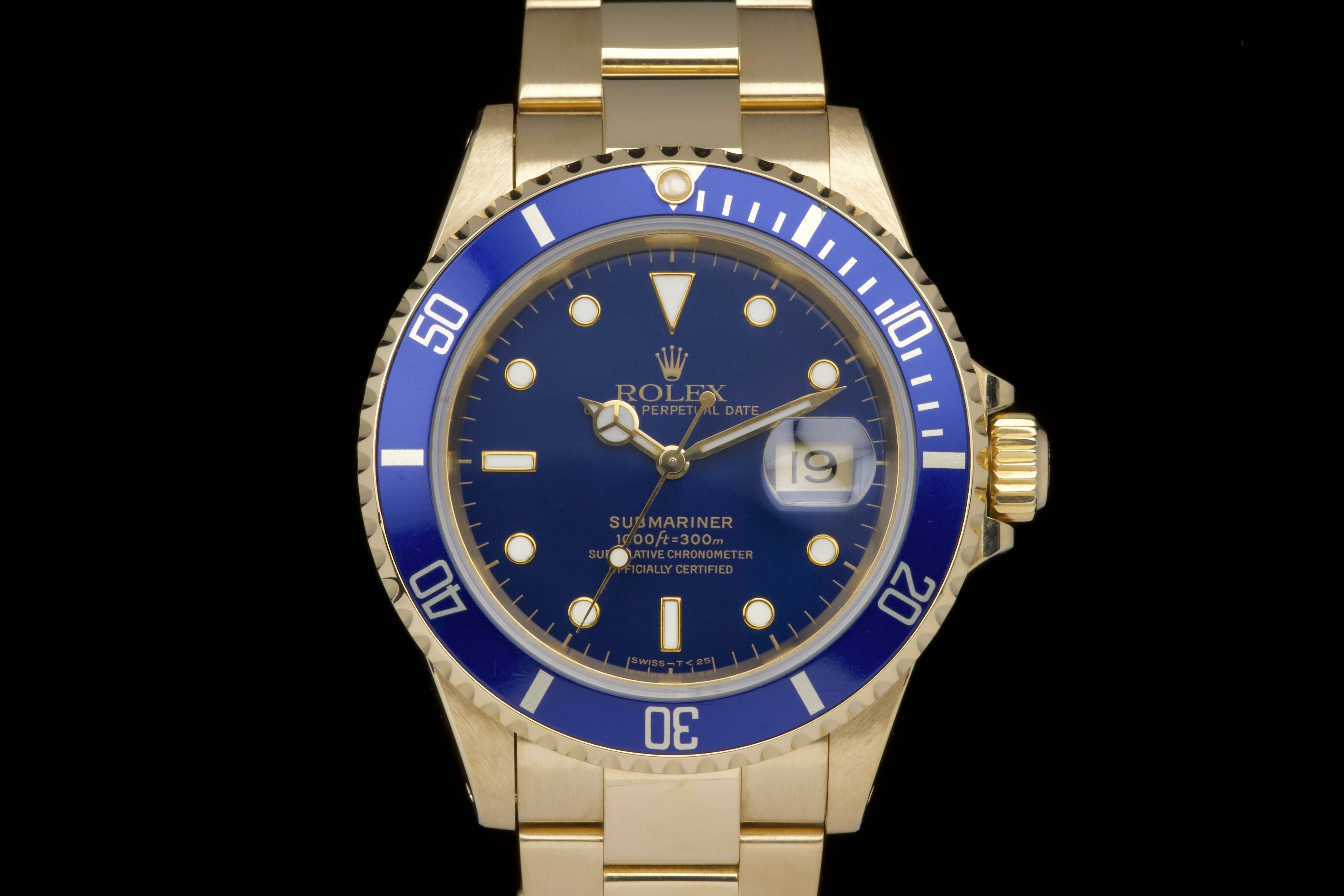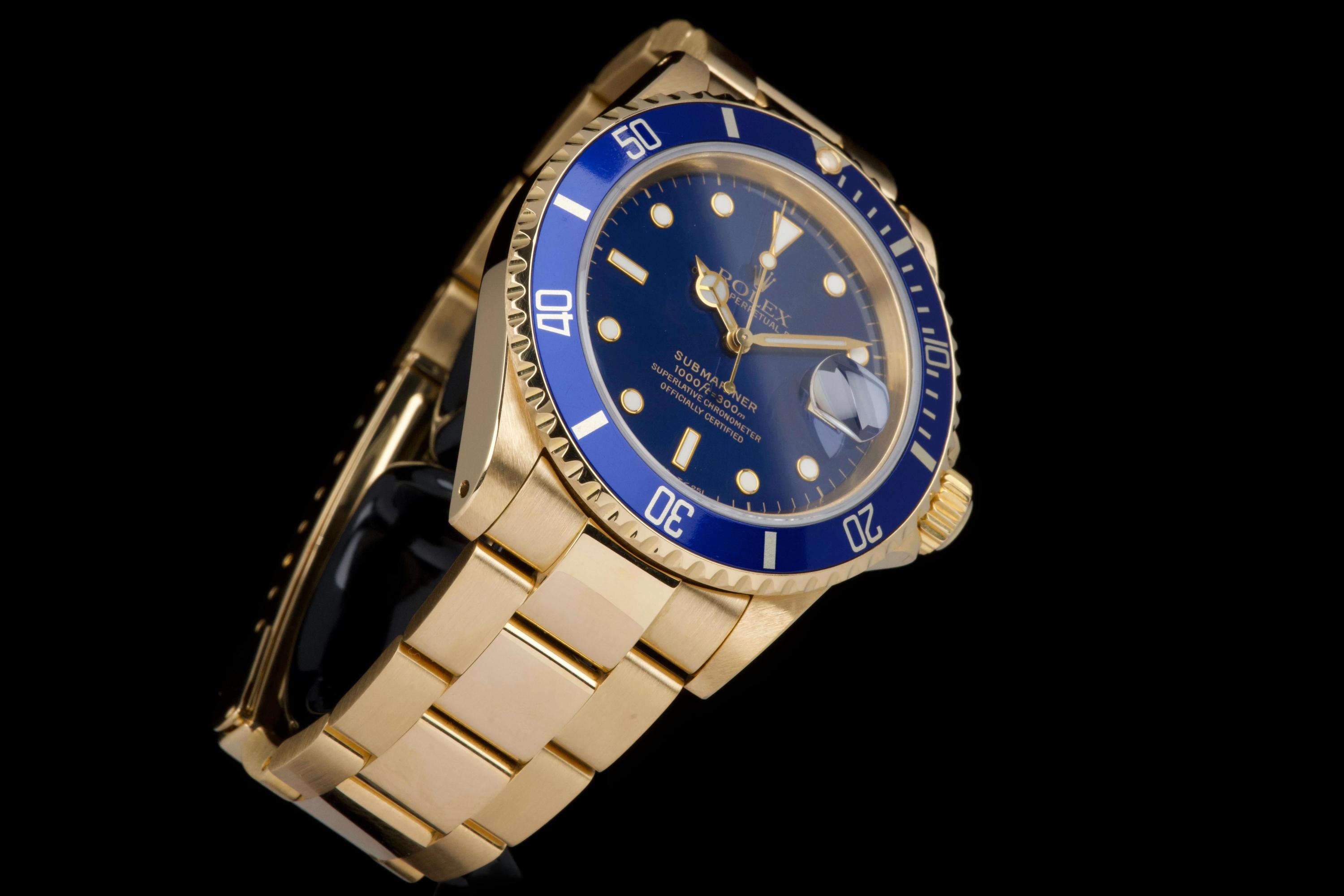 Presented here is a well-preserved example of the Rolex Submariner Date reference 16618, featuring the classic blue dial and matching bezel. Bearing an X serial, the watch was produced in 1991 and originally sold in 1999 by the renowned Chrono-Time boutique in Geneva, with a copy of the original invoice accompanying the watch. This is a one-owner piece, offering clear and documented provenance. The watch is offered with an extensive full set, including the wooden presentation box, outer packaging, anchor, booklets, calendar, original warranty with leather holder, as well as service papers and a Bucherer Geneva invoice dated 2006. Recently serviced and polished by our watchmaker in 2026, the watch presents in excellent overall condition while retaining its original tritium dial and matching hands, along with the original blue bezel insert. The yellow gold Oyster bracelet shows no noticeable stretch from use. A correct and attractive example of a classic gold Submariner, combining honest condition, strong documentation, and appealing completeness.
