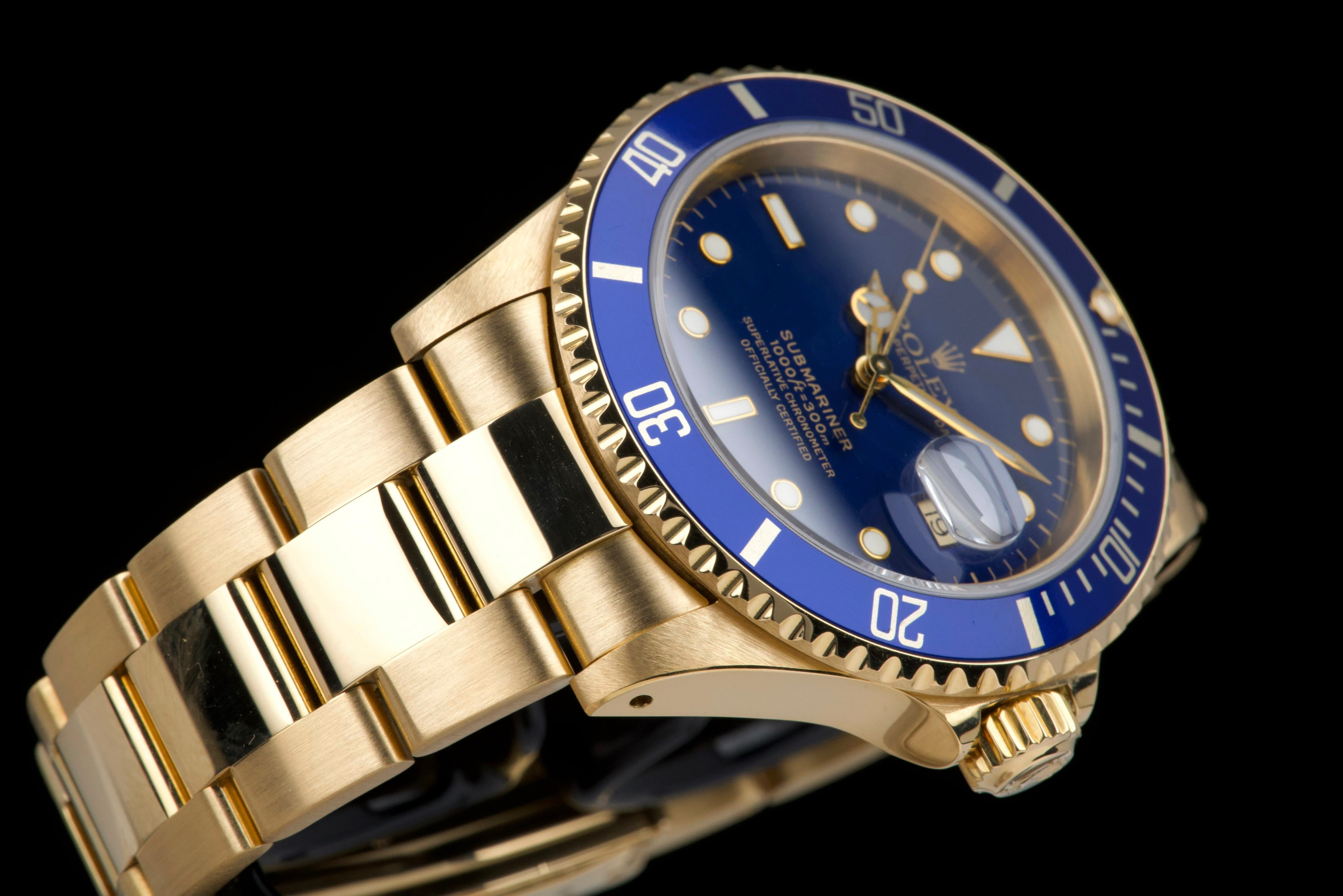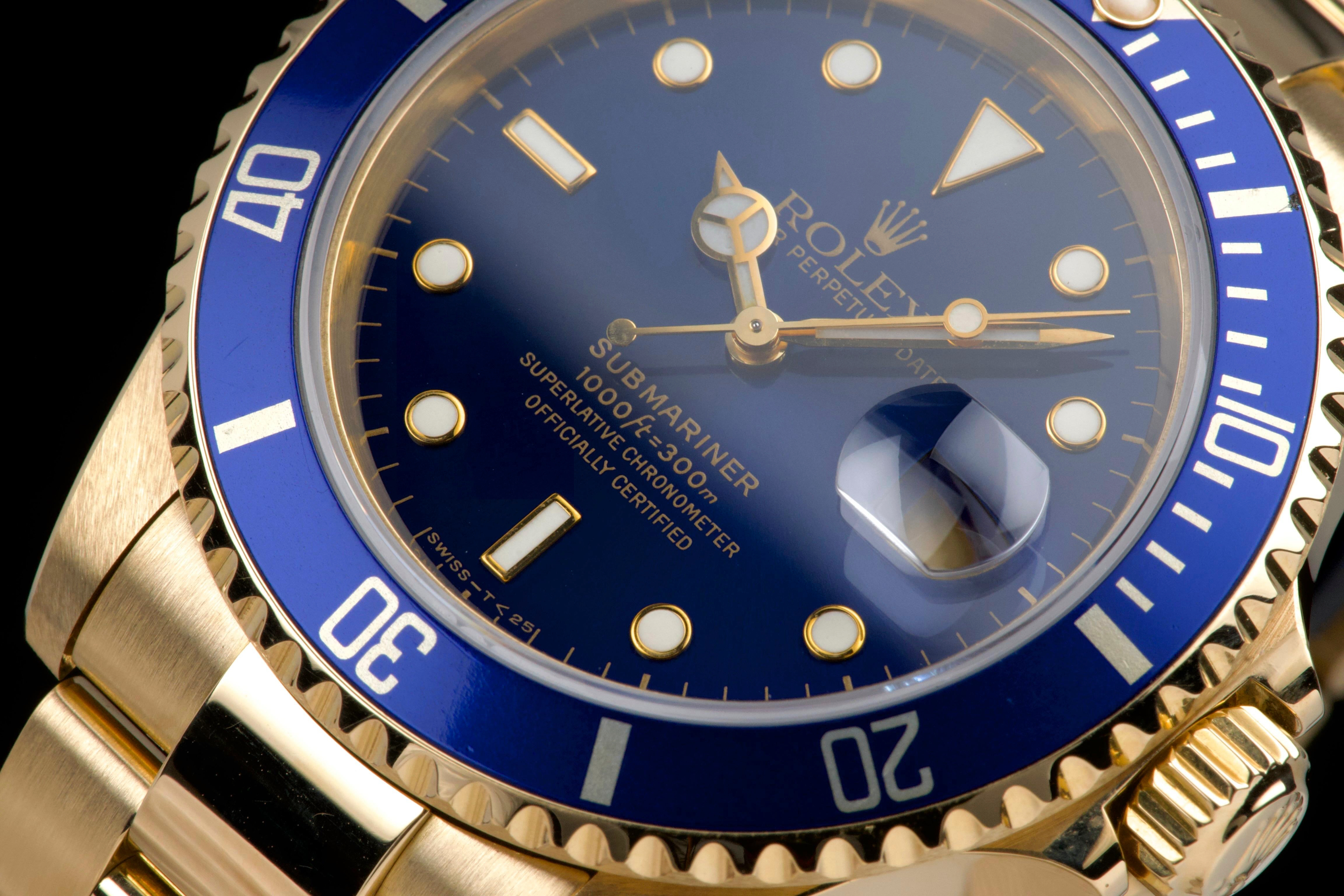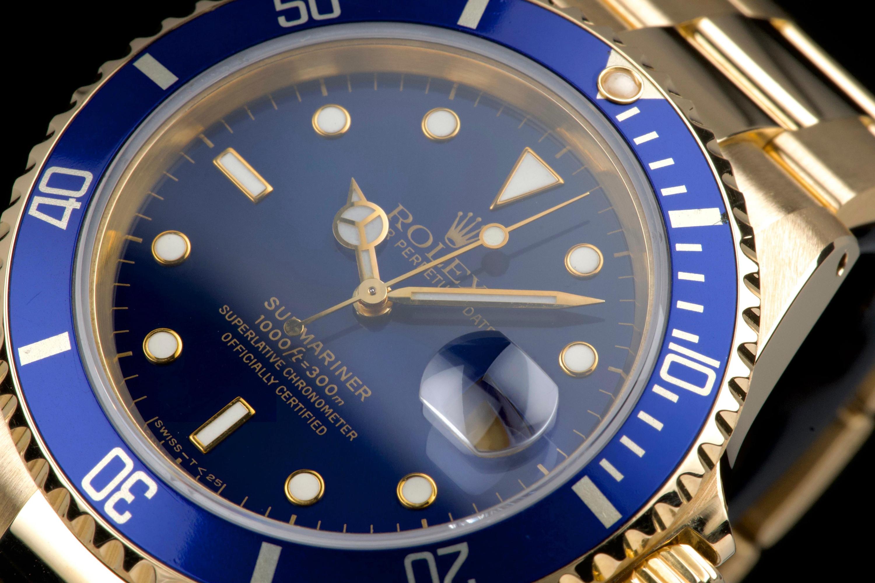 Presented here is a well-preserved example of the Rolex Submariner Date reference 16618, featuring the classic blue dial and matching bezel. Bearing an X serial, the watch was produced in 1991 and originally sold in 1999 by the renowned Chrono-Time boutique in Geneva, with a copy of the original invoice accompanying the watch. This is a one-owner piece, offering clear and documented provenance. The watch is offered with an extensive full set, including the wooden presentation box, outer packaging, anchor, booklets, calendar, original warranty with leather holder, as well as service papers and a Bucherer Geneva invoice dated 2006. Recently serviced and polished by our watchmaker in 2026, the watch presents in excellent overall condition while retaining its original tritium dial and matching hands, along with the original blue bezel insert. The yellow gold Oyster bracelet shows no noticeable stretch from use. A correct and attractive example of a classic gold Submariner, combining honest condition, strong documentation, and appealing completeness.