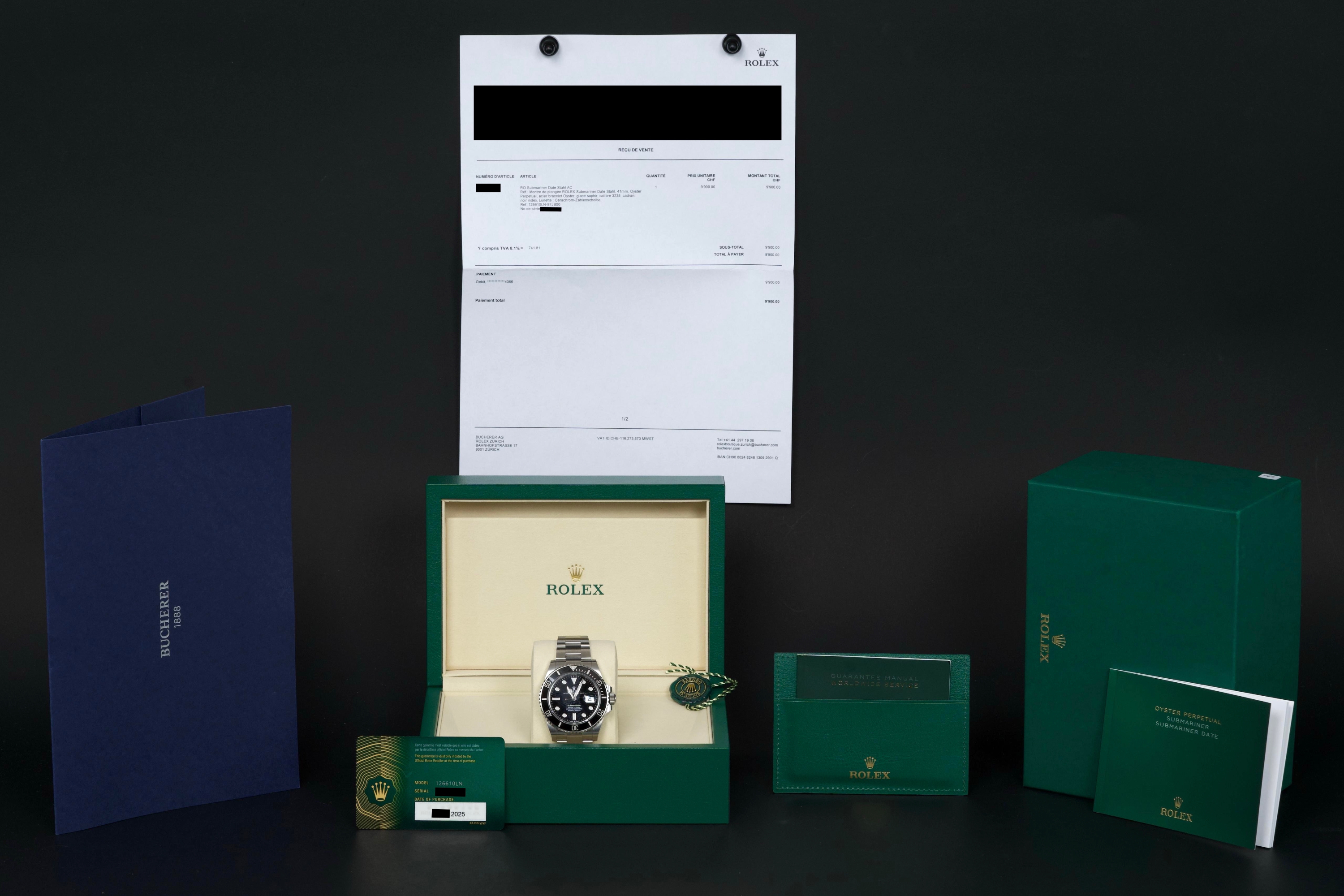 A superb example of the Rolex Submariner Date 126610LN, offered in mint, unpolished condition, having been worn only twice. The watch remains extremely sharp with virtually no signs of wear. It comes as a full set from 2025, including box, papers, booklets, and all accessories. A like-new Submariner Date — the perfect modern classic.