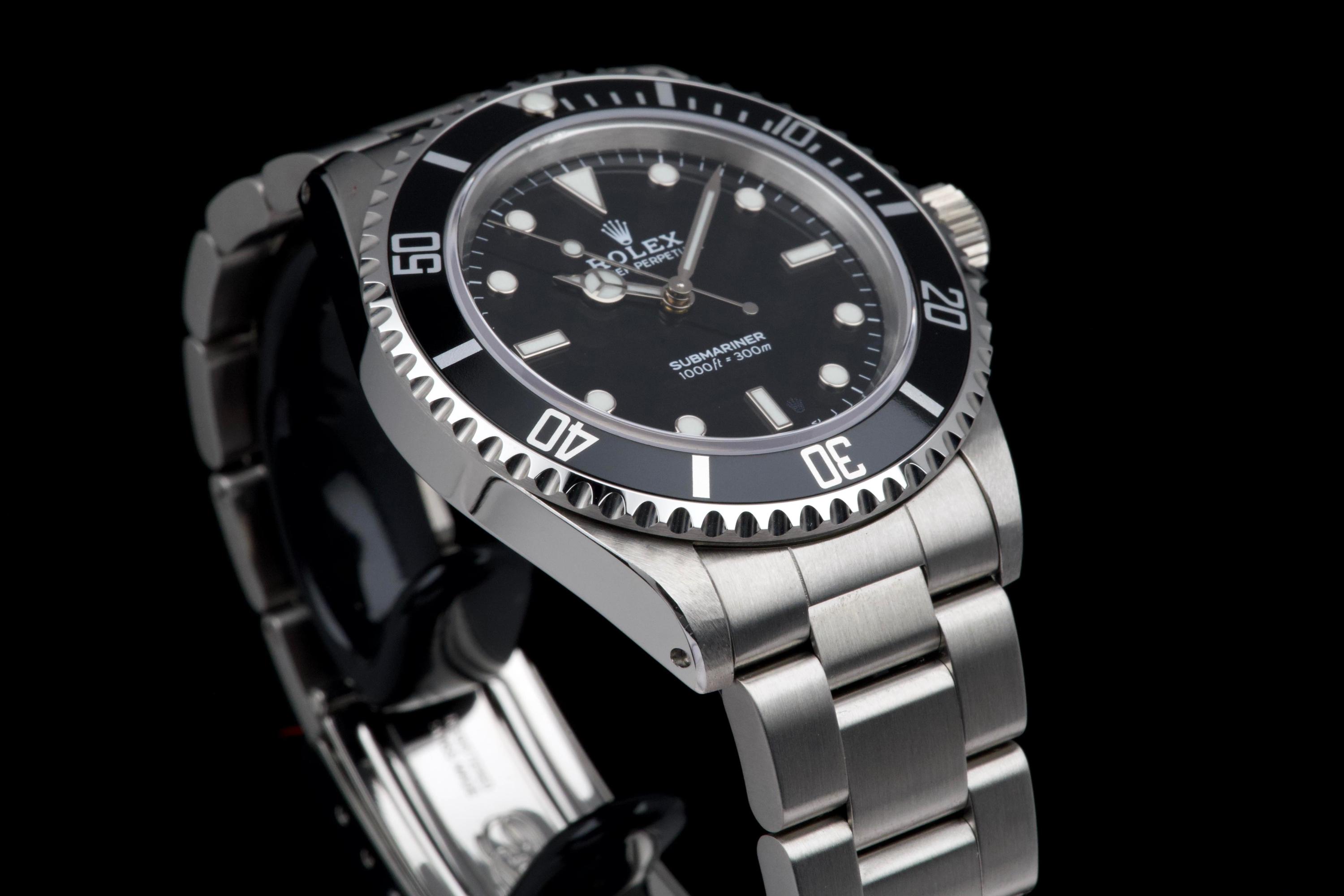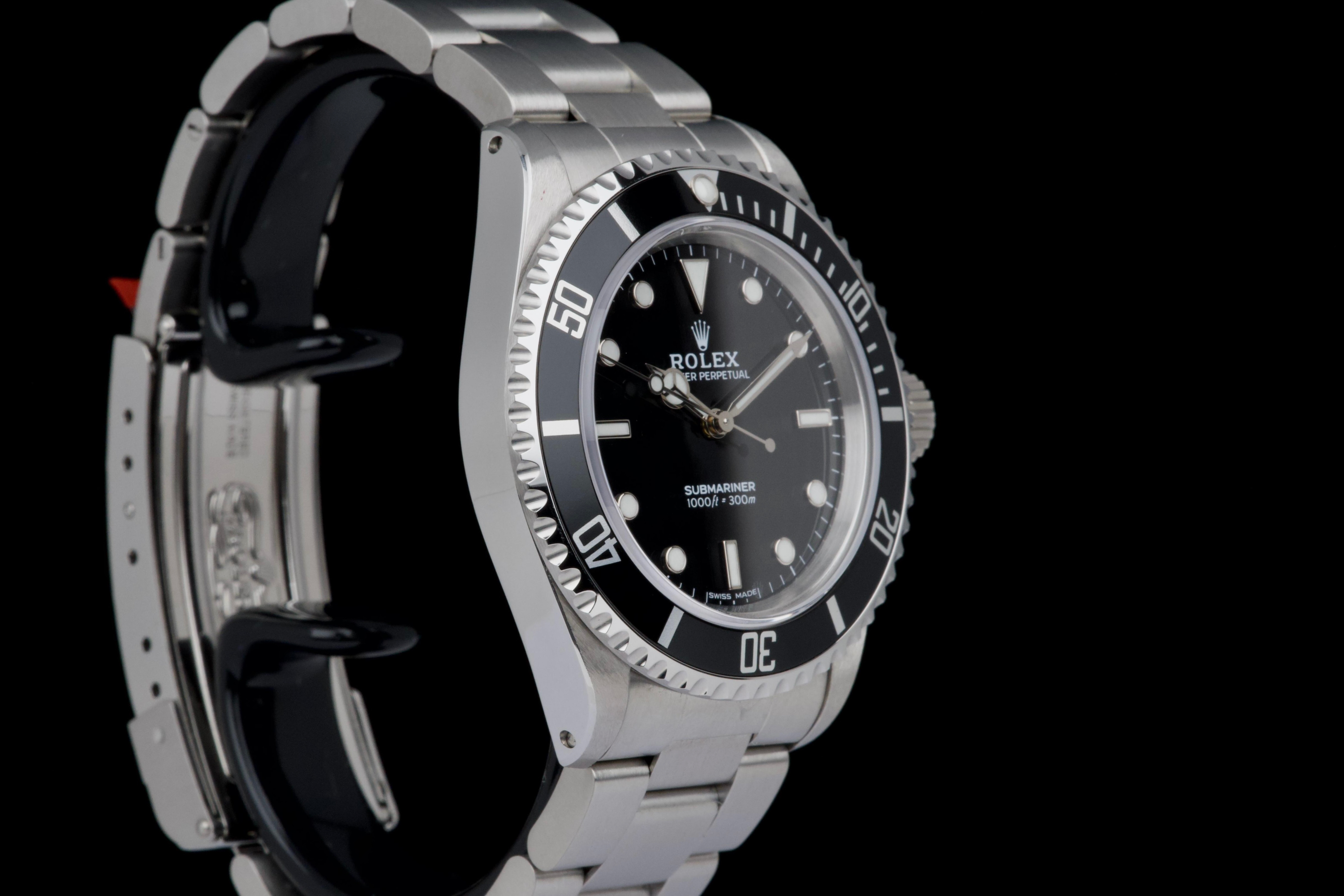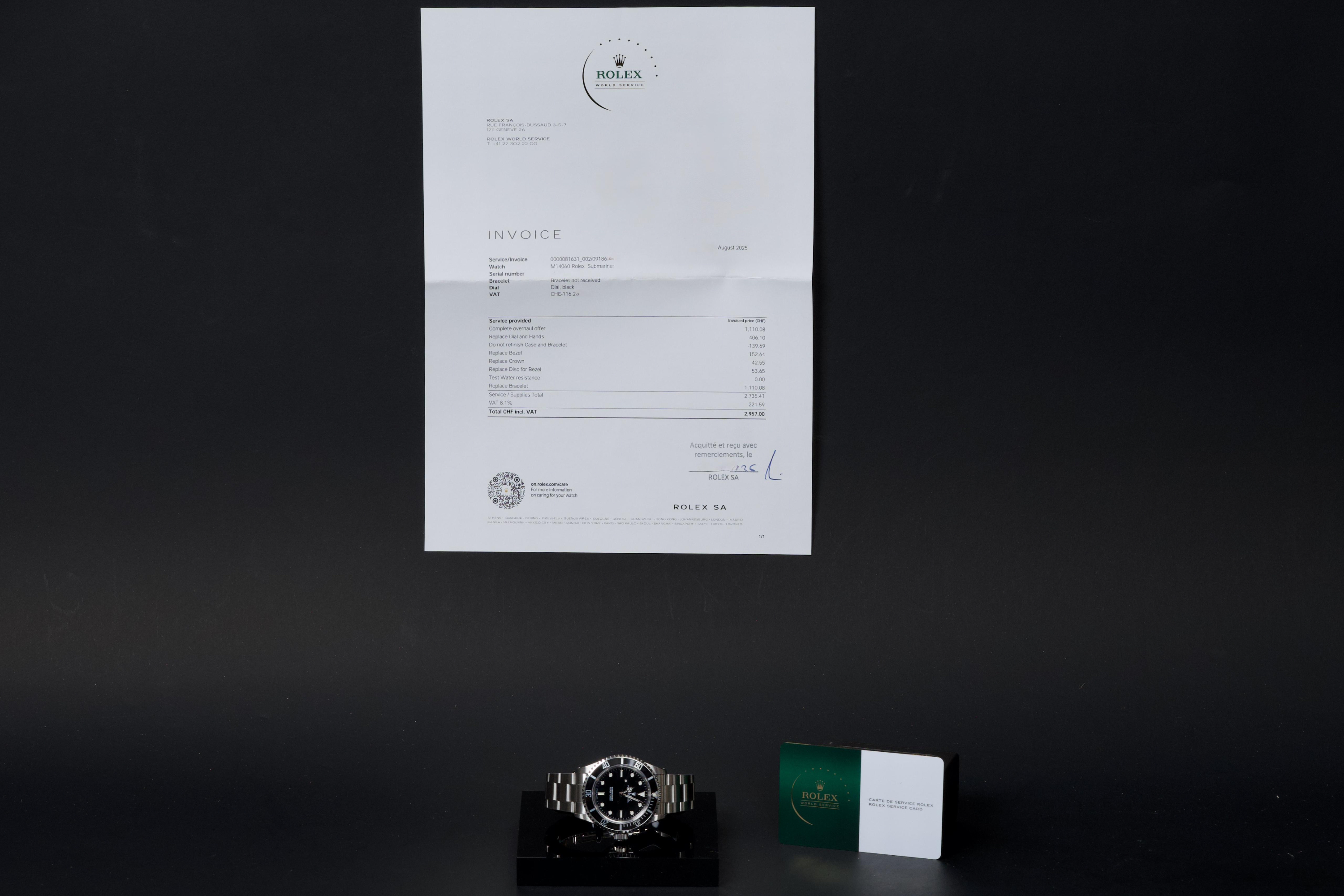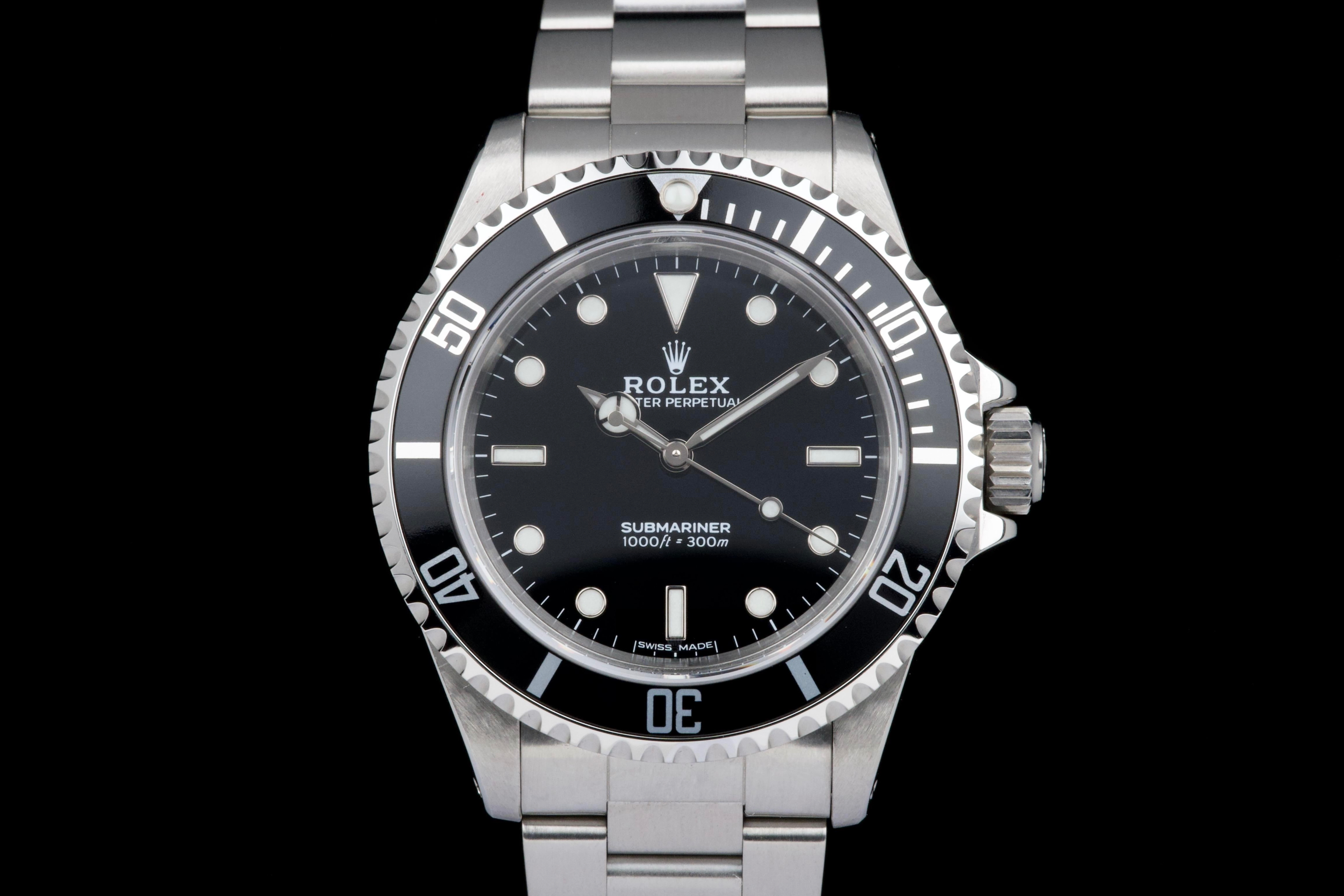 Rolex Submariner, reference 14060, stainless steel wristwatch with no-date display and bracelet, P serial, circa 2001. A quintessential expression of Rolex’s iconic dive watch, the present Submariner reference 14060 is celebrated for its clean, symmetrical dial without date, offering a pure and highly legible aesthetic. Produced in 2001 and belonging to the P serial range, this model embodies the timeless design and robust construction that have made the Submariner one of the most recognizable tool watches ever created. The watch is housed in a 40 mm stainless steel Oyster case, fitted with a unidirectional rotating bezel and sapphire crystal, ensuring durability and functionality in line with its professional diving heritage. The dial features luminous hour markers and hands, providing excellent readability in all conditions. At its heart beats a reliable Rolex automatic movement, known for its precision and robustness. The timepiece underwent a complete service at Rolex in 2025, including a full overhaul of the movement, replacement of the dial, replacement of the hands, replacement of the bezel, replacement of the insert, replacement of the crown, and replacement of the bracelet. Following this extensive intervention, the watch is presented in excellent mechanical and aesthetic condition, offering the reliability and appearance of a refreshed example. Combining the purity of the no-date Submariner with the reassurance of a comprehensive recent manufacture service, this reference 14060 represents an attractive opportunity to acquire a classic Rolex sports watch in outstanding condition.