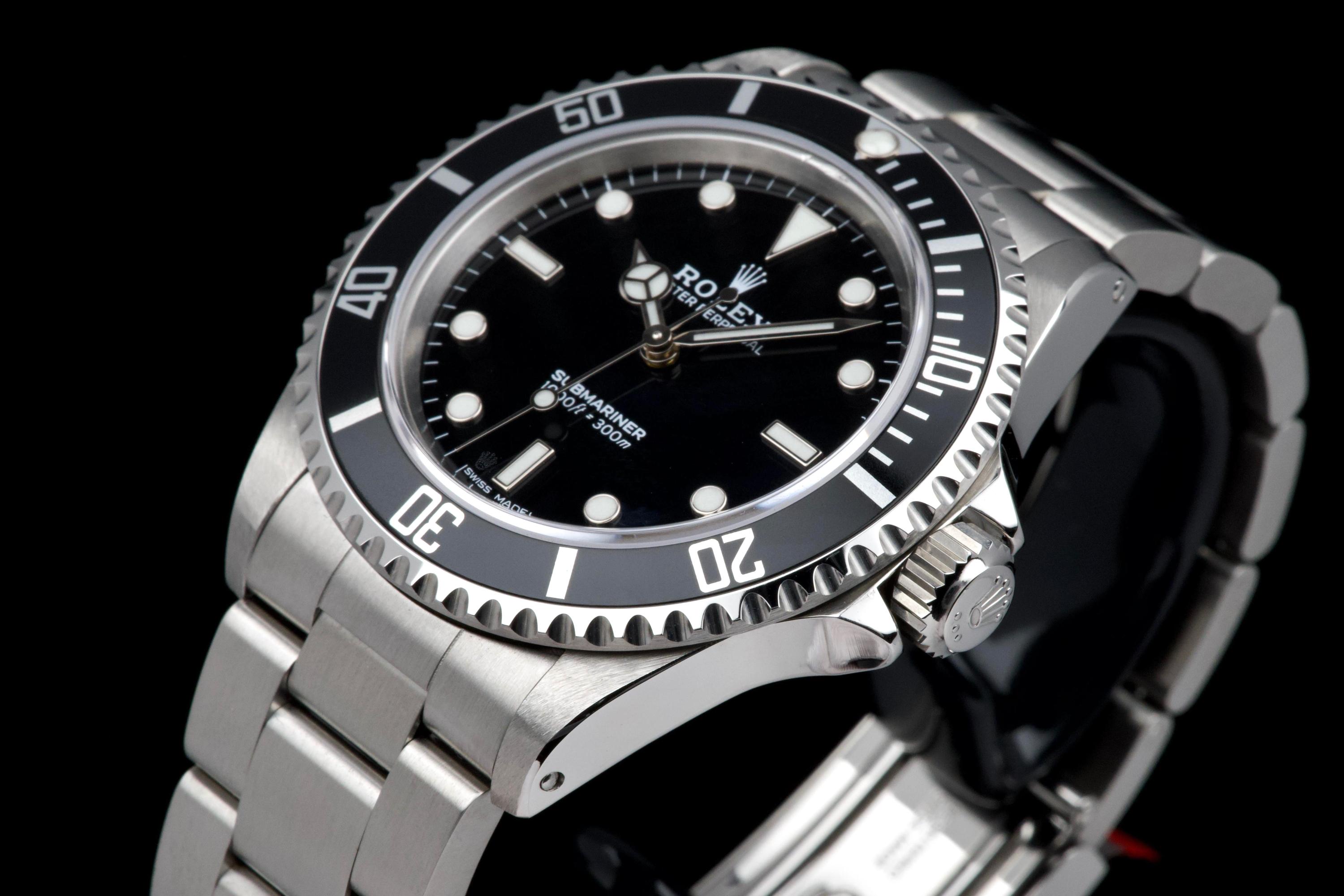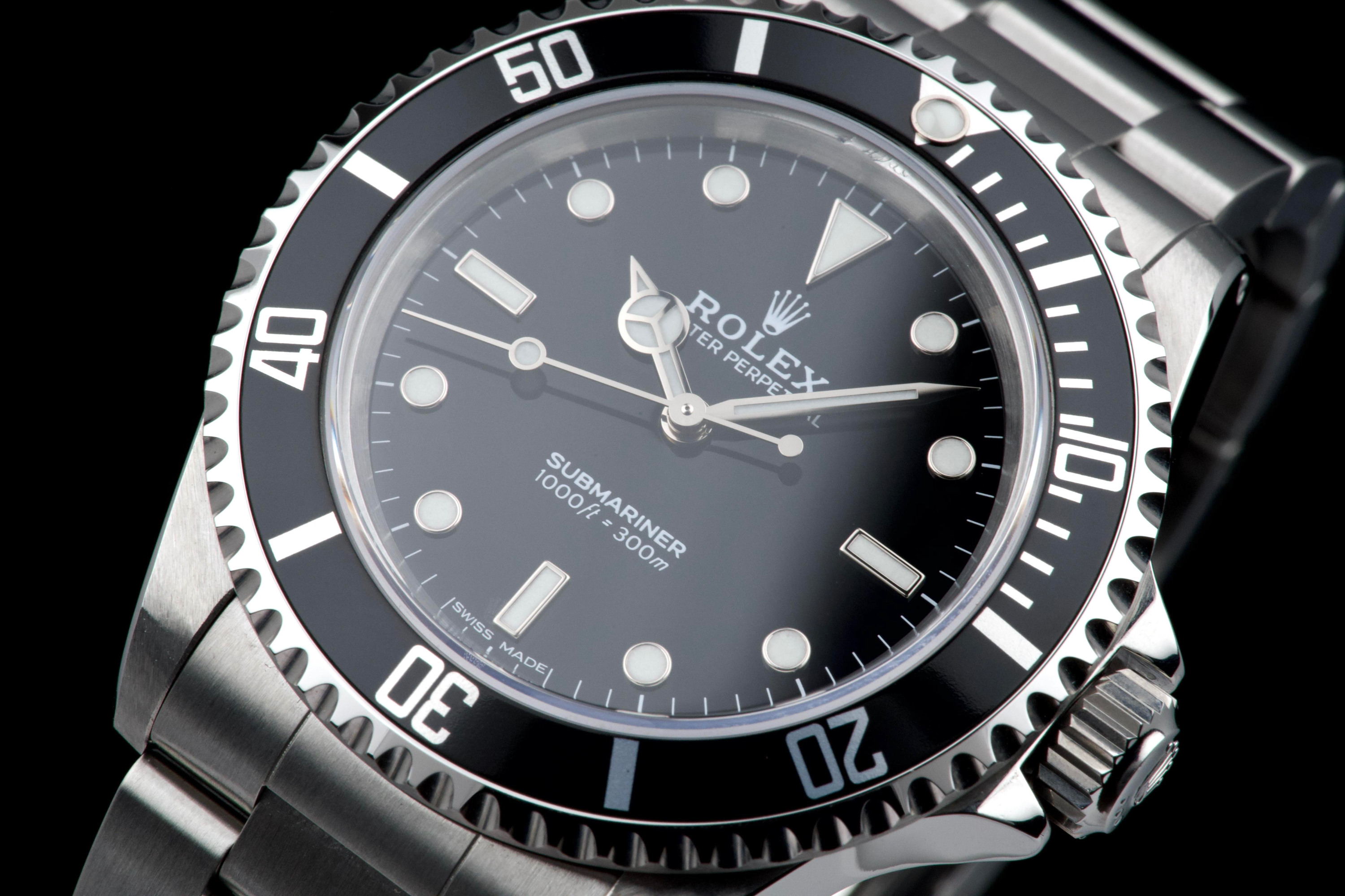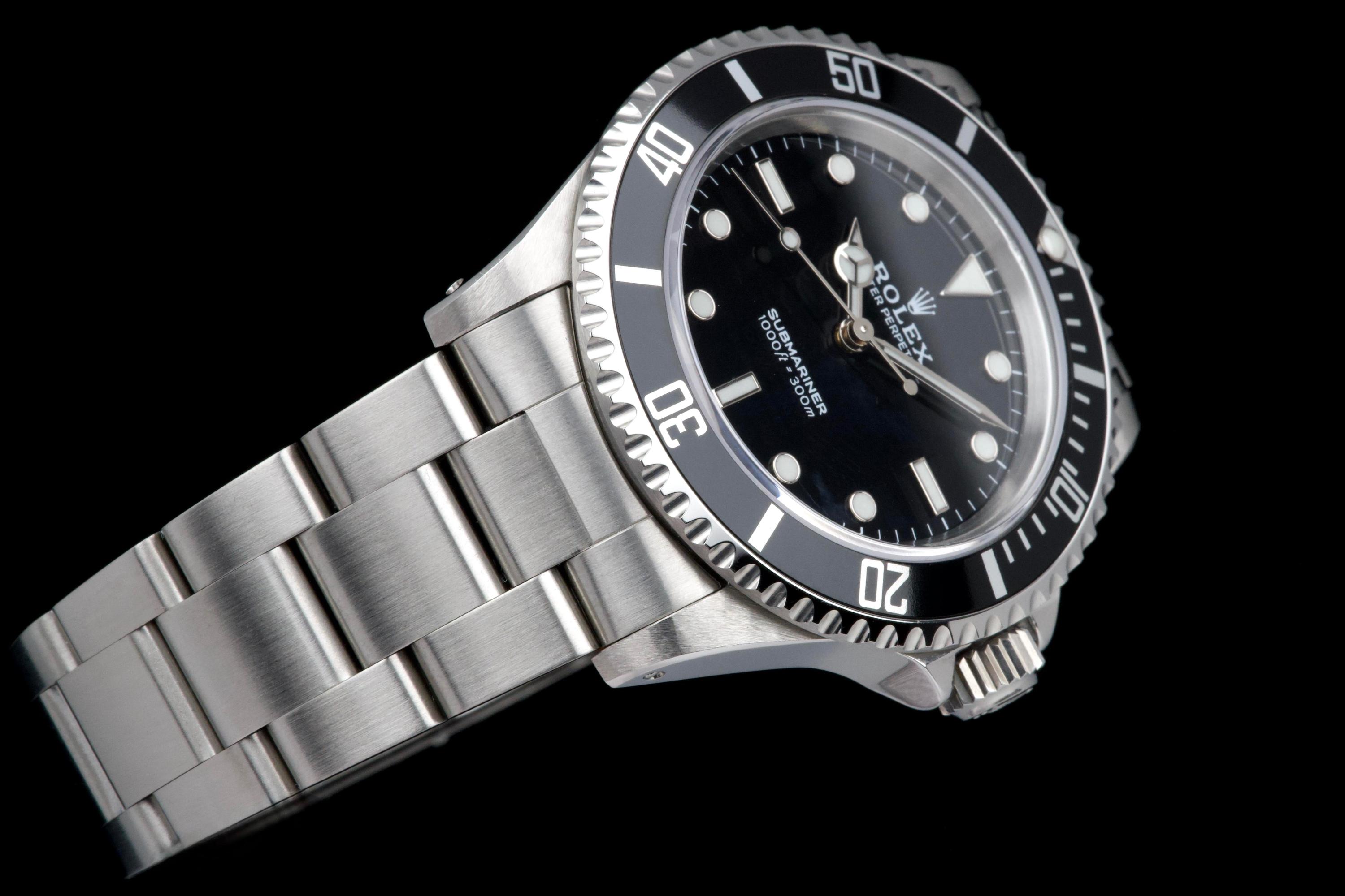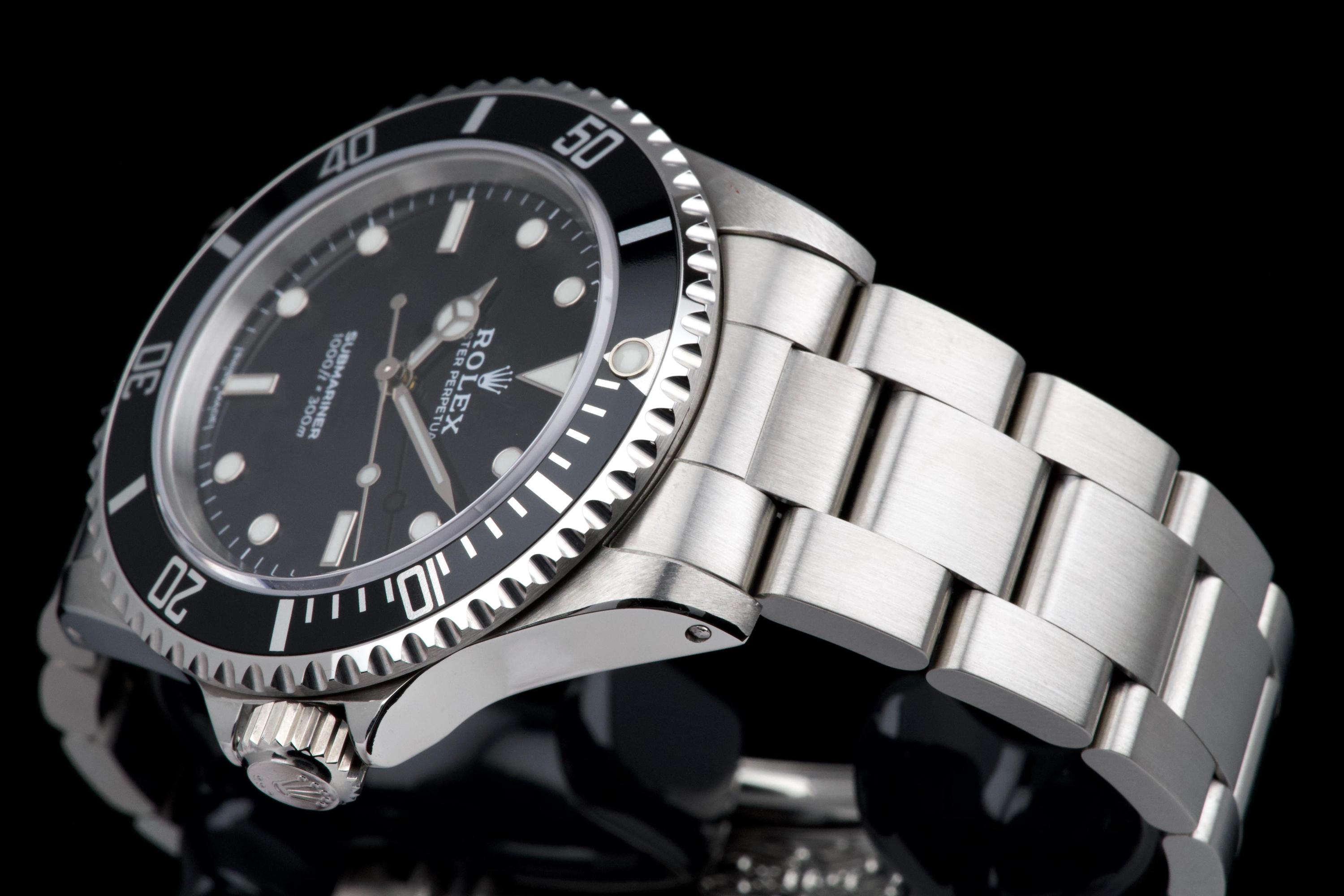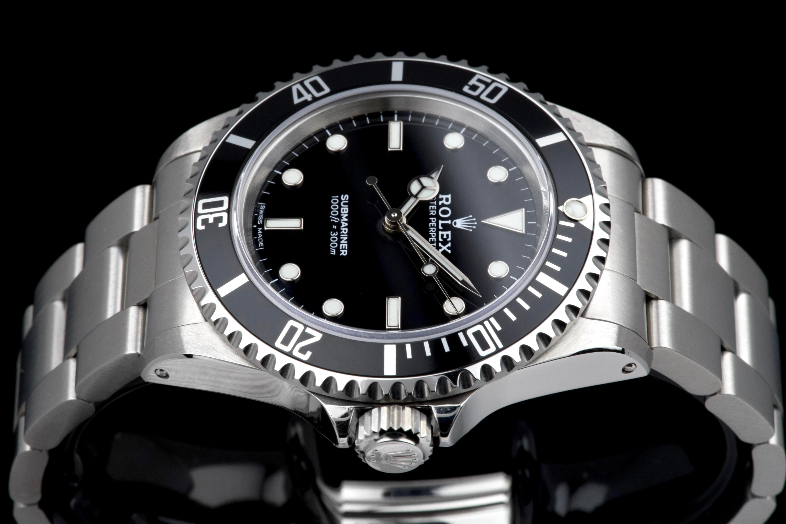 Rolex Submariner, reference 14060, stainless steel wristwatch with no-date display and bracelet, P serial, circa 2001. A quintessential expression of Rolex’s iconic dive watch, the present Submariner reference 14060 is celebrated for its clean, symmetrical dial without date, offering a pure and highly legible aesthetic. Produced in 2001 and belonging to the P serial range, this model embodies the timeless design and robust construction that have made the Submariner one of the most recognizable tool watches ever created. The watch is housed in a 40 mm stainless steel Oyster case, fitted with a unidirectional rotating bezel and sapphire crystal, ensuring durability and functionality in line with its professional diving heritage. The dial features luminous hour markers and hands, providing excellent readability in all conditions. At its heart beats a reliable Rolex automatic movement, known for its precision and robustness. The timepiece underwent a complete service at Rolex in 2025, including a full overhaul of the movement, replacement of the dial, replacement of the hands, replacement of the bezel, replacement of the insert, replacement of the crown, and replacement of the bracelet. Following this extensive intervention, the watch is presented in excellent mechanical and aesthetic condition, offering the reliability and appearance of a refreshed example. Combining the purity of the no-date Submariner with the reassurance of a comprehensive recent manufacture service, this reference 14060 represents an attractive opportunity to acquire a classic Rolex sports watch in outstanding condition.