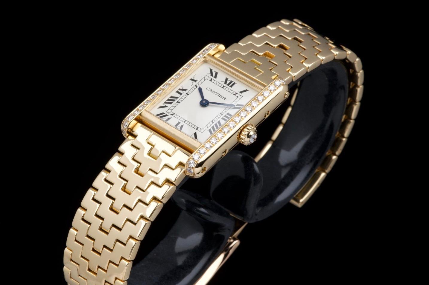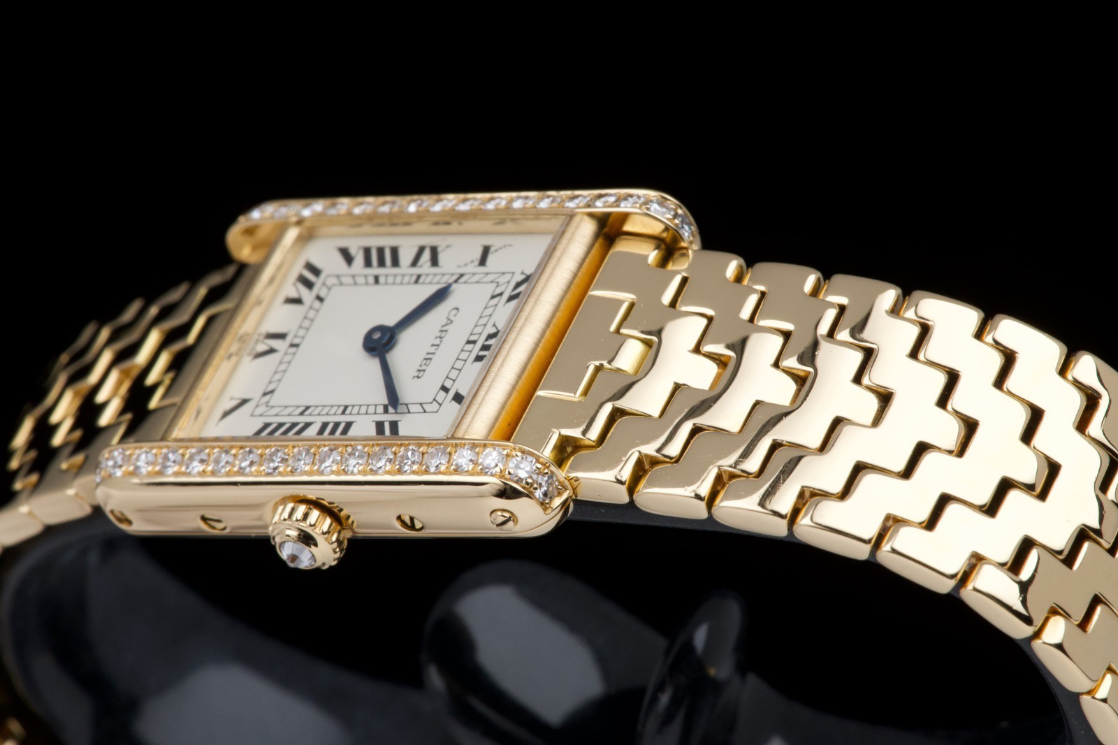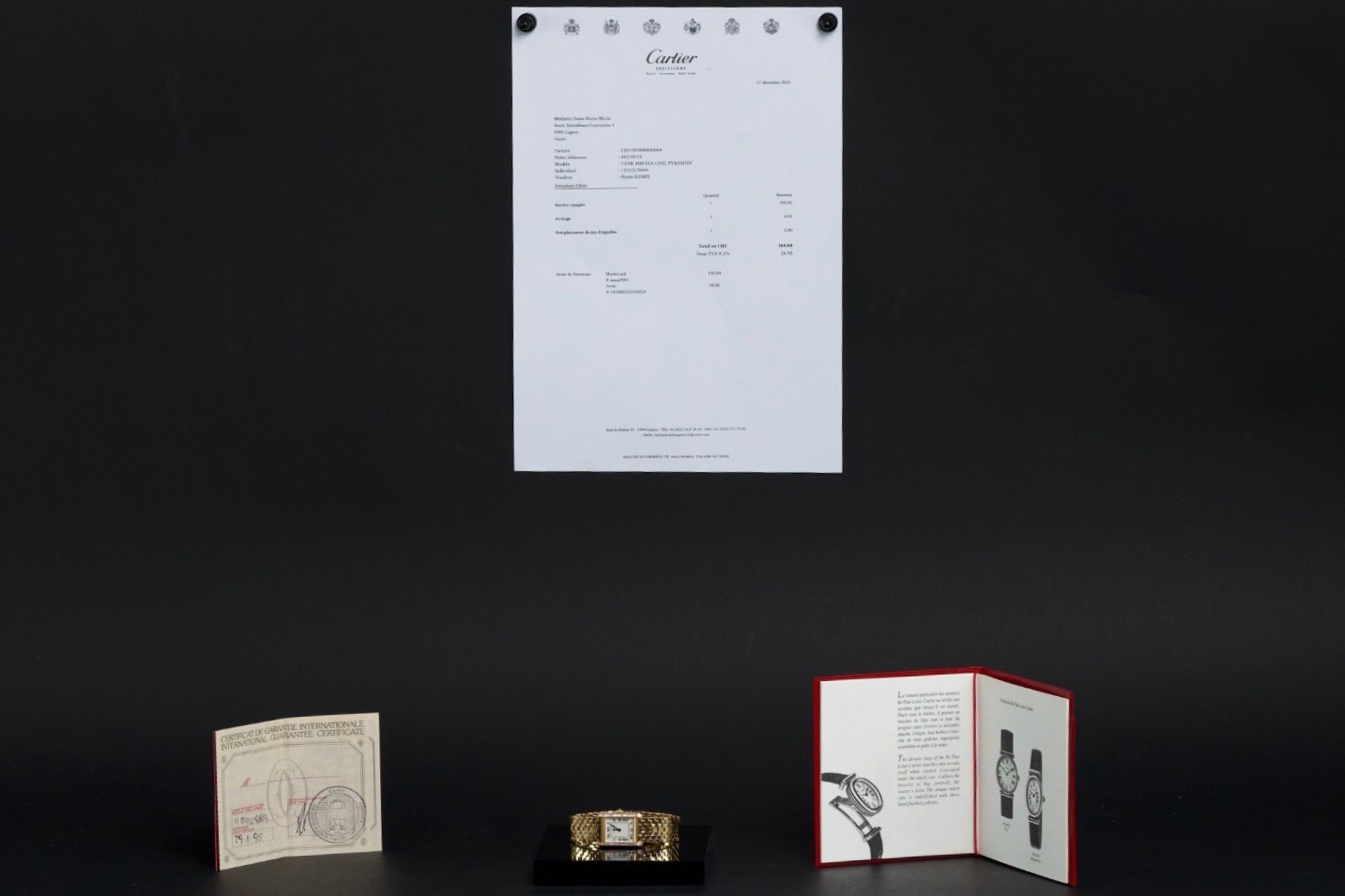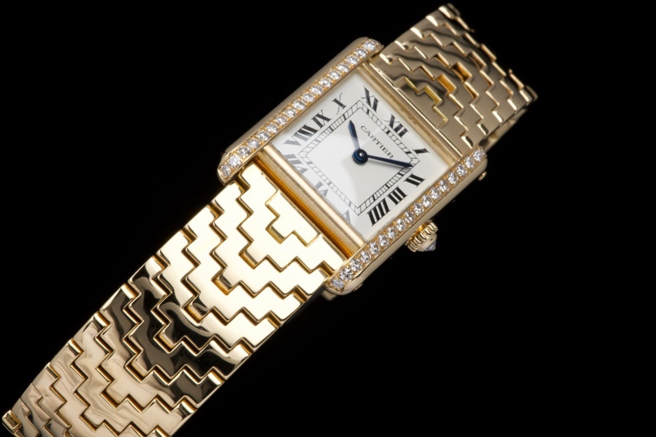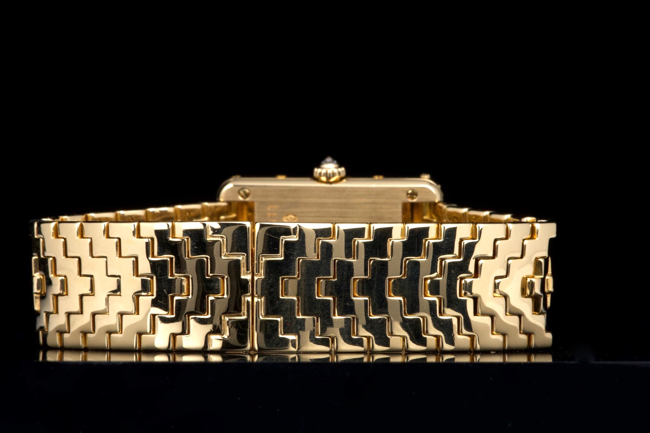 This Cartier Tank MM in yellow gold, dating from 1995, is an extremely rare example distinguished by its highly unusual Pyramide bracelet and diamond-set case. The square case is enhanced by a single row of diamonds set along both the left and right sides of the case, adding a subtle yet unmistakably luxurious accent while preserving the Tank’s iconic geometry. Even more exceptional is the original yellow gold Pyramide bracelet, a seldom-seen configuration that significantly elevates the collectability of the present watch. Offered from its first owner, the watch is accompanied by its original papers dated 1995 and benefits from a complete Cartier service carried out in 2025. Combining rarity, provenance, and recent manufacturer service, this watch represents a remarkable opportunity for collectors seeking an important and scarcely encountered variation of the Cartier Tank.