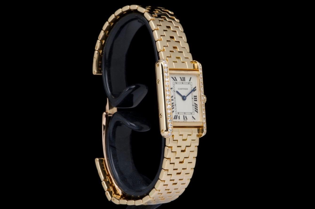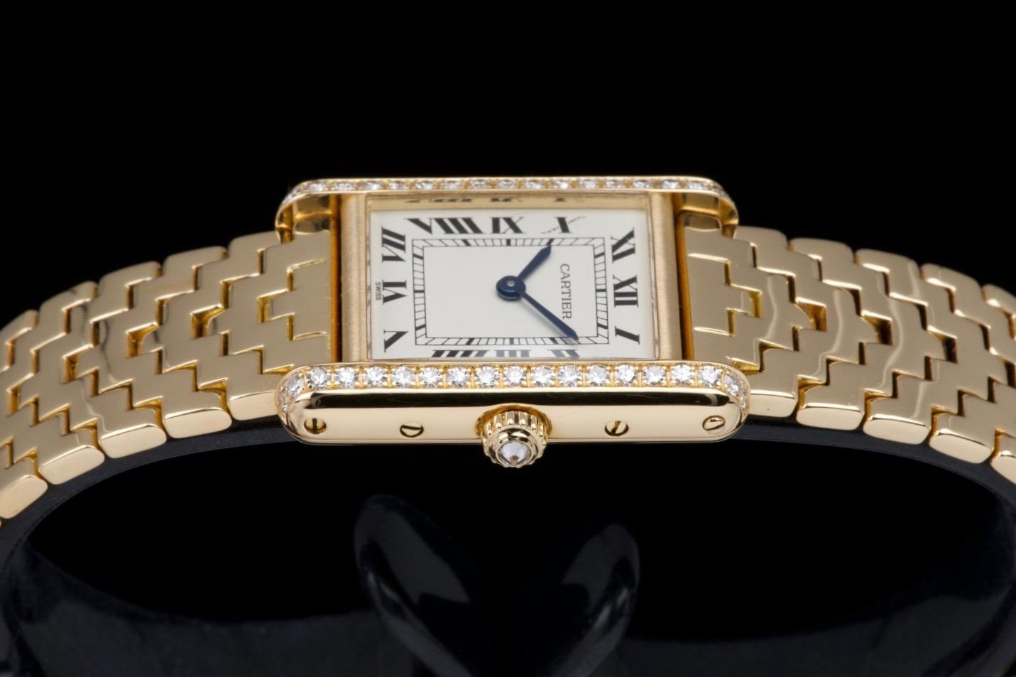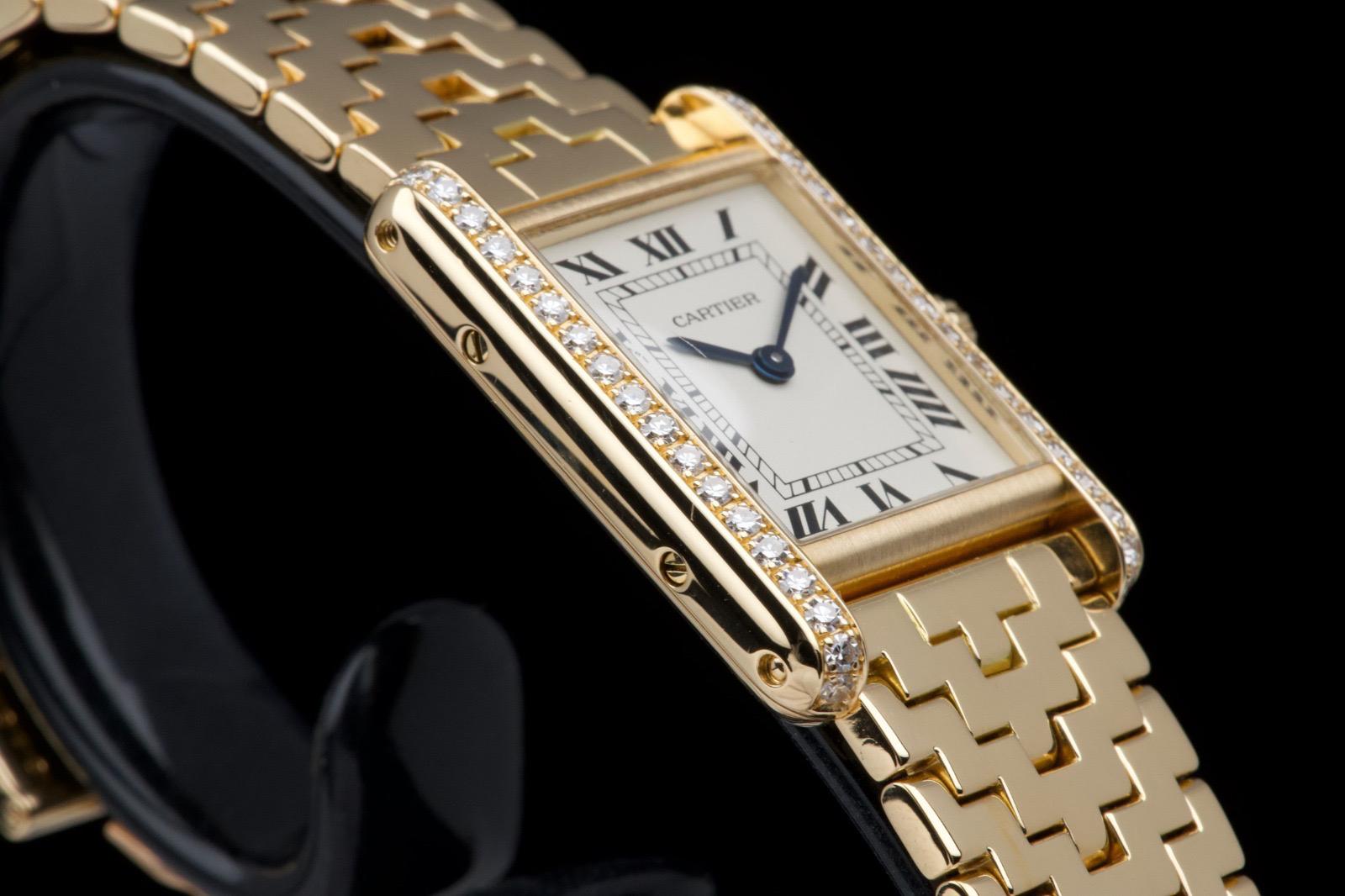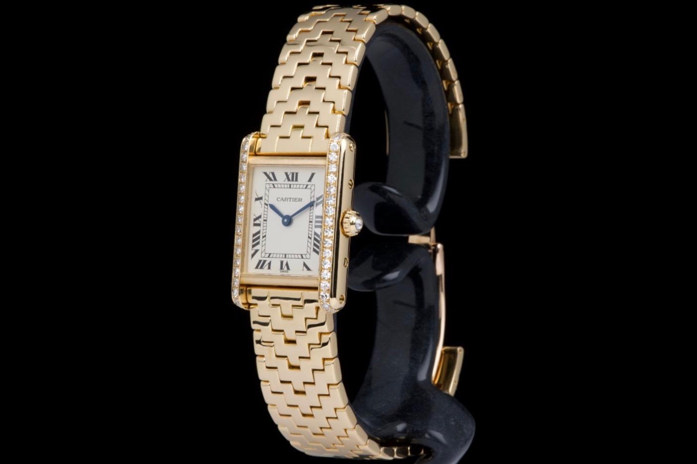 This Cartier Tank MM in yellow gold, dating from 1995, is an extremely rare example distinguished by its highly unusual Pyramide bracelet and diamond-set case. The square case is enhanced by a single row of diamonds set along both the left and right sides of the case, adding a subtle yet unmistakably luxurious accent while preserving the Tank’s iconic geometry. Even more exceptional is the original yellow gold Pyramide bracelet, a seldom-seen configuration that significantly elevates the collectability of the present watch. Offered from its first owner, the watch is accompanied by its original papers dated 1995 and benefits from a complete Cartier service carried out in 2025. Combining rarity, provenance, and recent manufacturer service, this watch represents a remarkable opportunity for collectors seeking an important and scarcely encountered variation of the Cartier Tank.