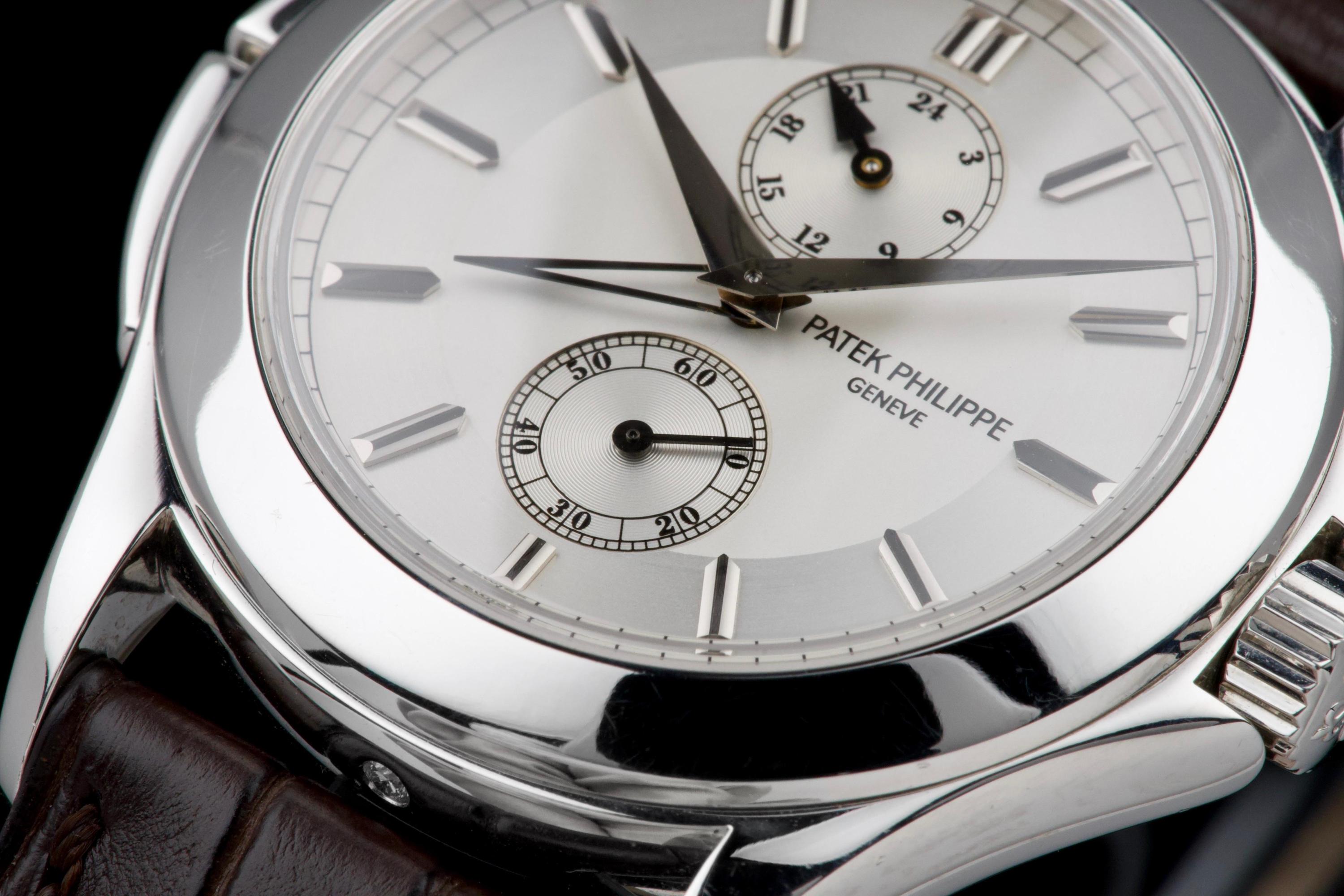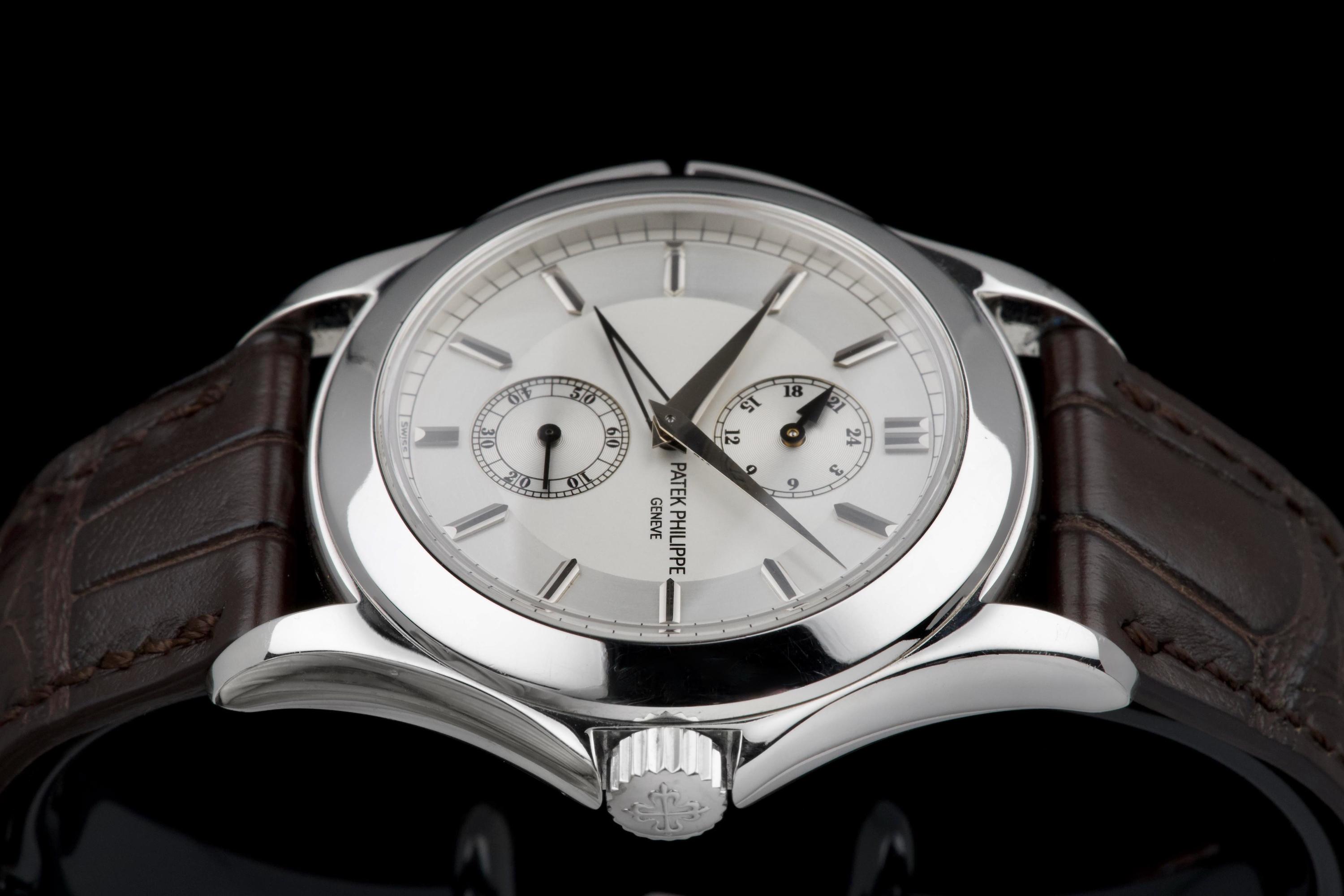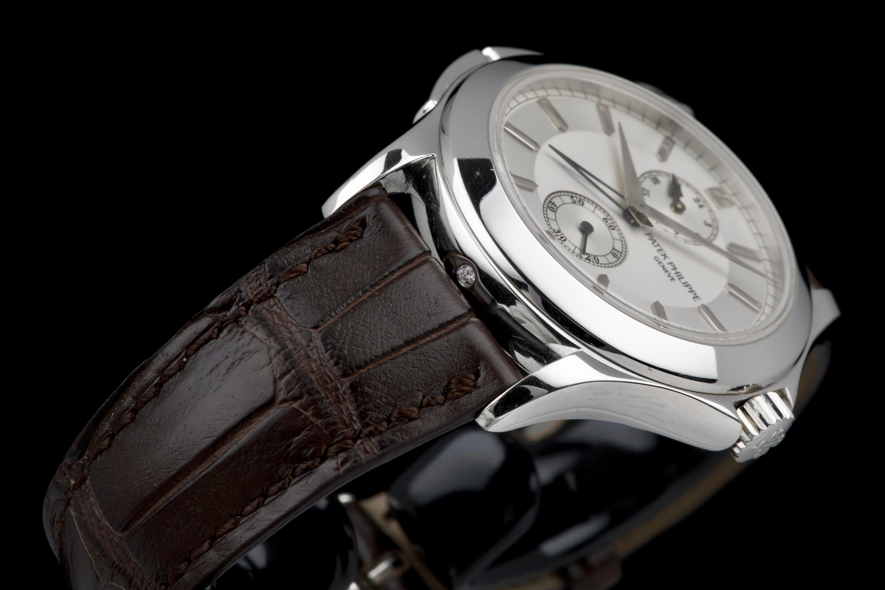 The present Patek Philippe Travel Time reference 5134P, dating to 2003, is a refined and technically elegant example of the manufacture’s dual-time complication, executed in platinum. The case presents in excellent overall condition and appears to be unpolished, showing only very light wear consistent with careful use over time, and retaining crisp lines and harmonious proportions. Housed in a platinum case measuring 37 mm in diameter, the watch offers classic, understated dimensions that are perfectly in keeping with Patek Philippe’s discreet approach to complicated travel watches. The two-tone silvered dial is flawless and distinguished by applied white-gold sword-shaped hour markers, lending depth and clarity to the composition while maintaining a restrained and elegant aesthetic. Powering the watch is the automatic Patek Philippe calibre 215 PS FUS, a finely constructed movement featuring a Travel Time (dual-time) complication with independently adjustable local hour hand. This intuitive system allows the wearer to easily change time zones without stopping the movement, making it both practical and technically sophisticated. The movement has just been fully serviced by our watchmaker and is running perfectly at the time of cataloguing. The watch is fitted with a brand-new Patek Philippe brown alligator leather strap, paired with a platinum Patek Philippe ardillon buckle, completing the ensemble with correct material and period coherence. It is accompanied by an Extract from the Archives, confirming production of the watch in 2003. Elegant, discreet, and mechanically refined, this Travel Time 5134P represents an excellent opportunity to acquire a platinum Patek Philippe complication that combines everyday usability with timeless design and exceptional craftsmanship.