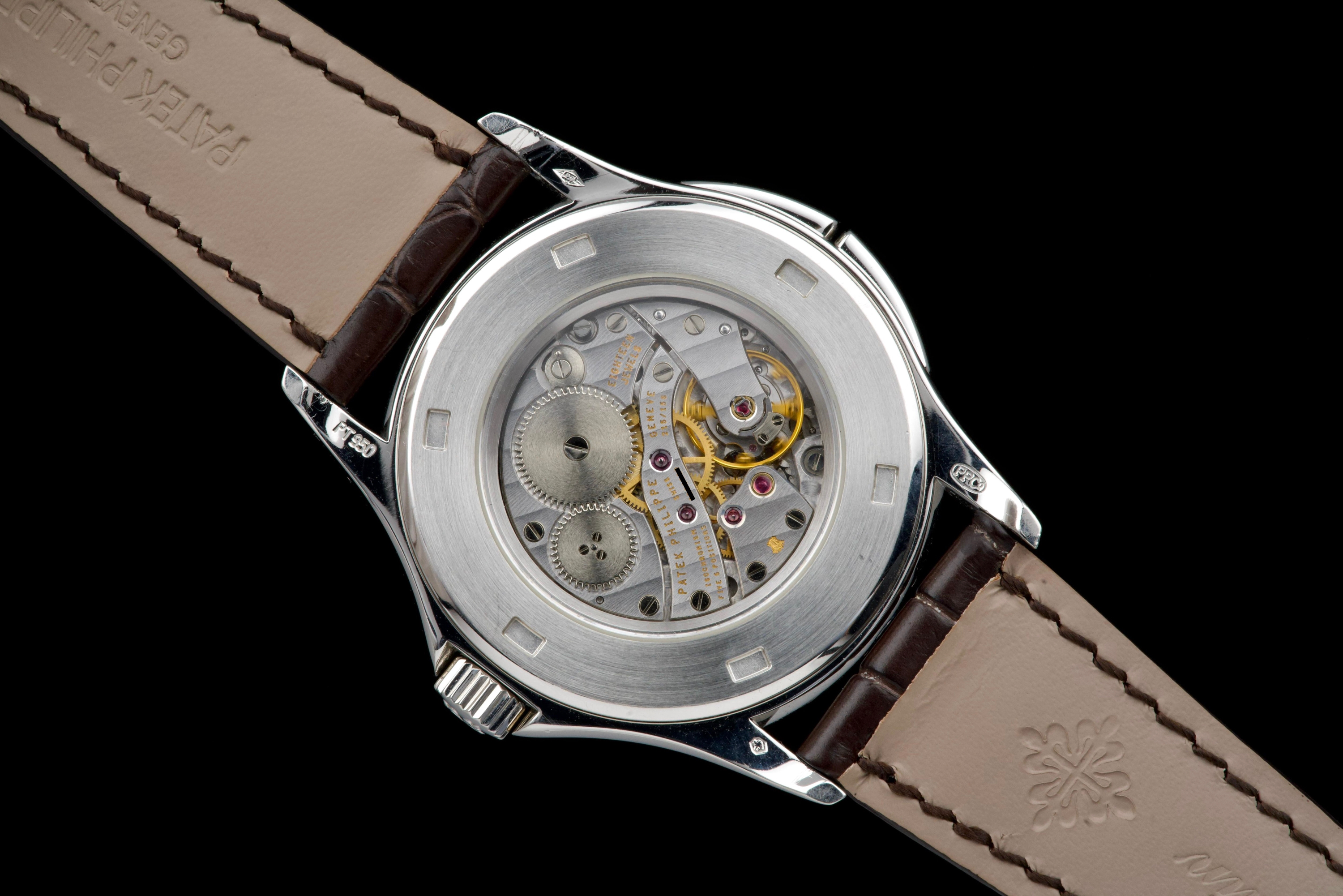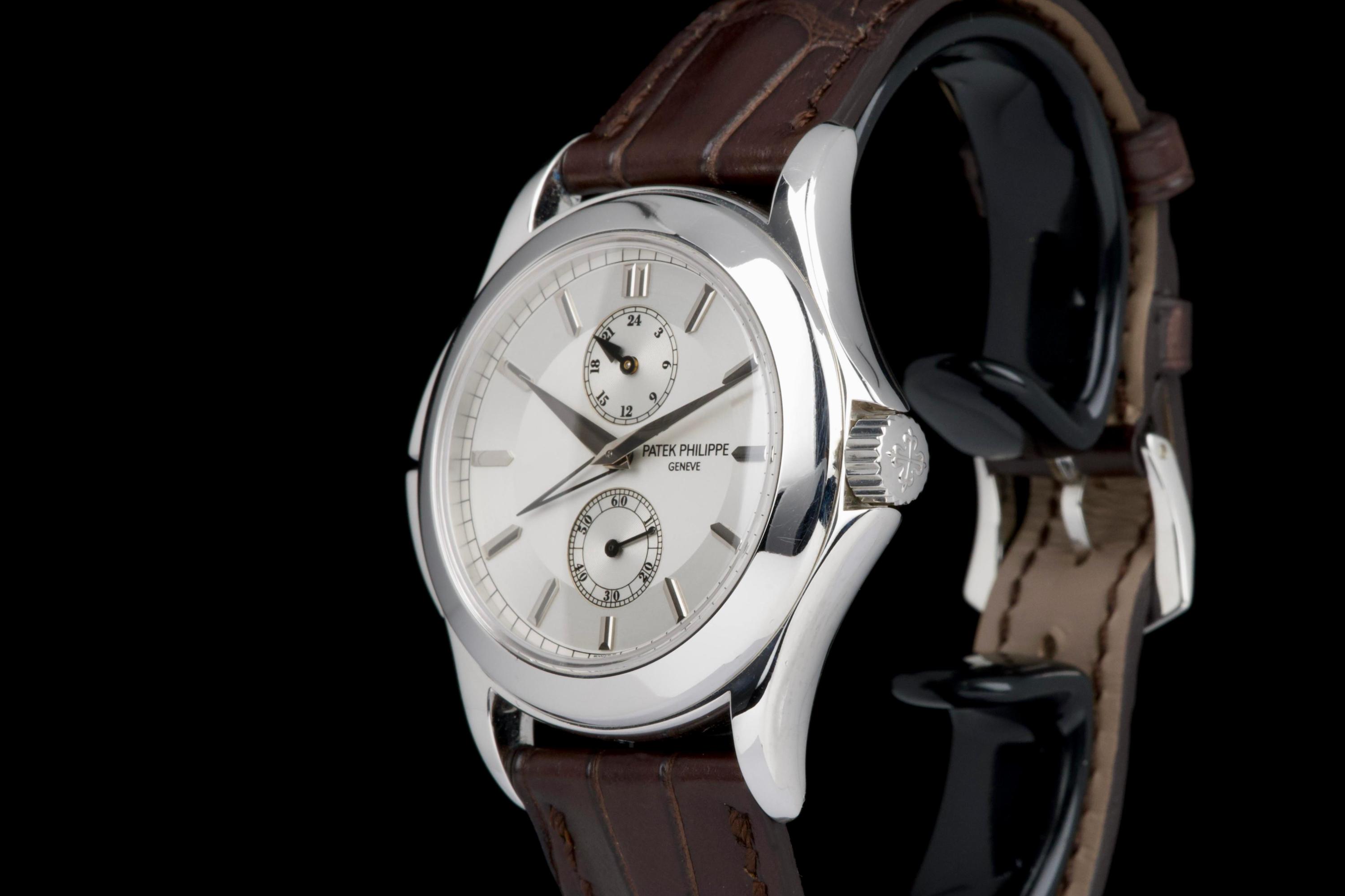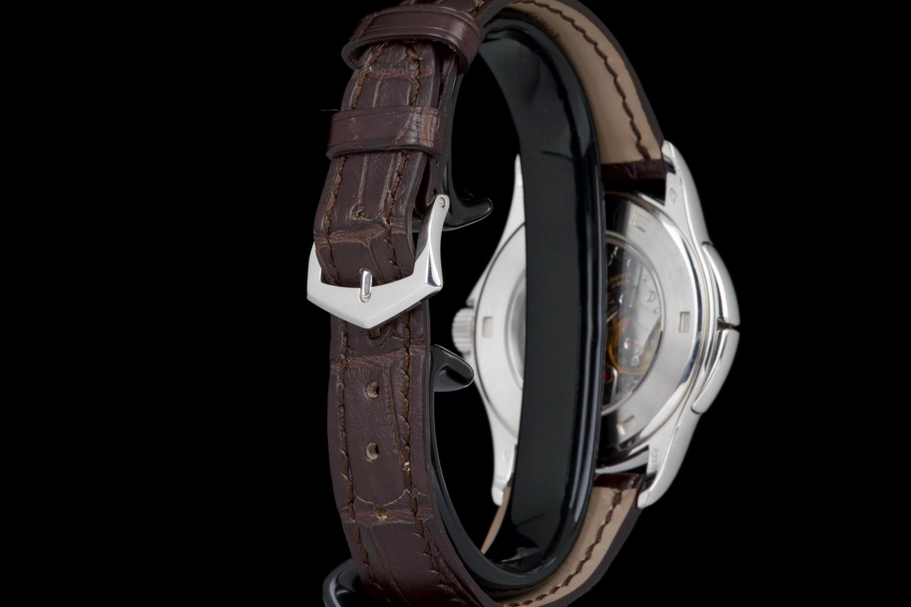 The present Patek Philippe Travel Time reference 5134P, dating to 2003, is a refined and technically elegant example of the manufacture’s dual-time complication, executed in platinum. The case presents in excellent overall condition and appears to be unpolished, showing only very light wear consistent with careful use over time, and retaining crisp lines and harmonious proportions. Housed in a platinum case measuring 37 mm in diameter, the watch offers classic, understated dimensions that are perfectly in keeping with Patek Philippe’s discreet approach to complicated travel watches. The two-tone silvered dial is flawless and distinguished by applied white-gold sword-shaped hour markers, lending depth and clarity to the composition while maintaining a restrained and elegant aesthetic. Powering the watch is the automatic Patek Philippe calibre 215 PS FUS, a finely constructed movement featuring a Travel Time (dual-time) complication with independently adjustable local hour hand. This intuitive system allows the wearer to easily change time zones without stopping the movement, making it both practical and technically sophisticated. The movement has just been fully serviced by our watchmaker and is running perfectly at the time of cataloguing. The watch is fitted with a brand-new Patek Philippe brown alligator leather strap, paired with a platinum Patek Philippe ardillon buckle, completing the ensemble with correct material and period coherence. It is accompanied by an Extract from the Archives, confirming production of the watch in 2003. Elegant, discreet, and mechanically refined, this Travel Time 5134P represents an excellent opportunity to acquire a platinum Patek Philippe complication that combines everyday usability with timeless design and exceptional craftsmanship.