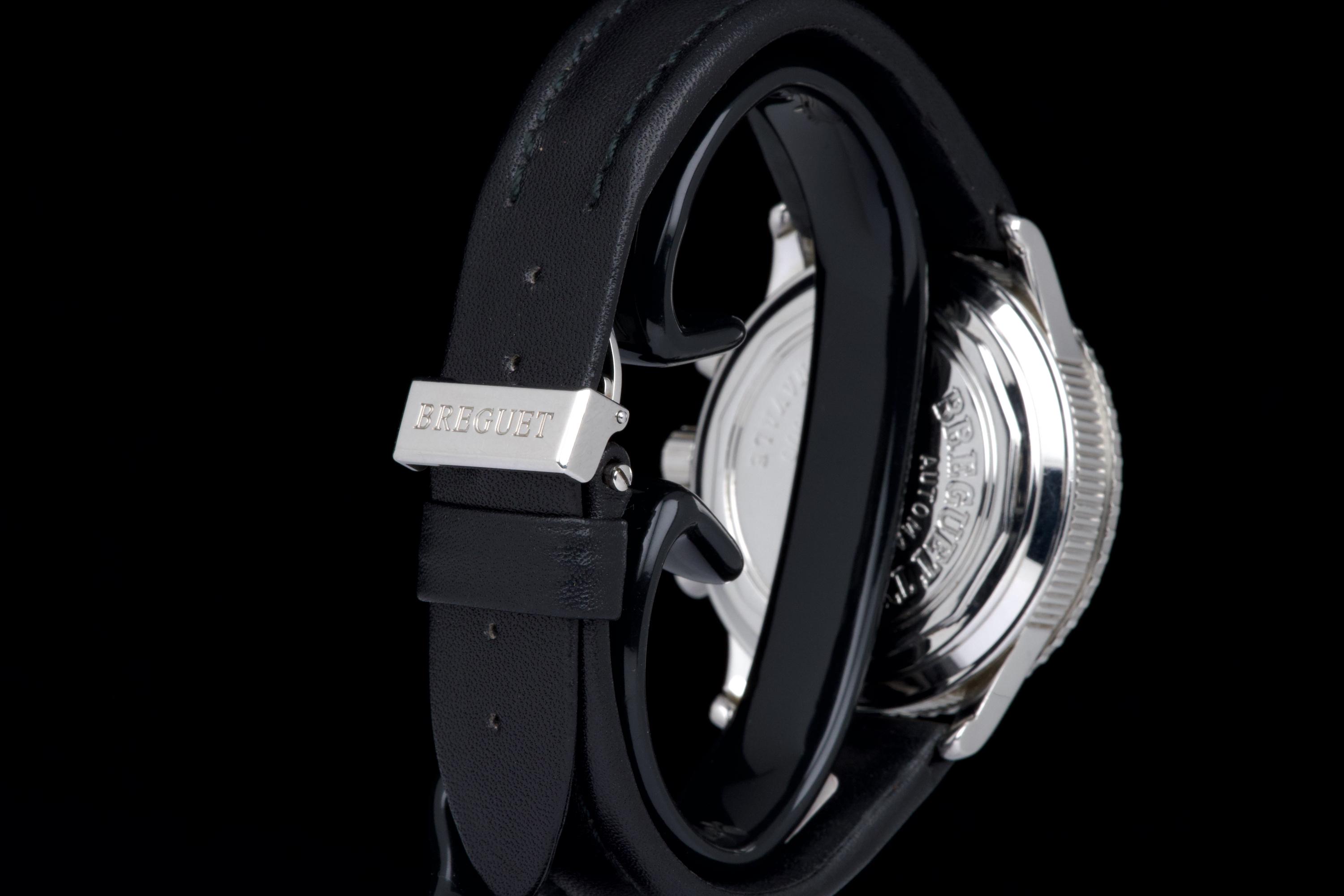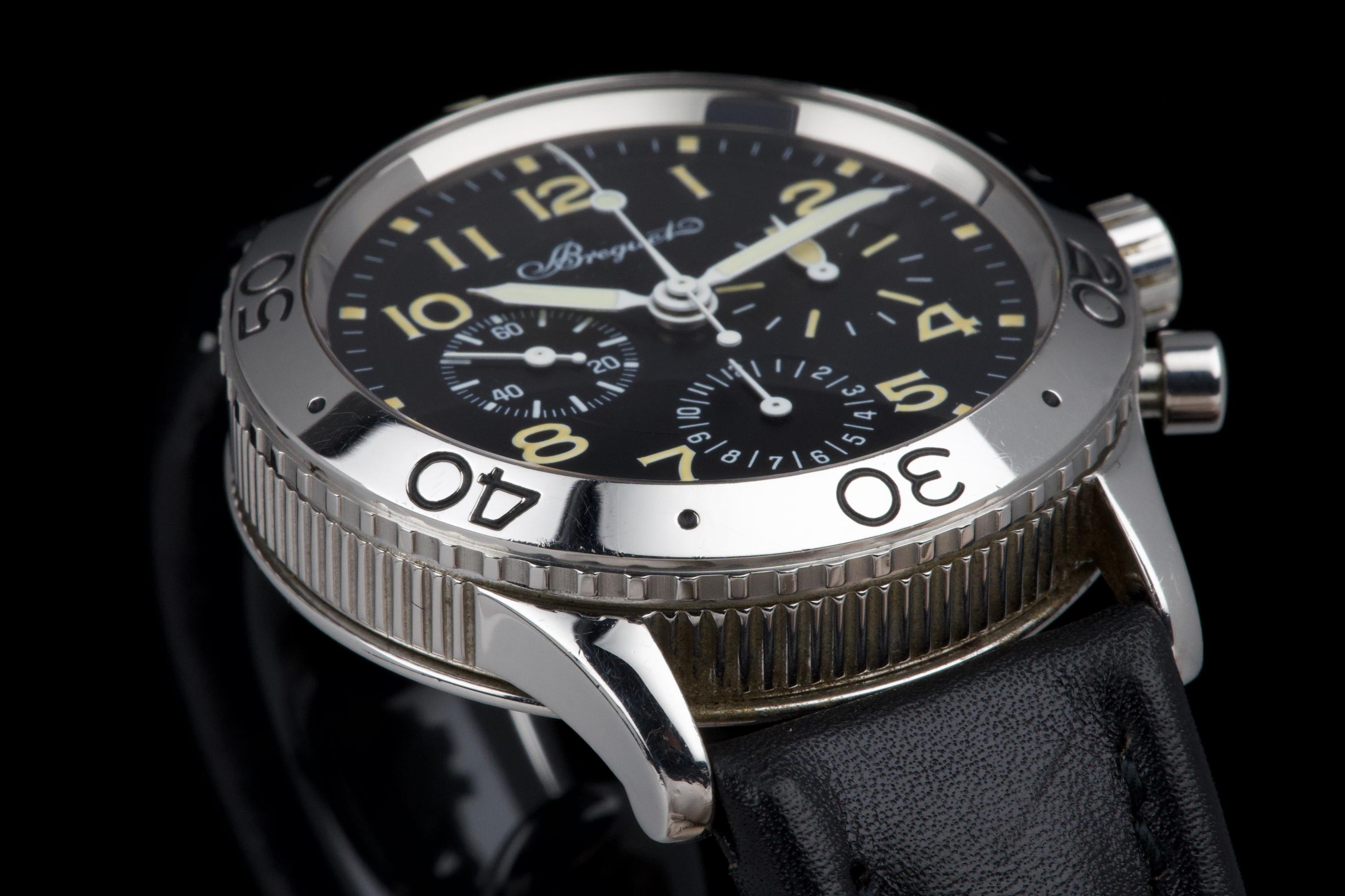 A superb example of the Breguet Type XX reference ST800, complete with its original metal box and original undated papers. Although the warranty is not dated, production characteristics and serial range indicate that the watch was most likely produced in 1997. The stainless-steel case is unpolished, remaining in excellent condition and showing only very light wear from use. The black tritium dial is exceptional, featuring a beautiful warm patina with perfectly matching tritium hands — exactly what collectors look for on early Type XX pieces. The watch is fitted with a brand-new Breguet black leather strap and its original Breguet deployant clasp, offering a fresh and elegant wrist presence. No service history is available, but the watch has been checked by our watchmaker and is in perfect working condition. A highly attractive and honest example of the classic Breguet Type XX — unpolished, full set, with beautiful patina and excellent overall condition.