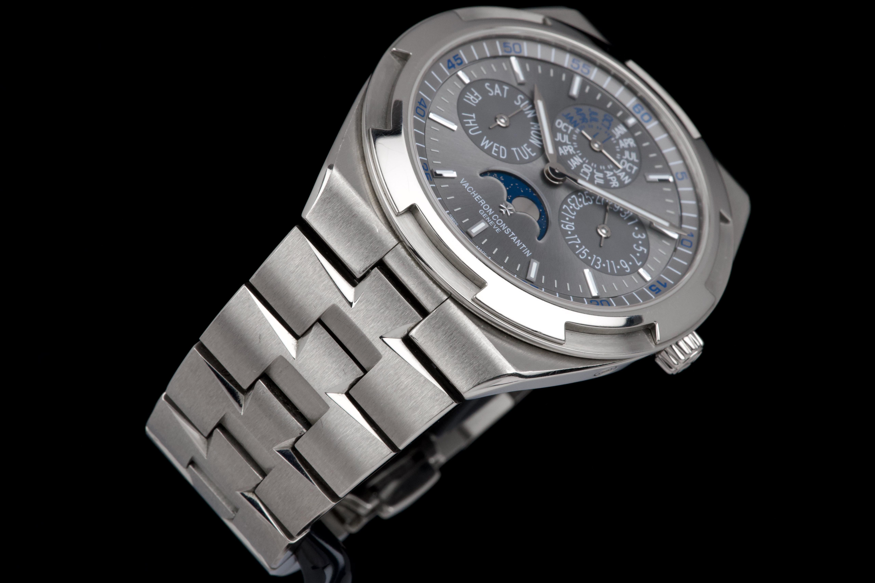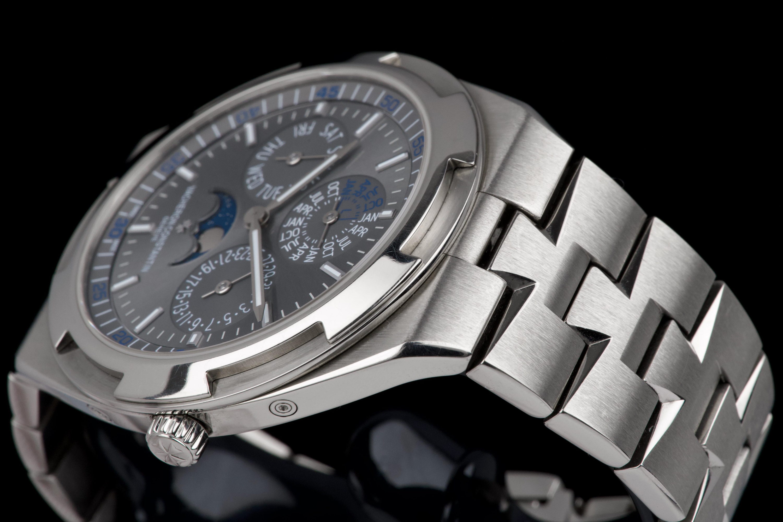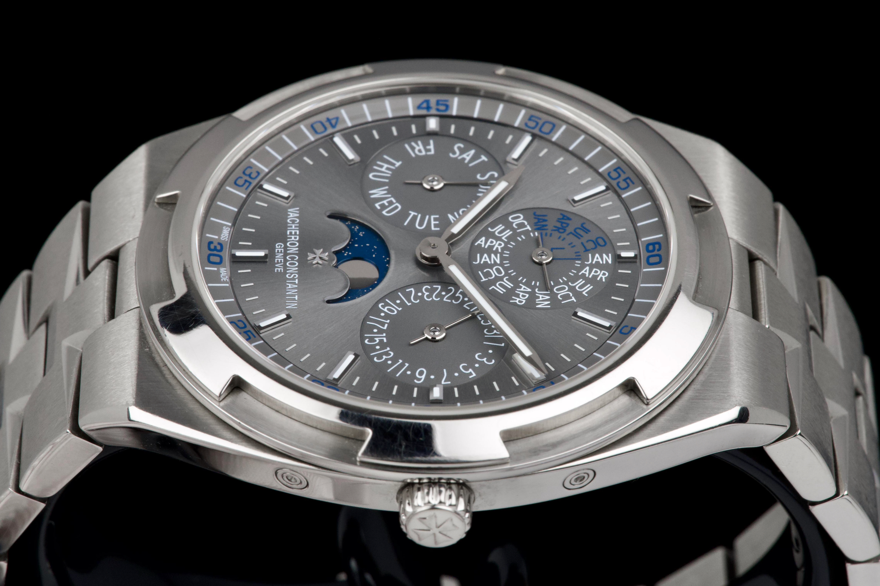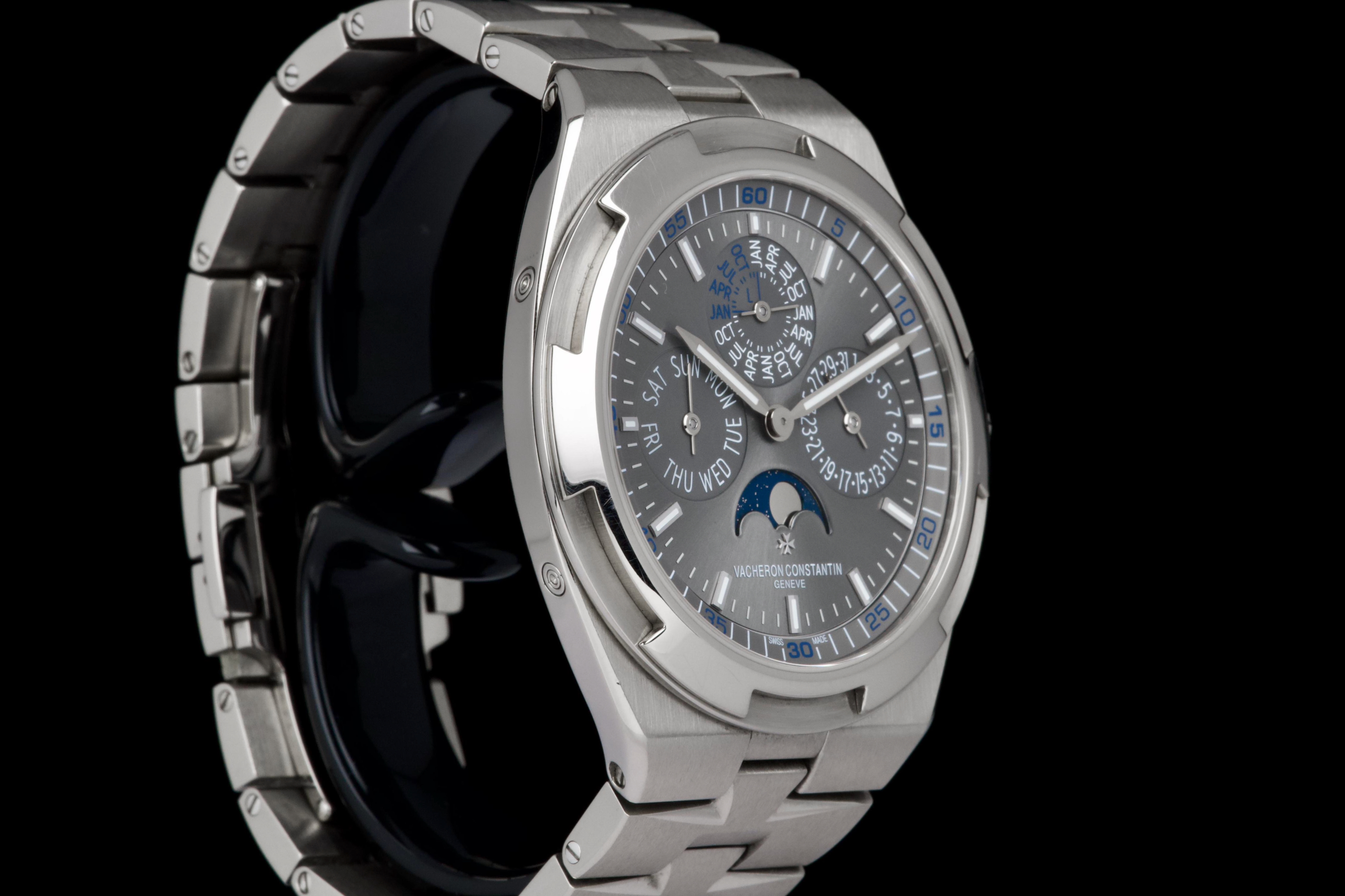 The present Vacheron Constantin Overseas Ultra-Thin Perpetual Calendar reference 4300V/120G-B102, dating to 2016, is an exceptional example of contemporary haute horlogerie, combining the technical sophistication of a perpetual calendar with the refined sport-elegance of the Overseas collection. Offered here as a complete full set, this watch represents one of the most desirable complicated Overseas references of the modern era. Executed in 18K white gold, the ultra-thin case measures 41.5 mm in diameter while maintaining remarkably elegant proportions on the wrist. The watch appears to be unpolished and displays light signs of wear consistent with careful use, retaining sharp lines and the distinctive Maltese cross–inspired bezel design. The dial presents the classic perpetual calendar layout, with indications for day, date, month, leap year, and a beautifully executed moon-phase display. The slim automatic movement powering the watch is Vacheron Constantin’s celebrated calibre 1120 QP, derived from one of the thinnest full-rotor perpetual calendar movements ever produced, admired for both its mechanical refinement and exceptional finishing. Delivered as a full set from 2016, this Overseas Ultra-Thin Perpetual Calendar offers a rare opportunity to acquire a white-gold, high-complication sports watch from one of the most prestigious Geneva manufactures—combining technical mastery, refined aesthetics, and outstanding versatility.