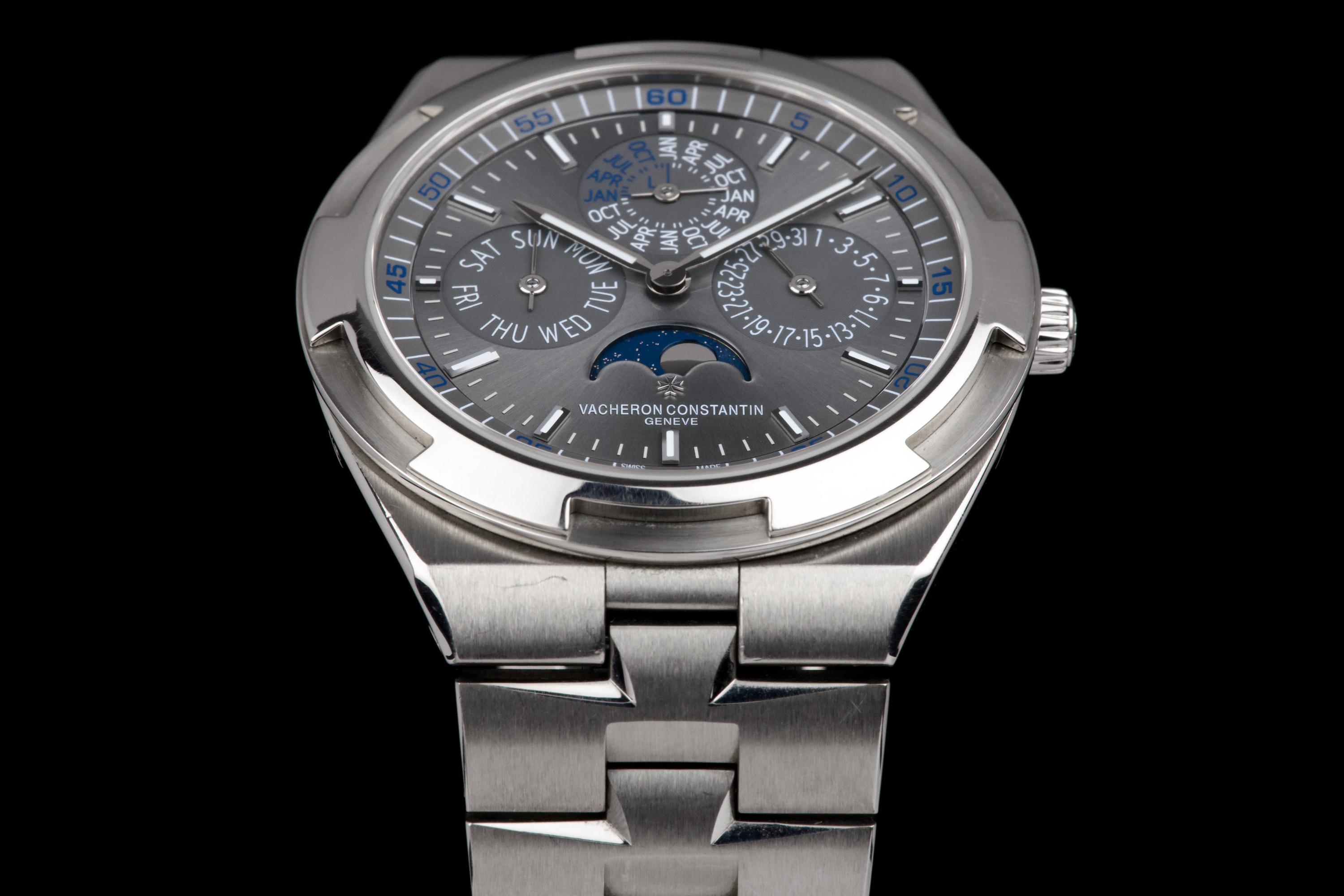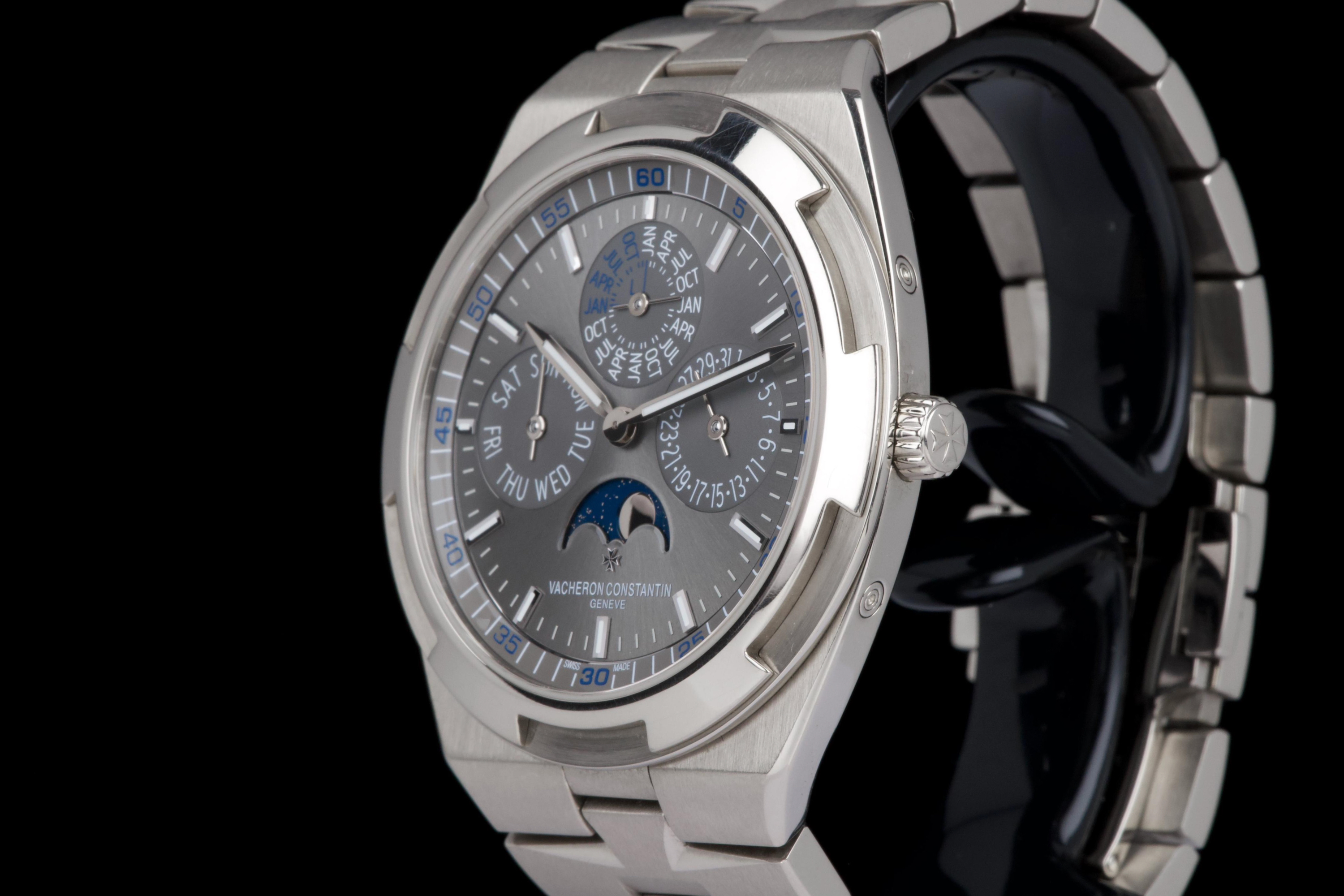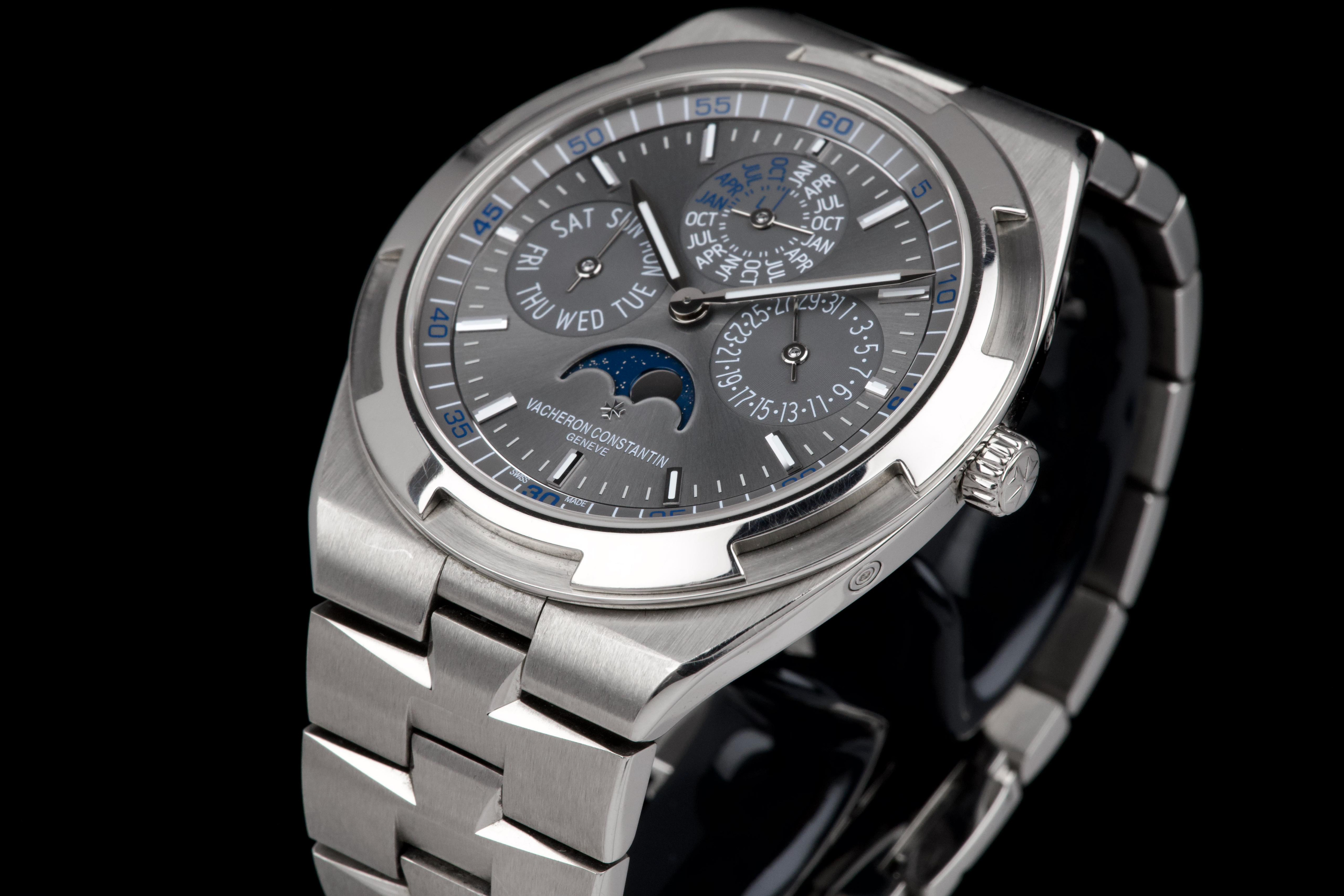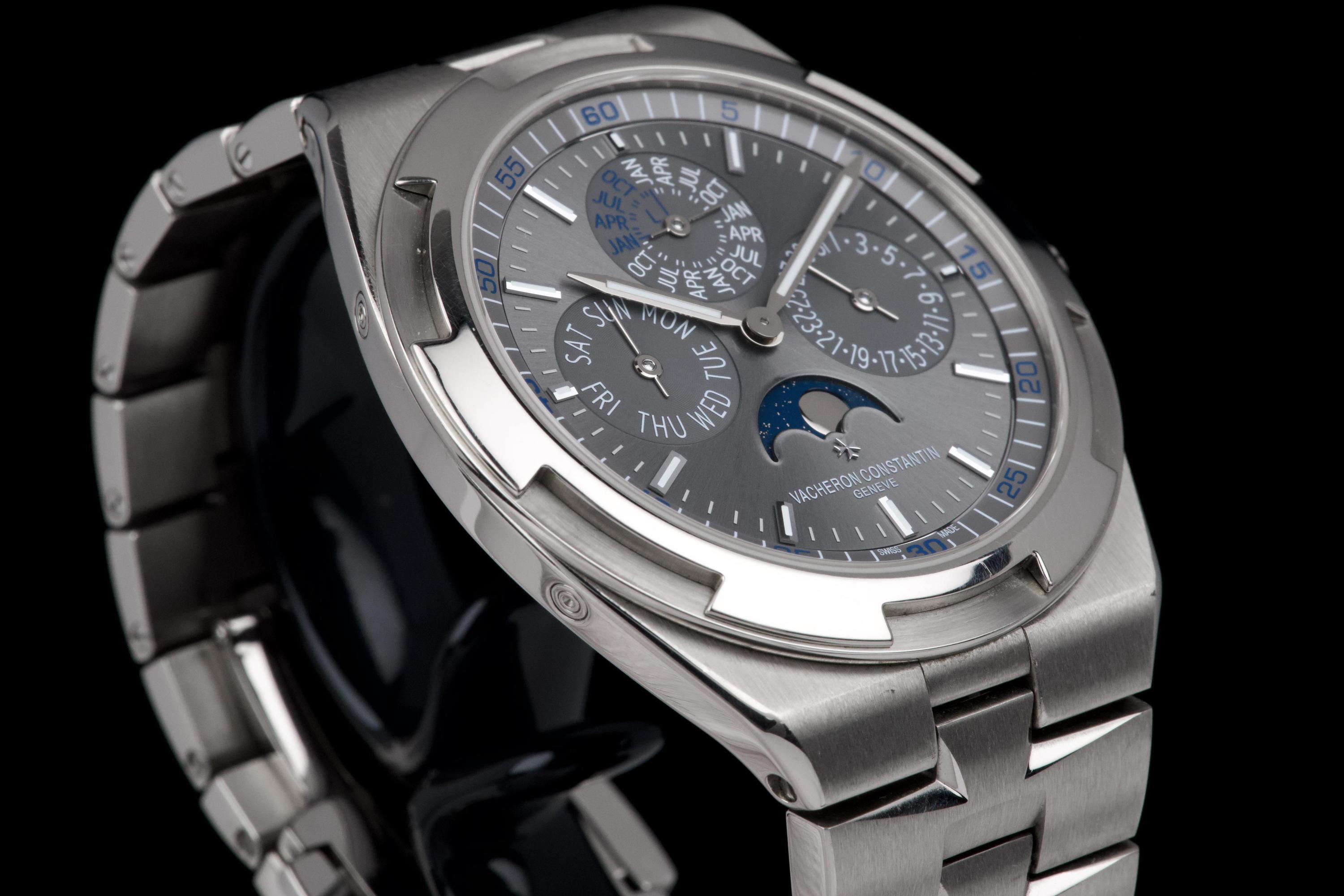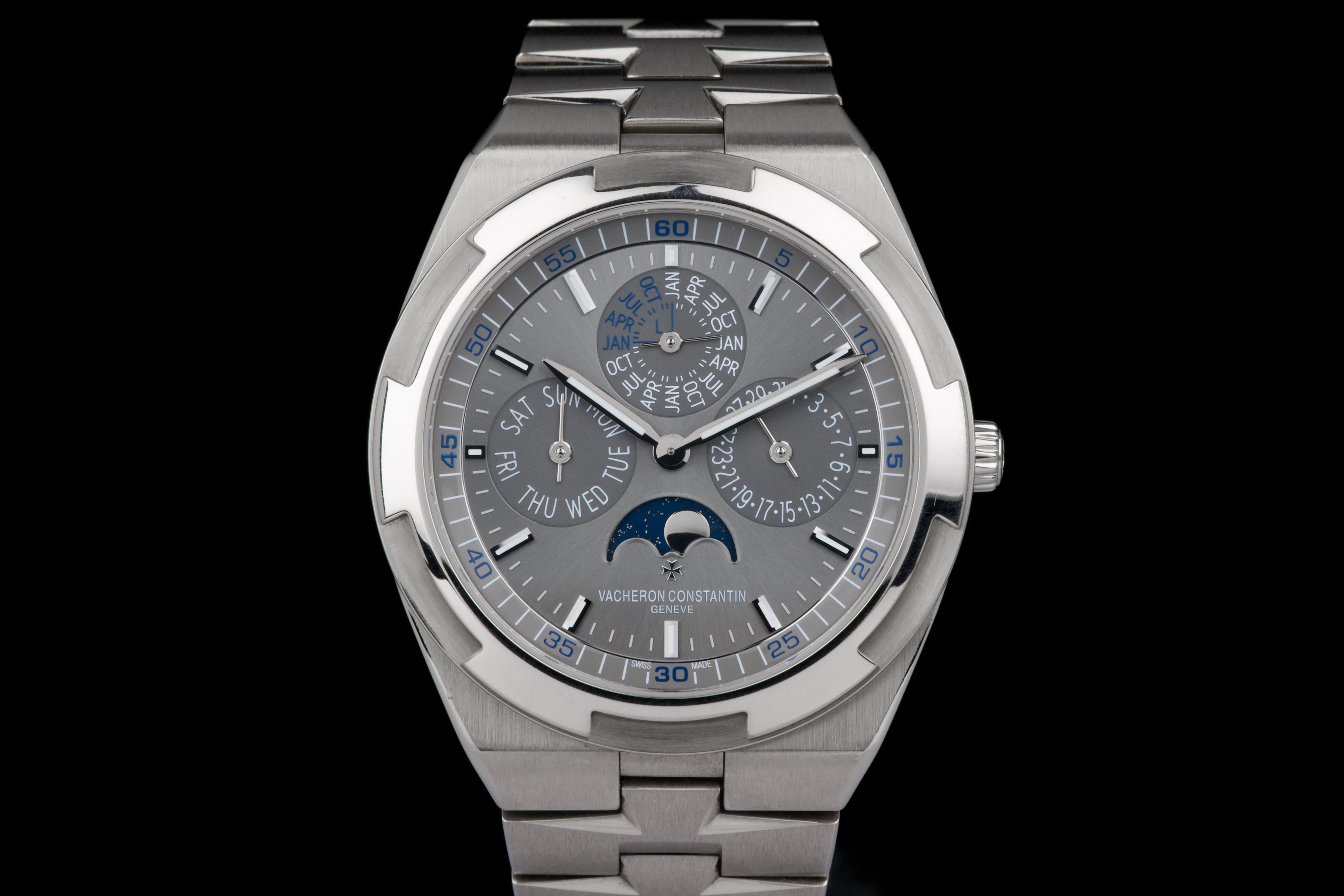 The present Vacheron Constantin Overseas Ultra-Thin Perpetual Calendar reference 4300V/120G-B102, dating to 2016, is an exceptional example of contemporary haute horlogerie, combining the technical sophistication of a perpetual calendar with the refined sport-elegance of the Overseas collection. Offered here as a complete full set, this watch represents one of the most desirable complicated Overseas references of the modern era. Executed in 18K white gold, the ultra-thin case measures 41.5 mm in diameter while maintaining remarkably elegant proportions on the wrist. The watch appears to be unpolished and displays light signs of wear consistent with careful use, retaining sharp lines and the distinctive Maltese cross–inspired bezel design. The dial presents the classic perpetual calendar layout, with indications for day, date, month, leap year, and a beautifully executed moon-phase display. The slim automatic movement powering the watch is Vacheron Constantin’s celebrated calibre 1120 QP, derived from one of the thinnest full-rotor perpetual calendar movements ever produced, admired for both its mechanical refinement and exceptional finishing. Delivered as a full set from 2016, this Overseas Ultra-Thin Perpetual Calendar offers a rare opportunity to acquire a white-gold, high-complication sports watch from one of the most prestigious Geneva manufactures—combining technical mastery, refined aesthetics, and outstanding versatility.