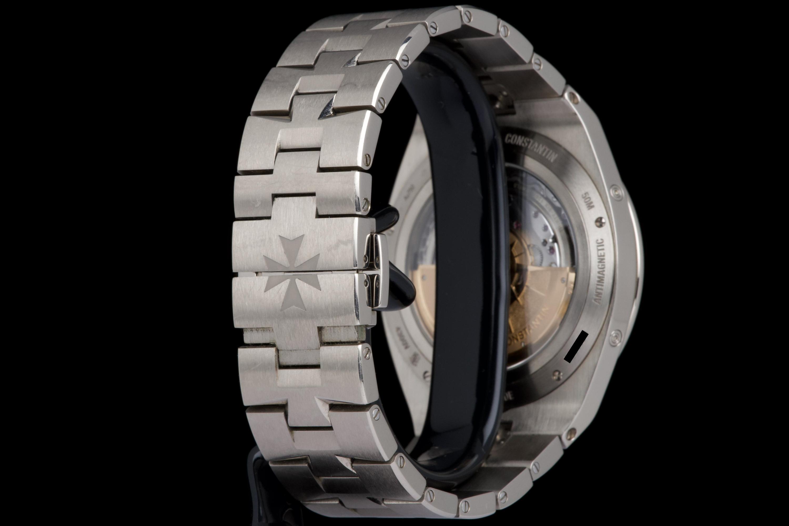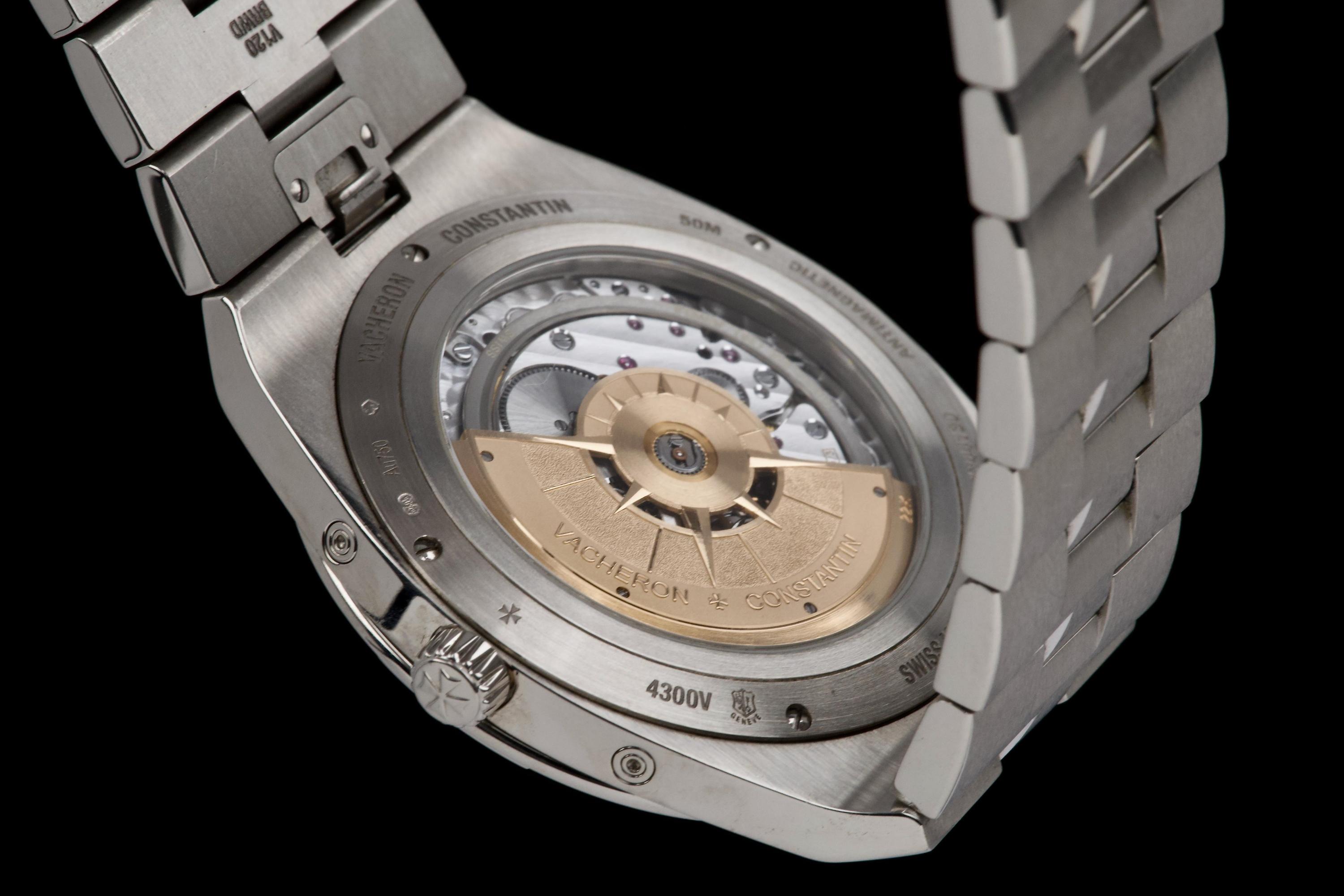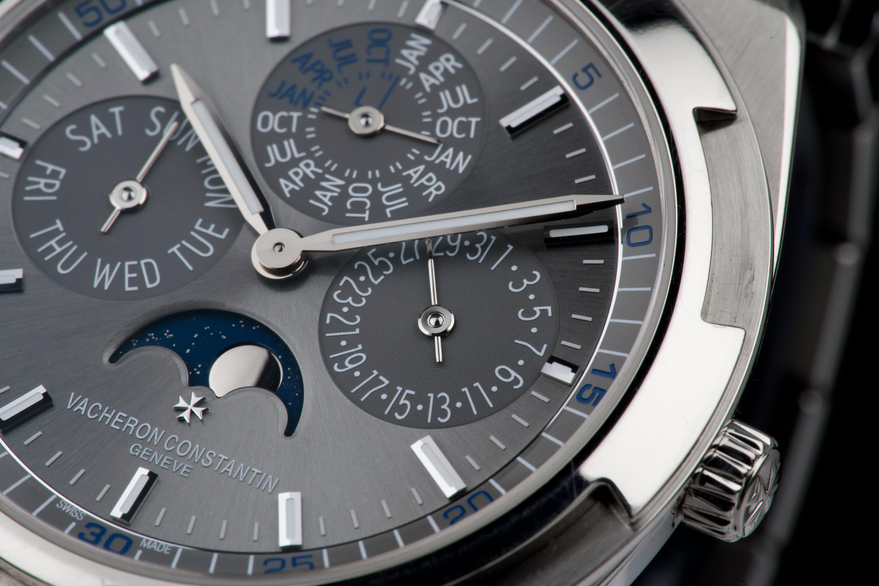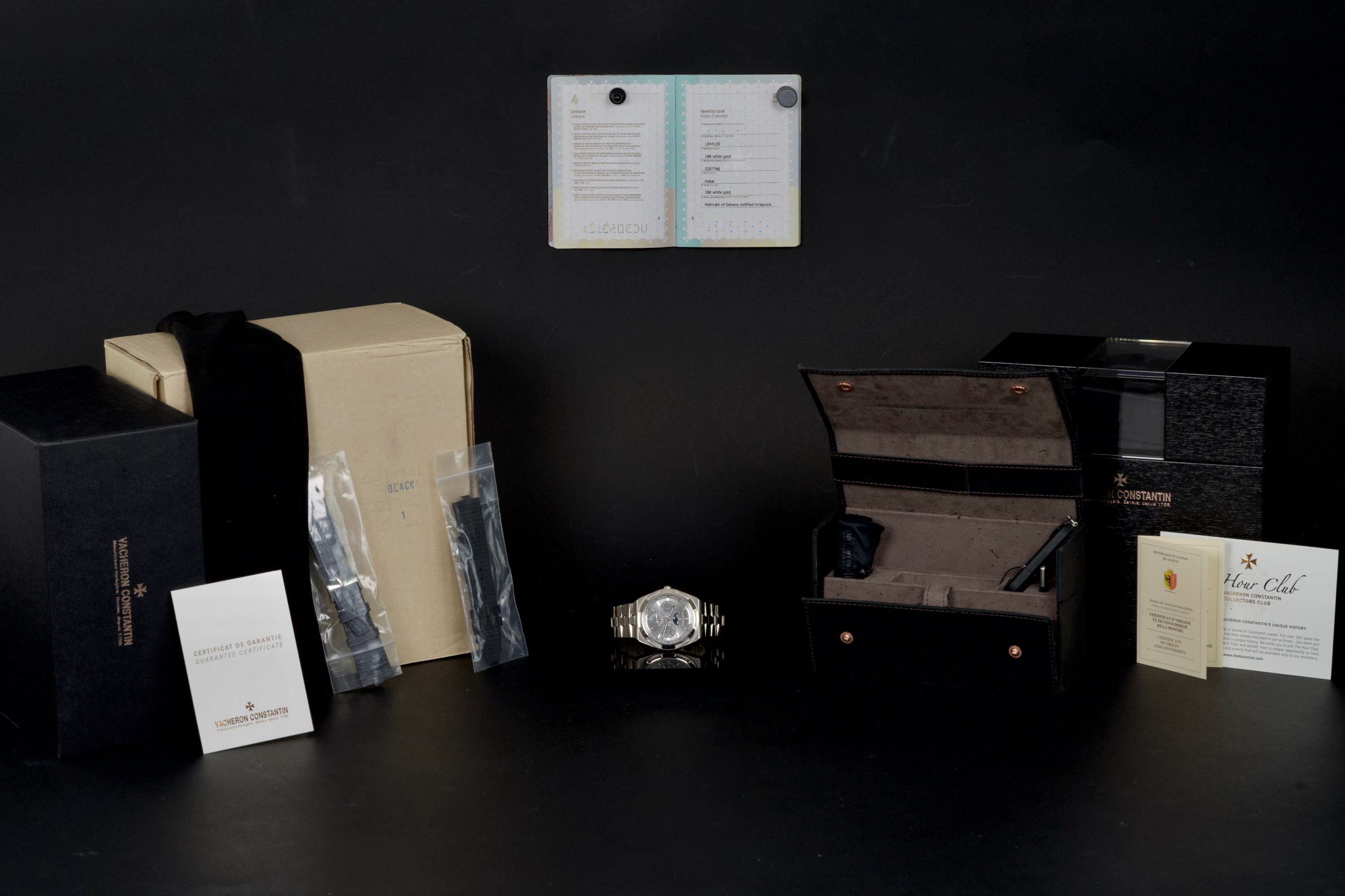 The present Vacheron Constantin Overseas Ultra-Thin Perpetual Calendar reference 4300V/120G-B102, dating to 2016, is an exceptional example of contemporary haute horlogerie, combining the technical sophistication of a perpetual calendar with the refined sport-elegance of the Overseas collection. Offered here as a complete full set, this watch represents one of the most desirable complicated Overseas references of the modern era. Executed in 18K white gold, the ultra-thin case measures 41.5 mm in diameter while maintaining remarkably elegant proportions on the wrist. The watch appears to be unpolished and displays light signs of wear consistent with careful use, retaining sharp lines and the distinctive Maltese cross–inspired bezel design. The dial presents the classic perpetual calendar layout, with indications for day, date, month, leap year, and a beautifully executed moon-phase display. The slim automatic movement powering the watch is Vacheron Constantin’s celebrated calibre 1120 QP, derived from one of the thinnest full-rotor perpetual calendar movements ever produced, admired for both its mechanical refinement and exceptional finishing. Delivered as a full set from 2016, this Overseas Ultra-Thin Perpetual Calendar offers a rare opportunity to acquire a white-gold, high-complication sports watch from one of the most prestigious Geneva manufactures—combining technical mastery, refined aesthetics, and outstanding versatility.