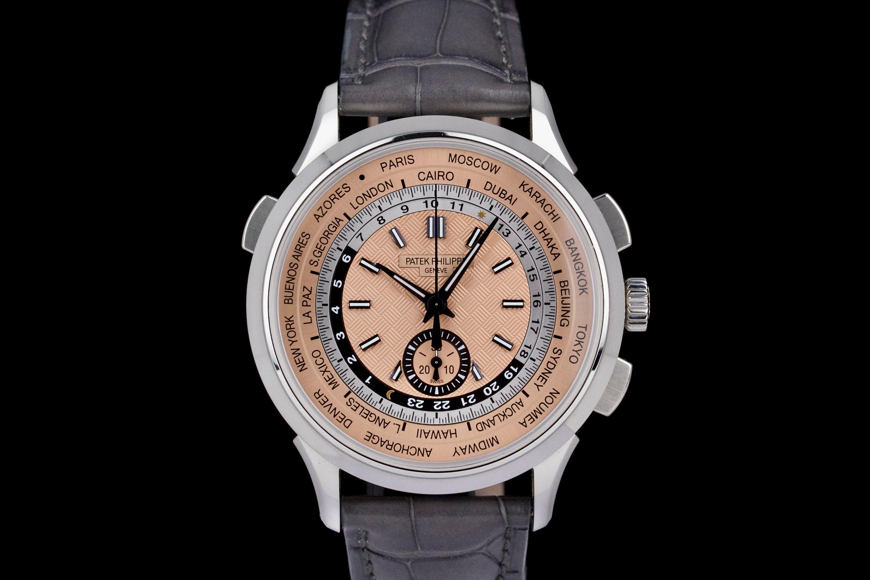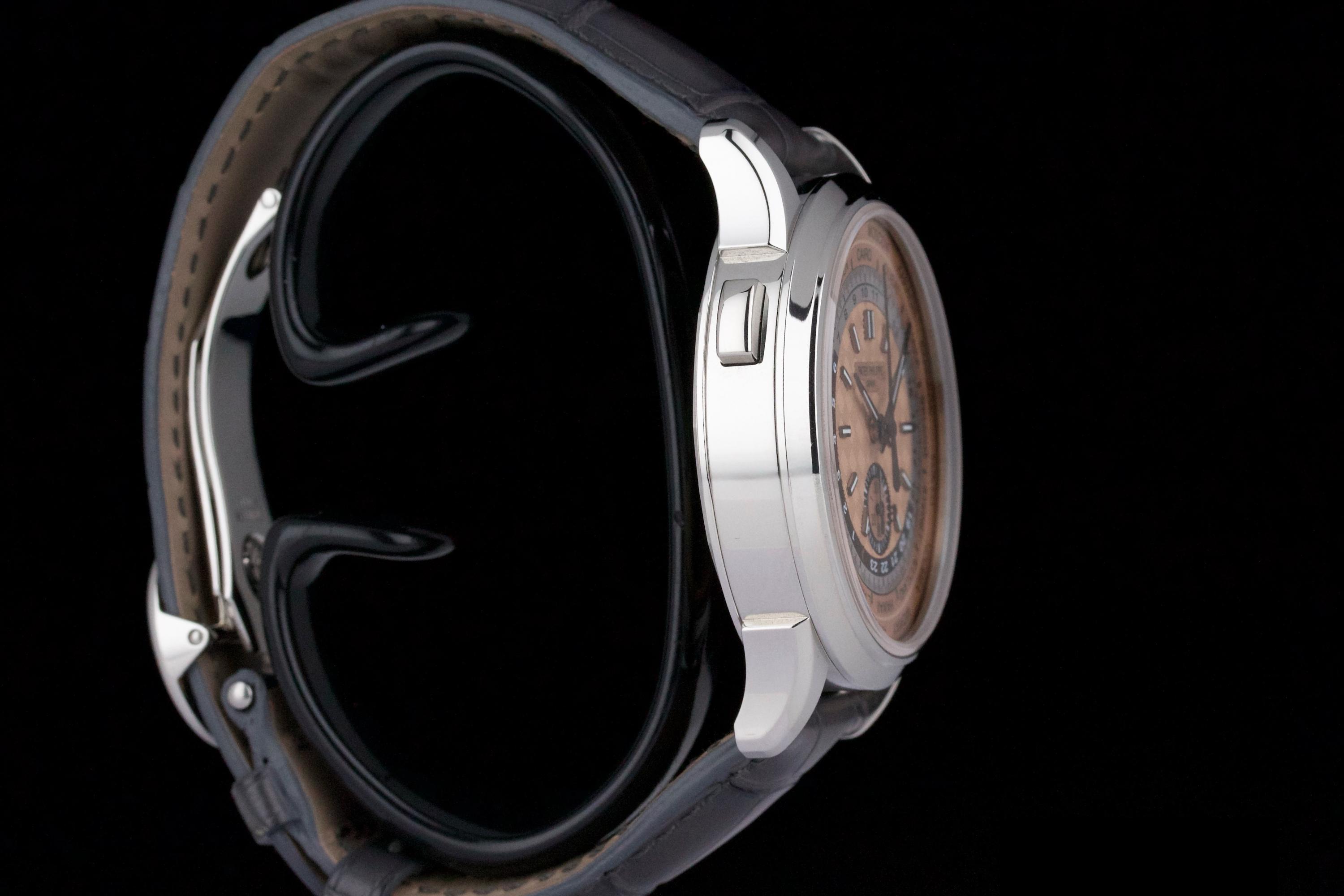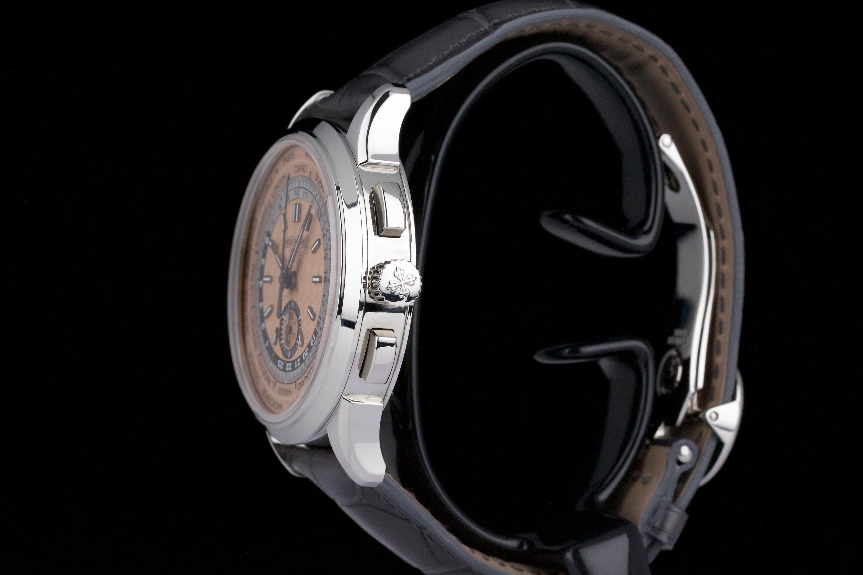 The Patek Philippe 5935A is a rare and striking combination of two of the brand’s most emblematic complications: the chronograph and the world time function. Housed in a stainless steel case and fitted with a beautifully textured salmon-colored dial, this reference offers both functionality and elegance in a contemporary 41 mm design. This example was sold in 2022 and comes as a complete full set. The watch is unpolished and in near-new condition, showing only extremely light wear from careful use. A superb and versatile modern Patek Philippe, blending heritage complication with modern flair—an excellent choice for both collectors and frequent travelers.
