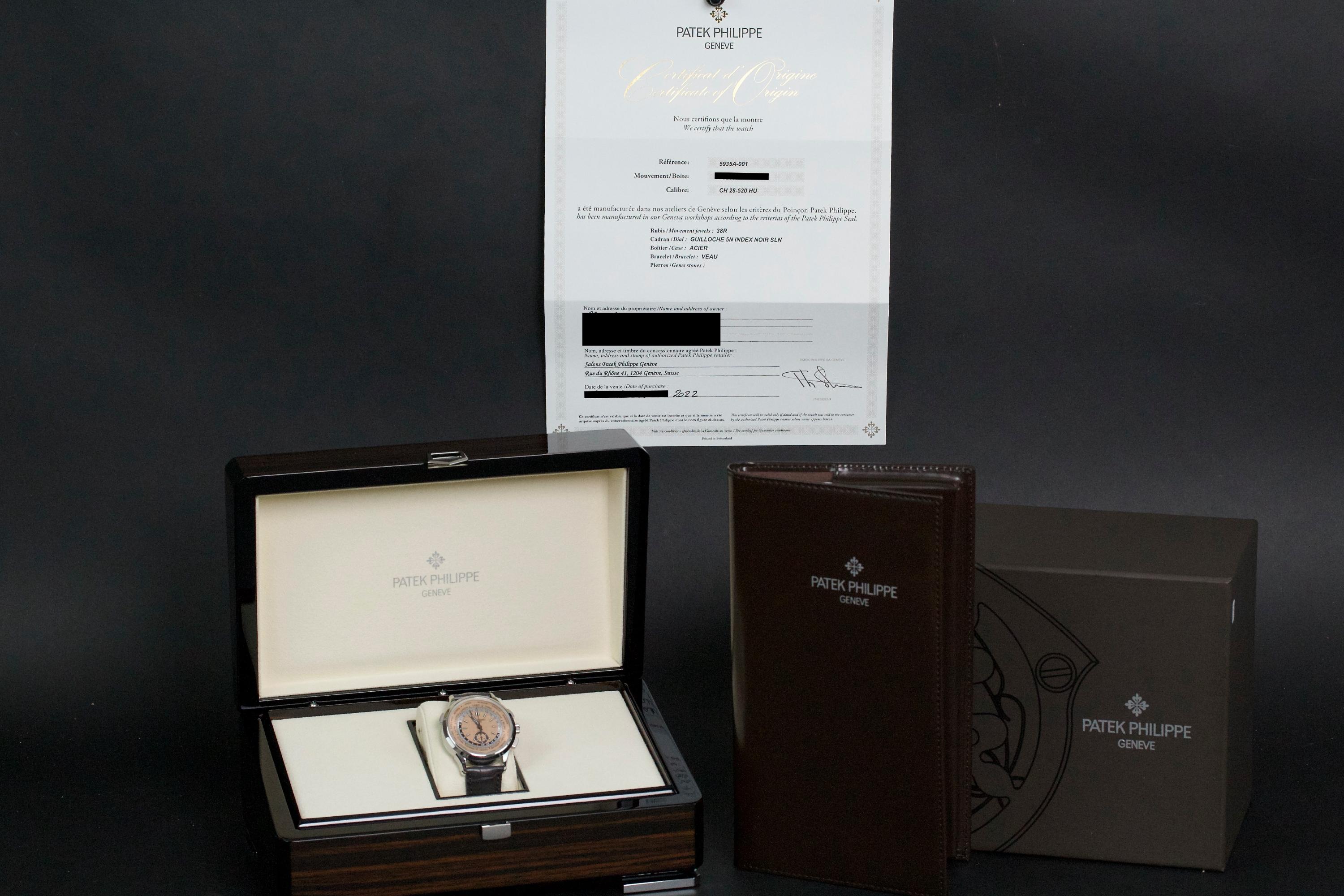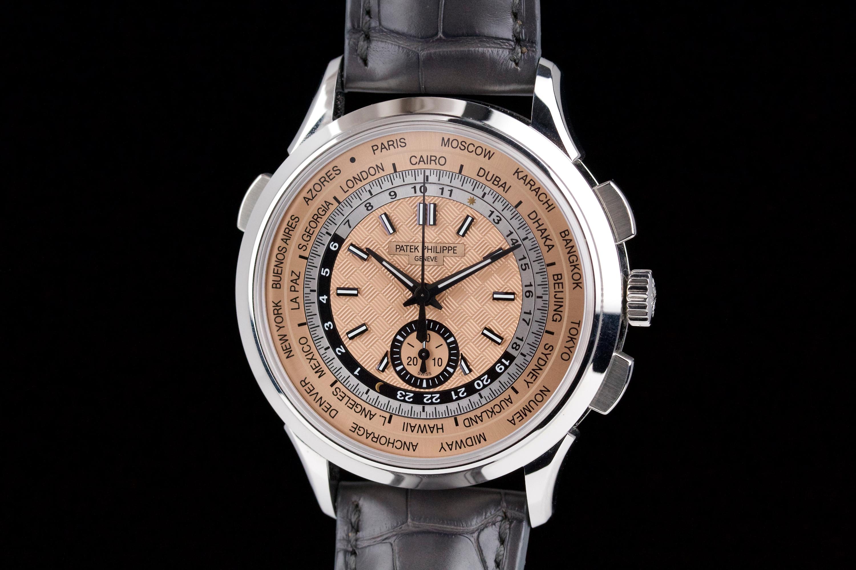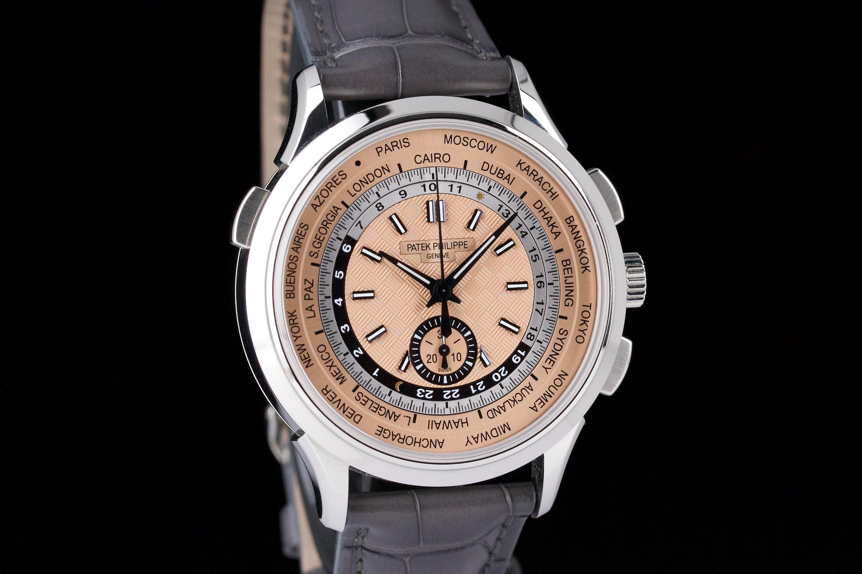 The Patek Philippe 5935A is a rare and striking combination of two of the brand’s most emblematic complications: the chronograph and the world time function. Housed in a stainless steel case and fitted with a beautifully textured salmon-colored dial, this reference offers both functionality and elegance in a contemporary 41 mm design. This example was sold in 2022 and comes as a complete full set. The watch is unpolished and in near-new condition, showing only extremely light wear from careful use. A superb and versatile modern Patek Philippe, blending heritage complication with modern flair—an excellent choice for both collectors and frequent travelers.