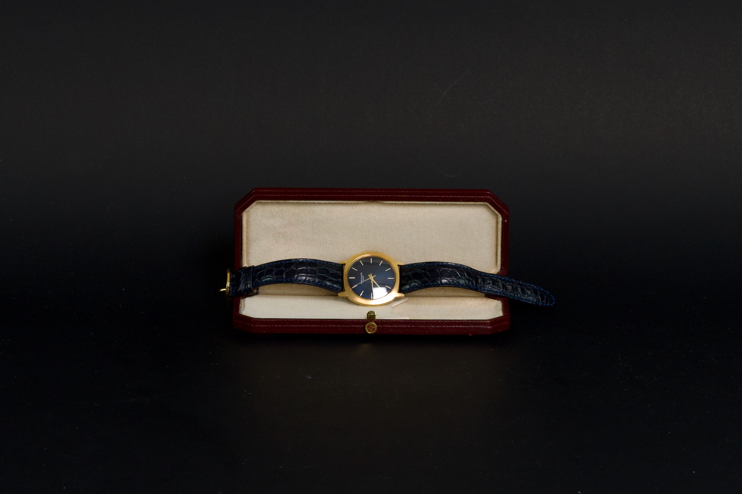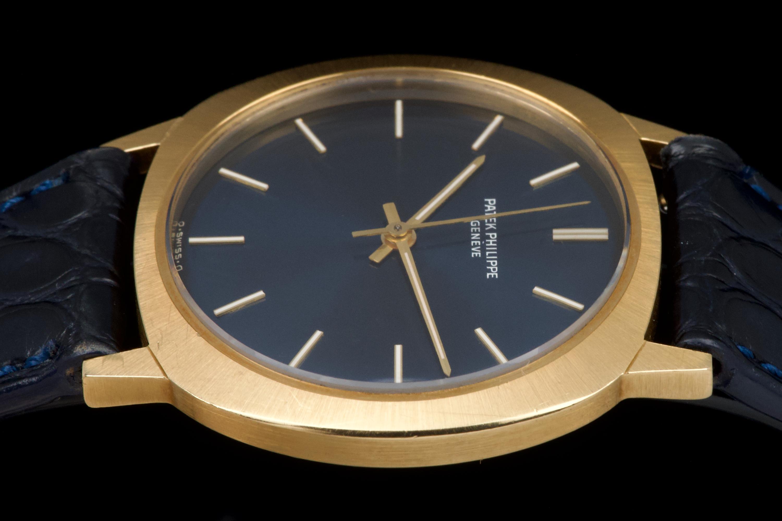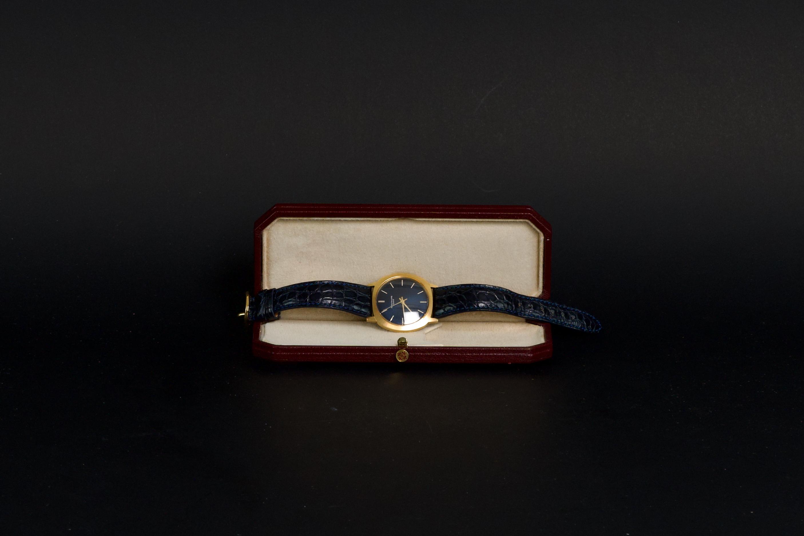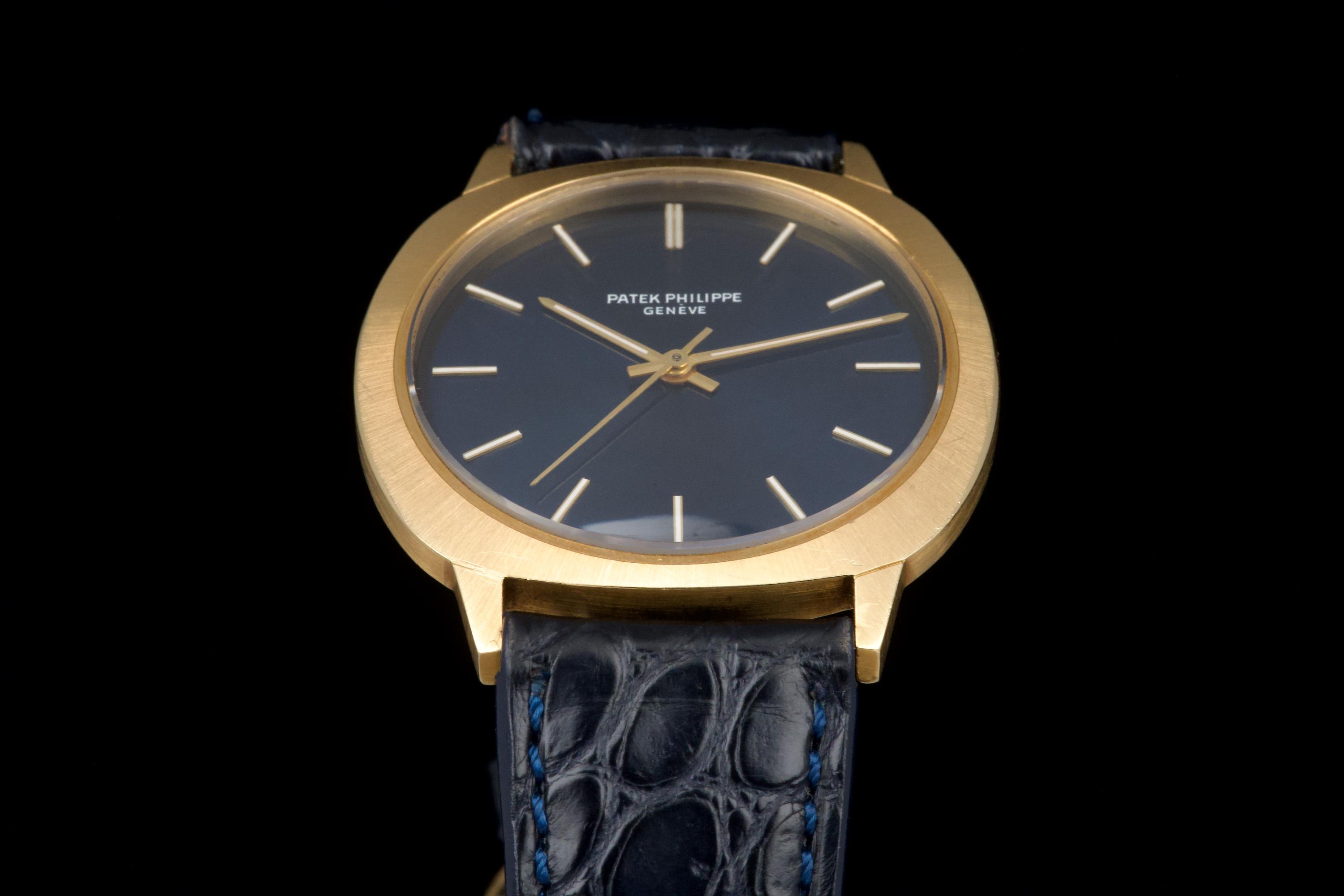 A very rare and elegant example of the Patek Philippe reference 3573, presented here in its most desirable configuration featuring a stunning blue sigma dial. The 36mm yellow-gold cushion-shaped case has been polished in the past but remains sharp, showing only light wear consistent with age. A particularly charming detail of this reference is its crown positioned on the caseback, giving the watch an exceptionally pure and minimalist profile on the wrist — a design hallmark of early 1970s Patek dress pieces. The watch is fitted with a navy blue crocodile strap (non-Patek) paired with an Ellipse-style buckle, complementing the dial beautifully. Although there is no documented service history, the movement has been checked and is functioning very well. A rare and refined vintage Patek in excellent overall condition, showcasing one of the most attractive dial and case combinations of the era.