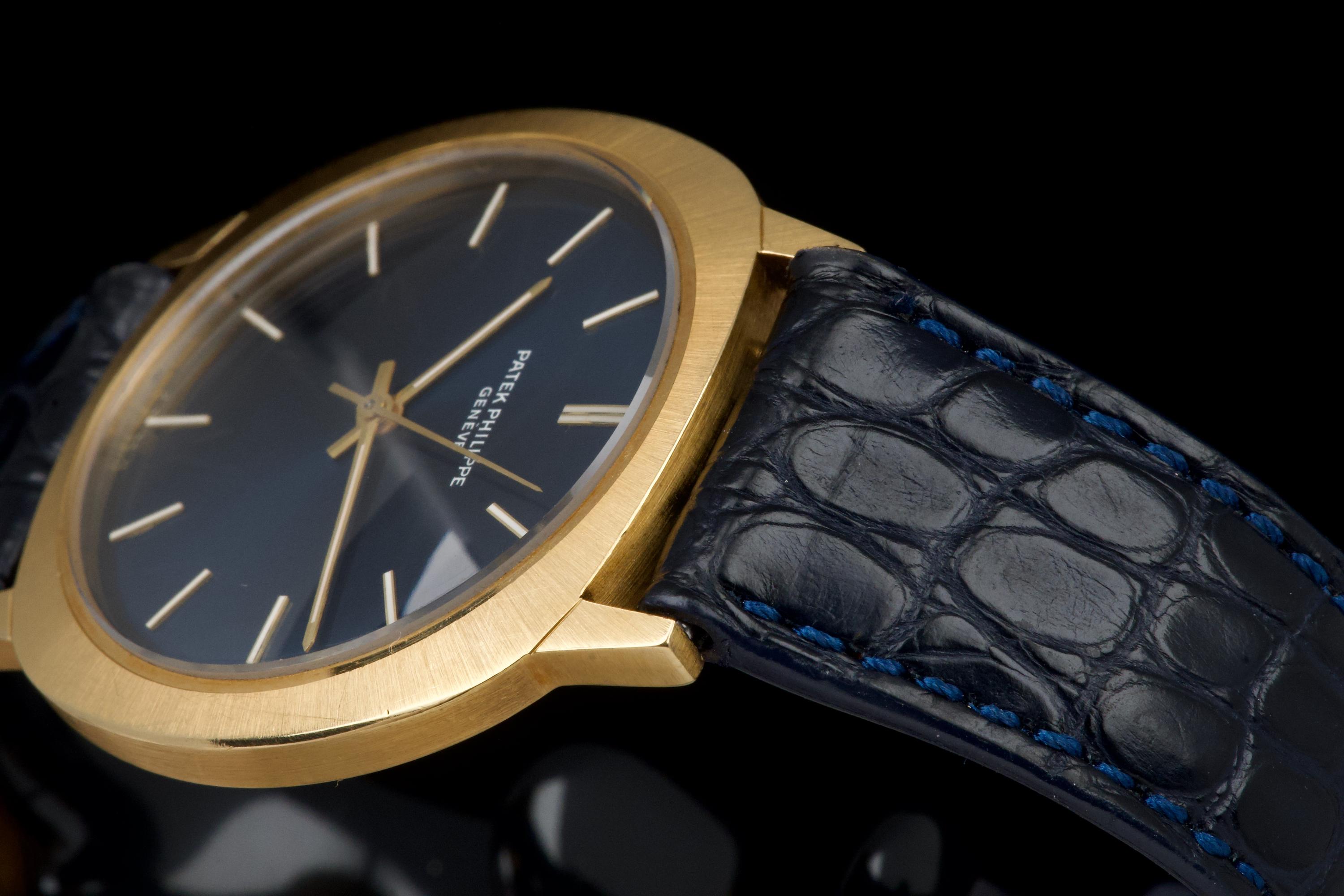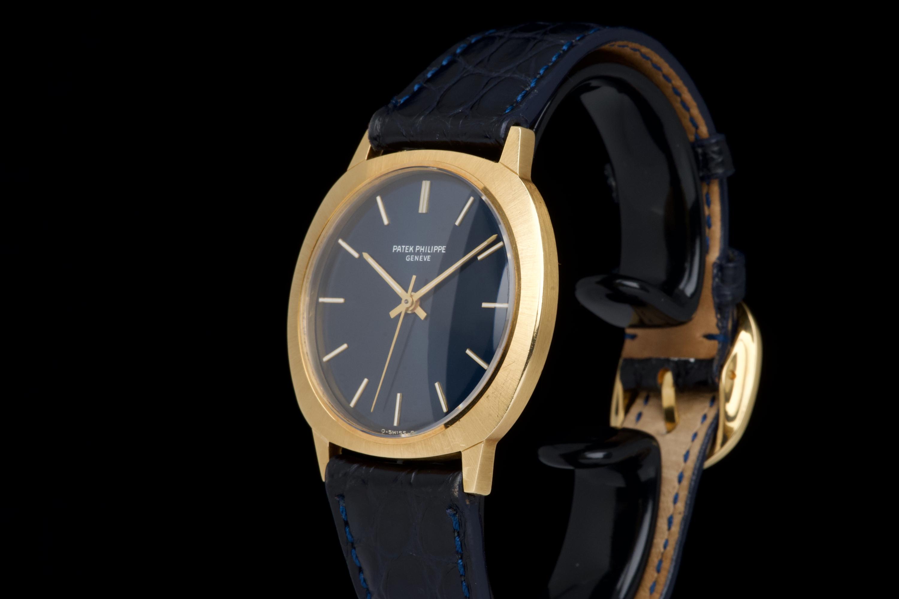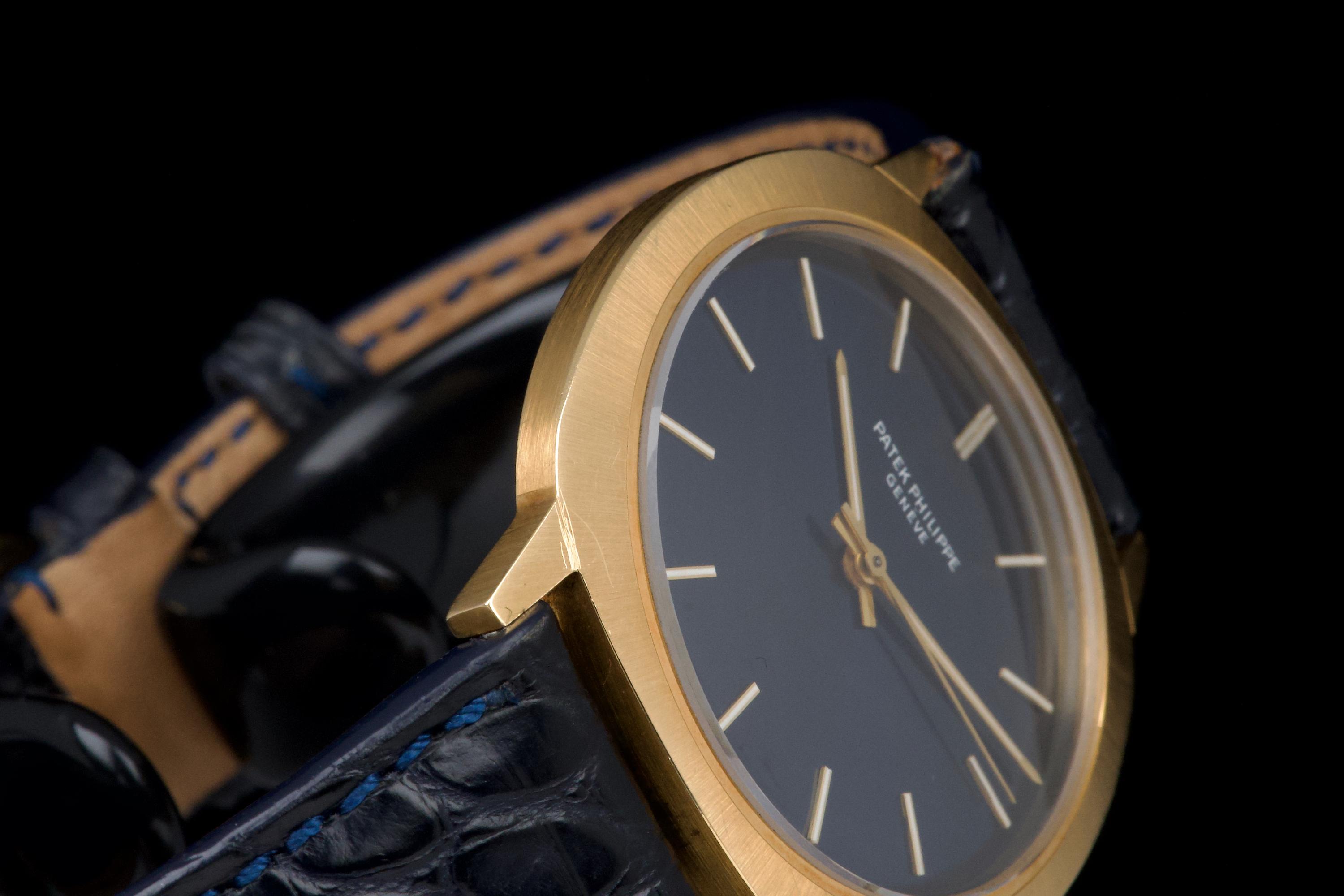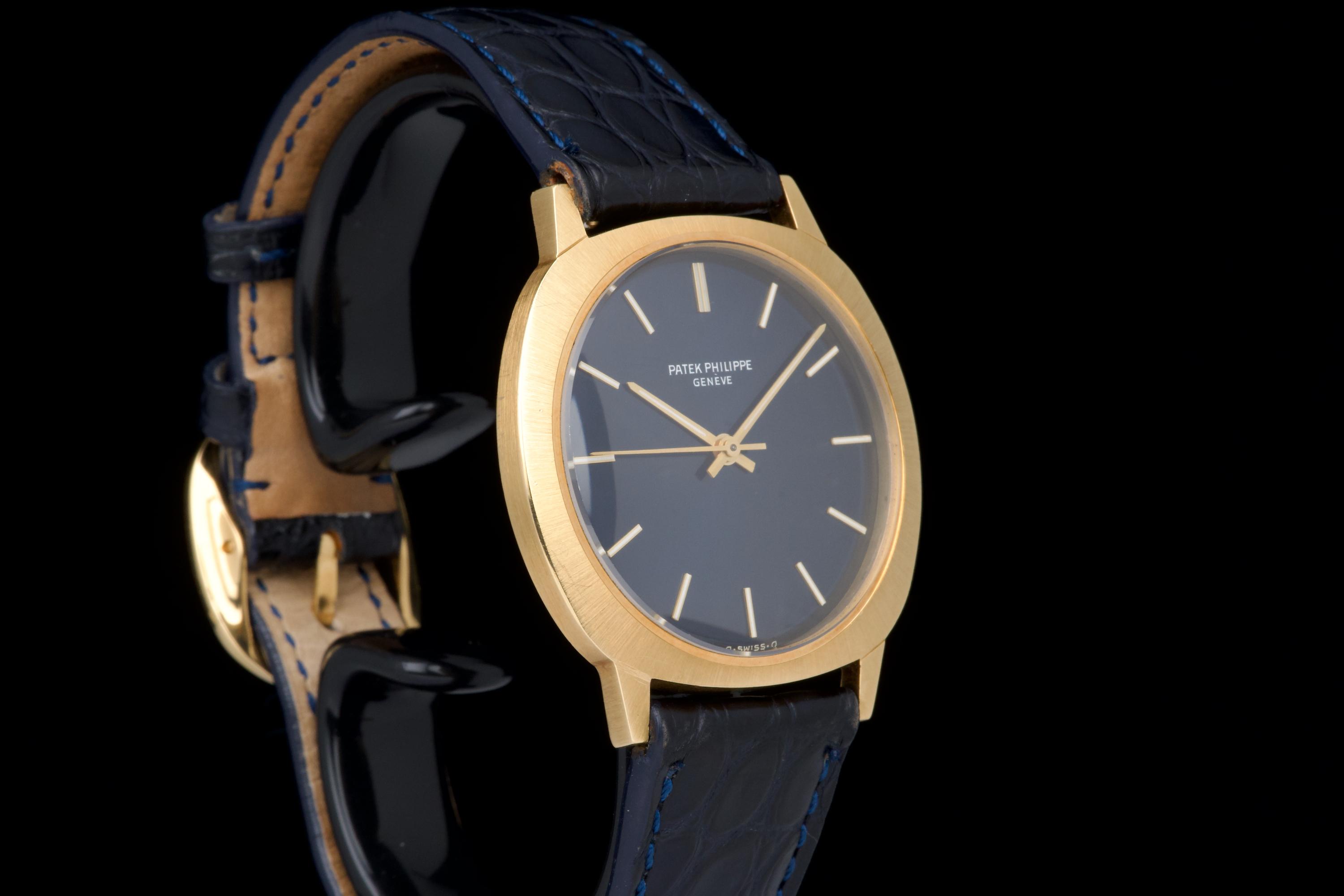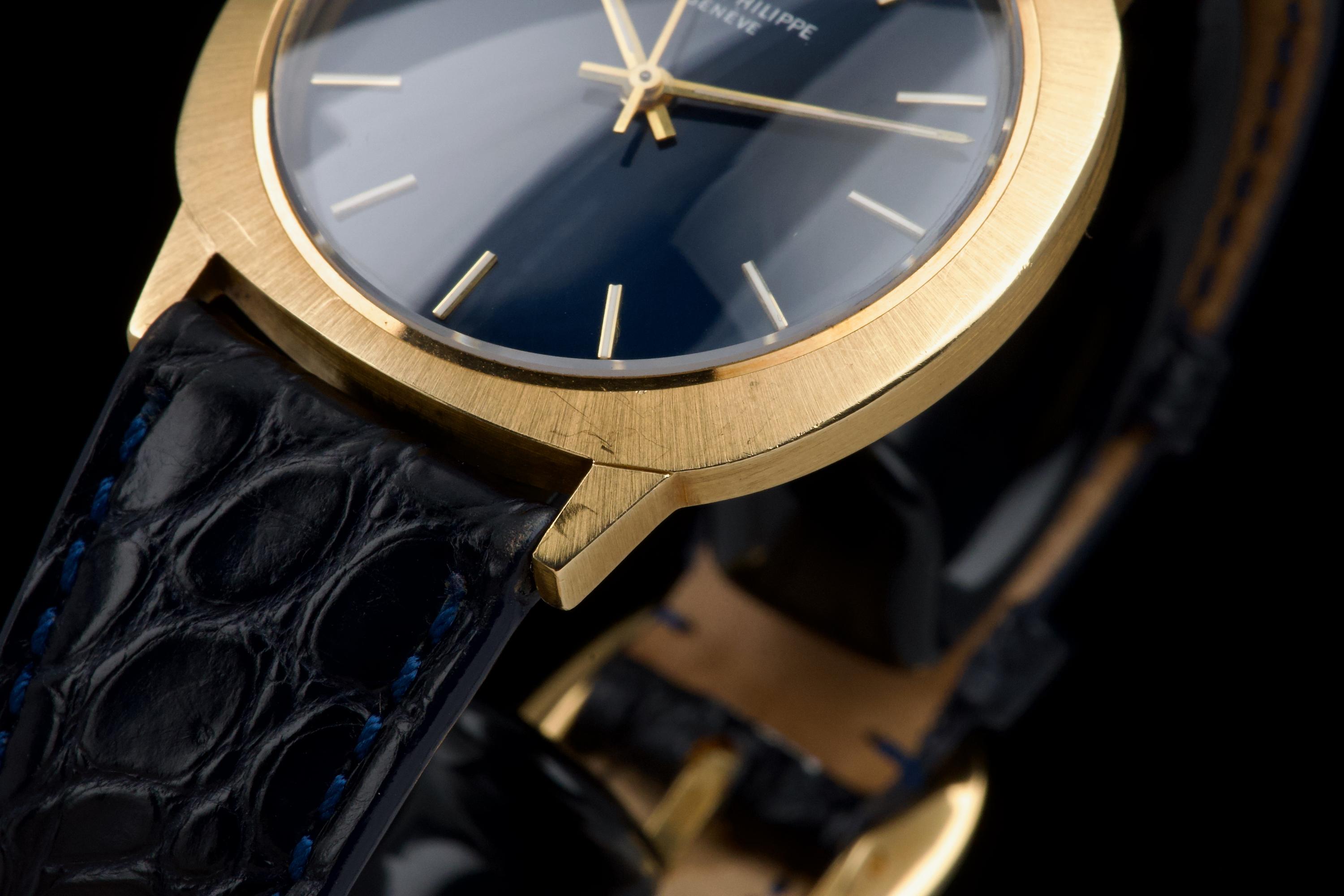 A very rare and elegant example of the Patek Philippe reference 3573, presented here in its most desirable configuration featuring a stunning blue sigma dial. The 36mm yellow-gold cushion-shaped case has been polished in the past but remains sharp, showing only light wear consistent with age. A particularly charming detail of this reference is its crown positioned on the caseback, giving the watch an exceptionally pure and minimalist profile on the wrist — a design hallmark of early 1970s Patek dress pieces. The watch is fitted with a navy blue crocodile strap (non-Patek) paired with an Ellipse-style buckle, complementing the dial beautifully. Although there is no documented service history, the movement has been checked and is functioning very well. A rare and refined vintage Patek in excellent overall condition, showcasing one of the most attractive dial and case combinations of the era.