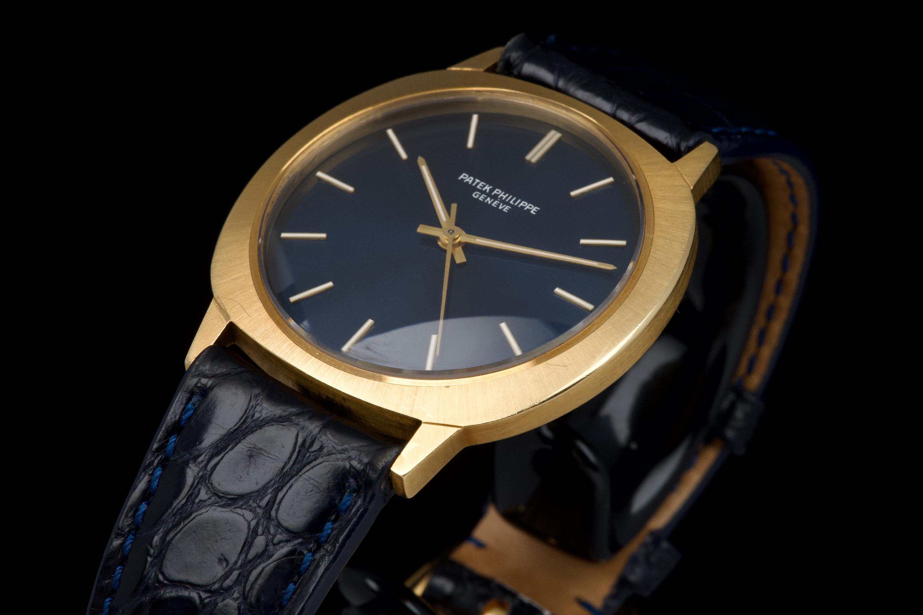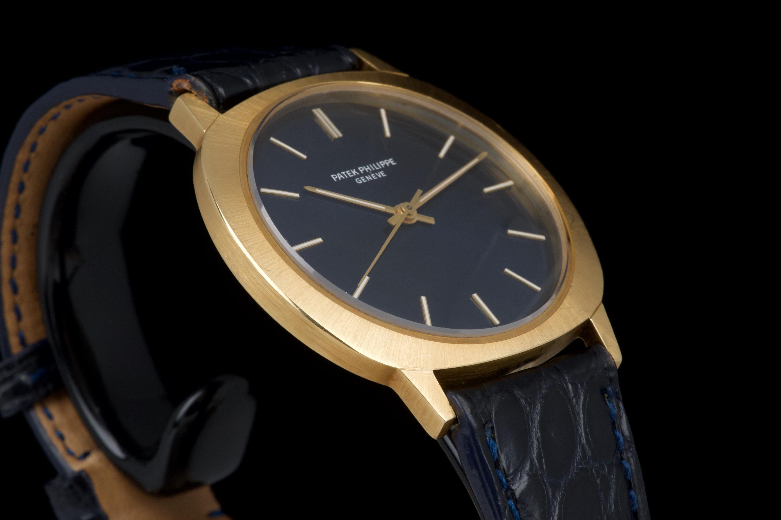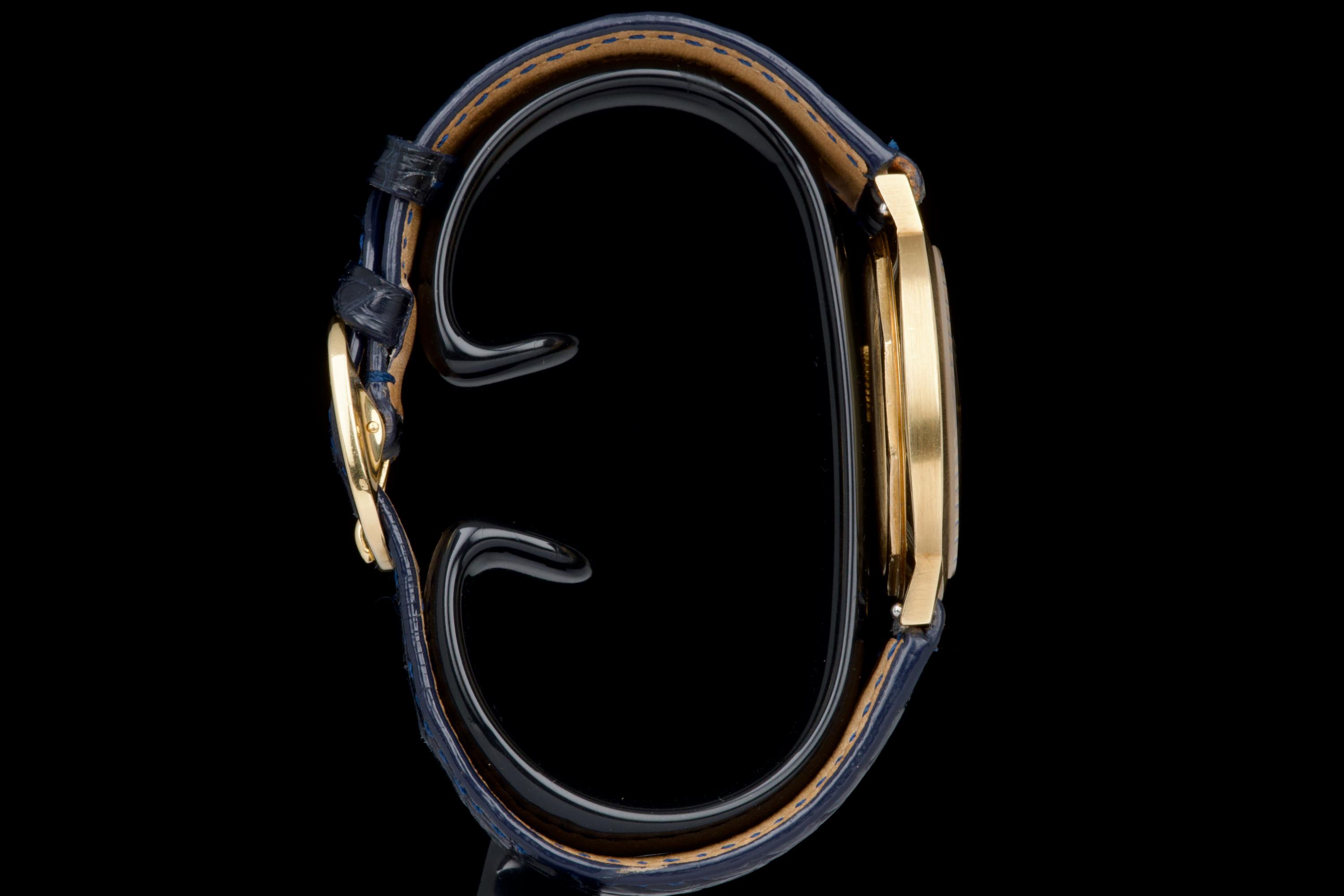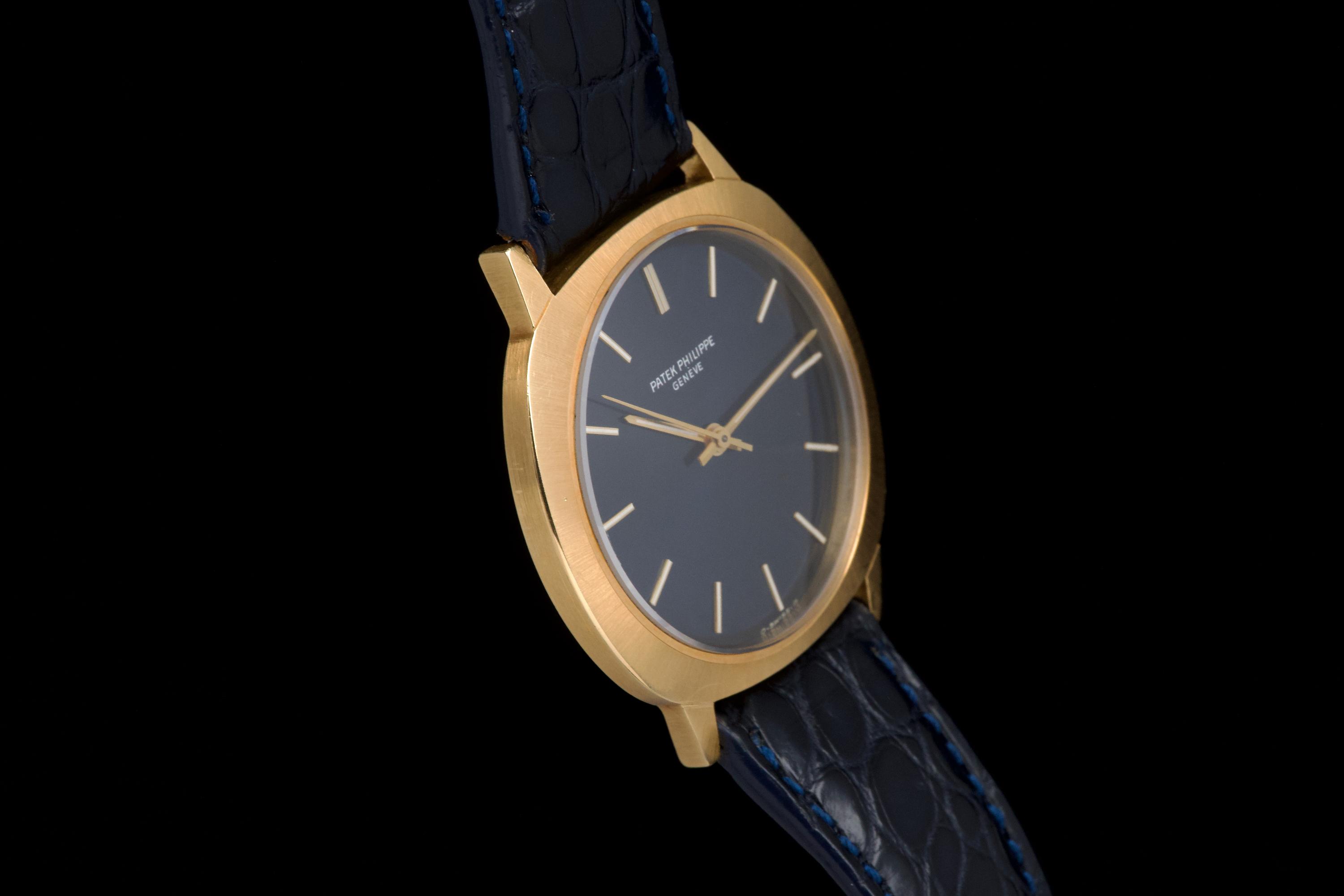 A very rare and elegant example of the Patek Philippe reference 3573, presented here in its most desirable configuration featuring a stunning blue sigma dial. The 36mm yellow-gold cushion-shaped case has been polished in the past but remains sharp, showing only light wear consistent with age. A particularly charming detail of this reference is its crown positioned on the caseback, giving the watch an exceptionally pure and minimalist profile on the wrist — a design hallmark of early 1970s Patek dress pieces. The watch is fitted with a navy blue crocodile strap (non-Patek) paired with an Ellipse-style buckle, complementing the dial beautifully. Although there is no documented service history, the movement has been checked and is functioning very well. A rare and refined vintage Patek in excellent overall condition, showcasing one of the most attractive dial and case combinations of the era.